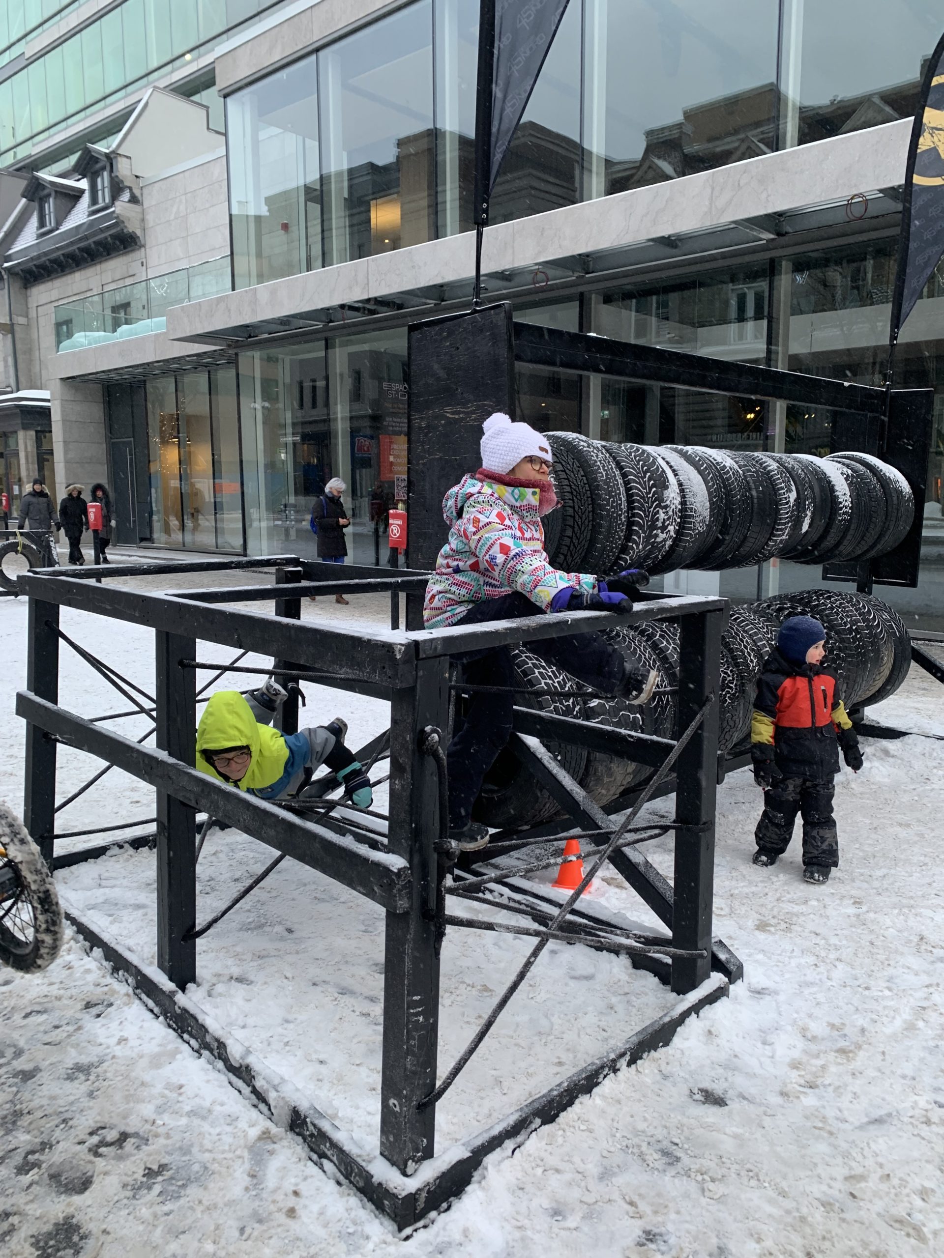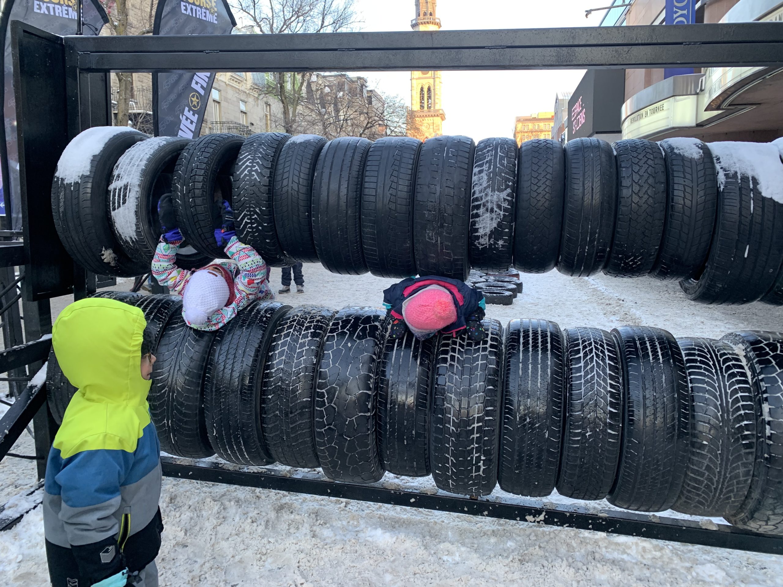 Un peu plus bas dans la rue, nous avons testé un petit mur d’escalade, ainsi qu’un parcours de pneus.