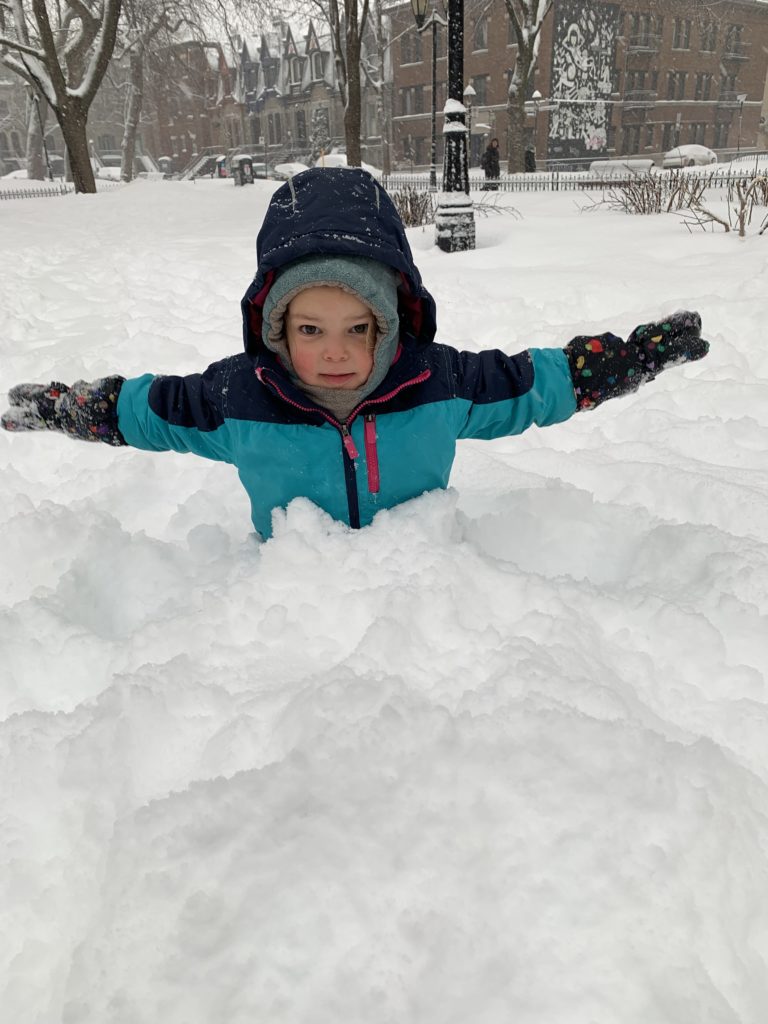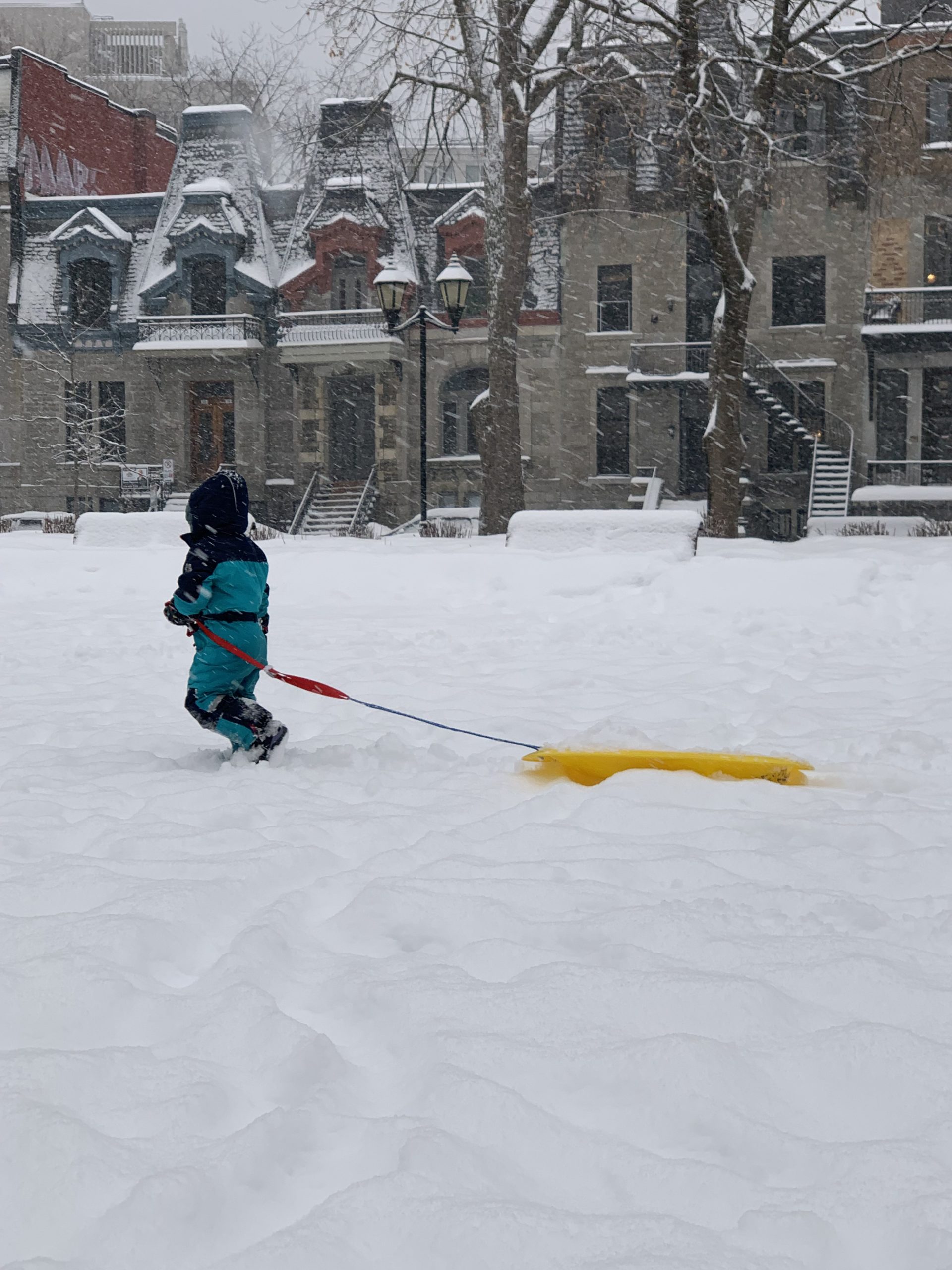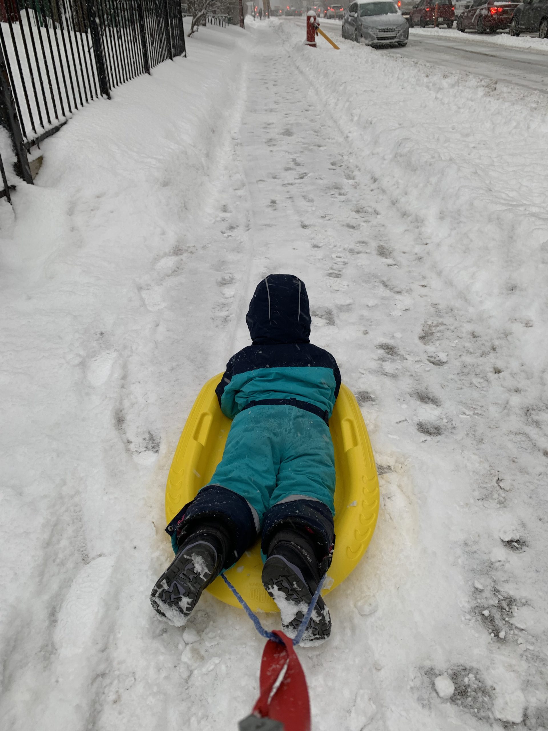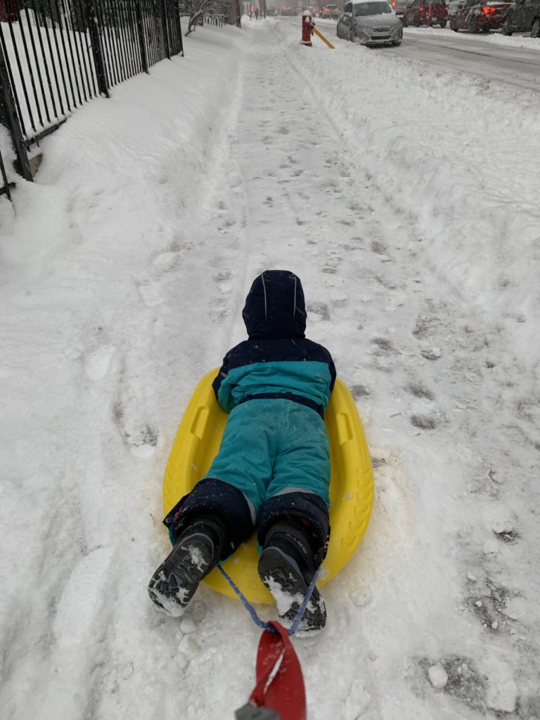 Jolie bordée de neige mardi. La dernière de la saison ? Émile, Lucie et moi étions à la médiathèque, et Odile a fait ses trajets pour la garderie en luge.