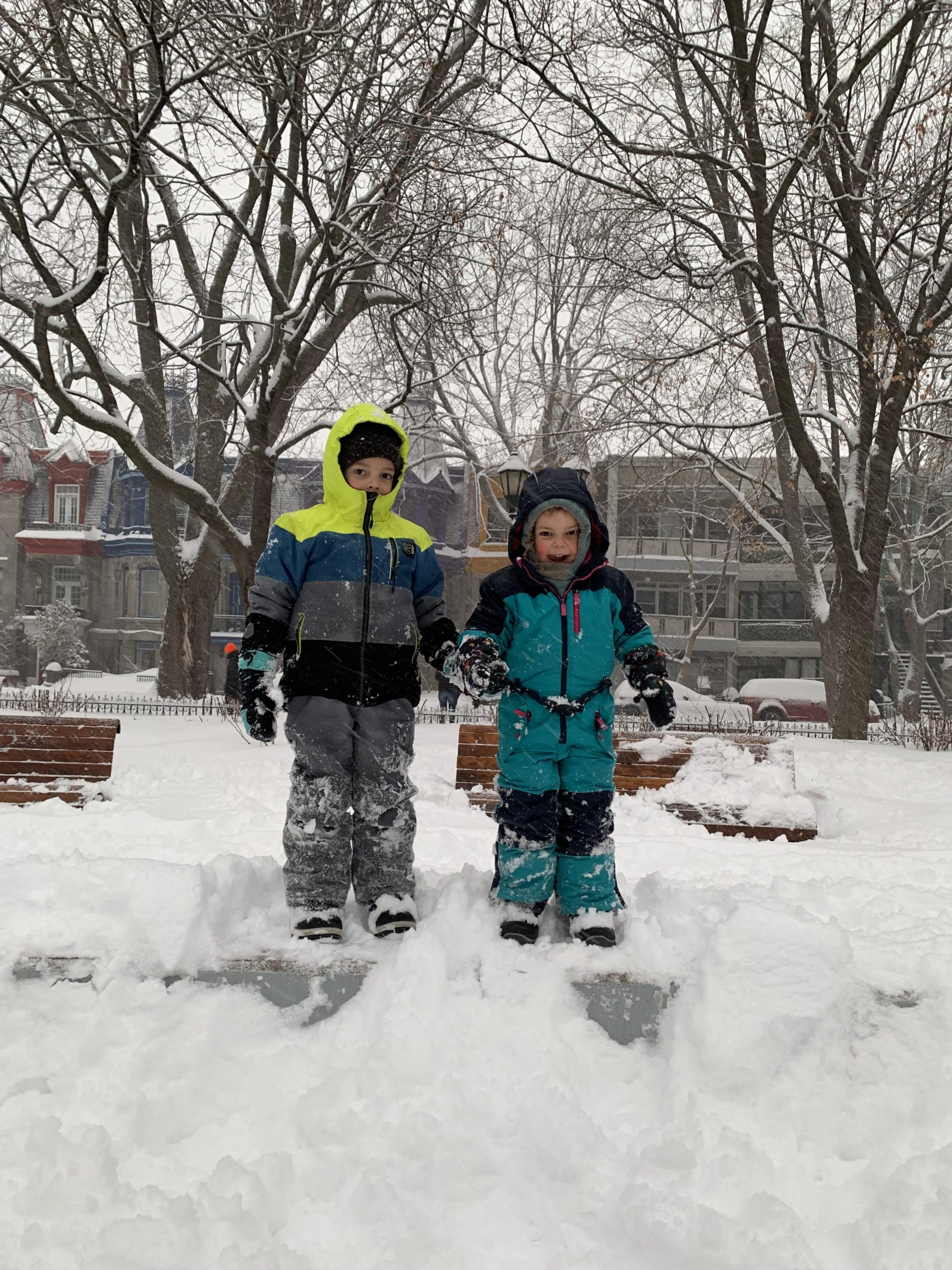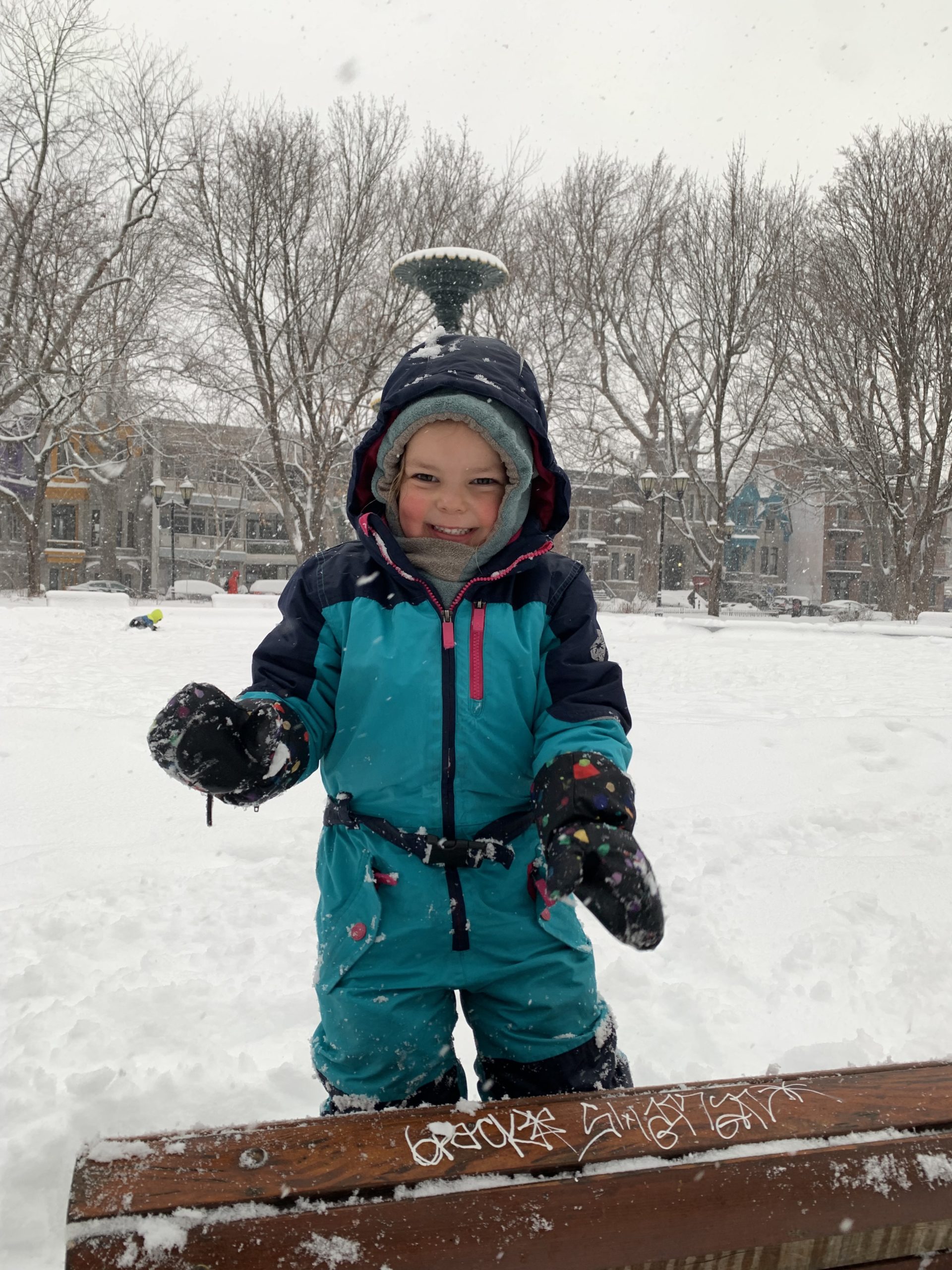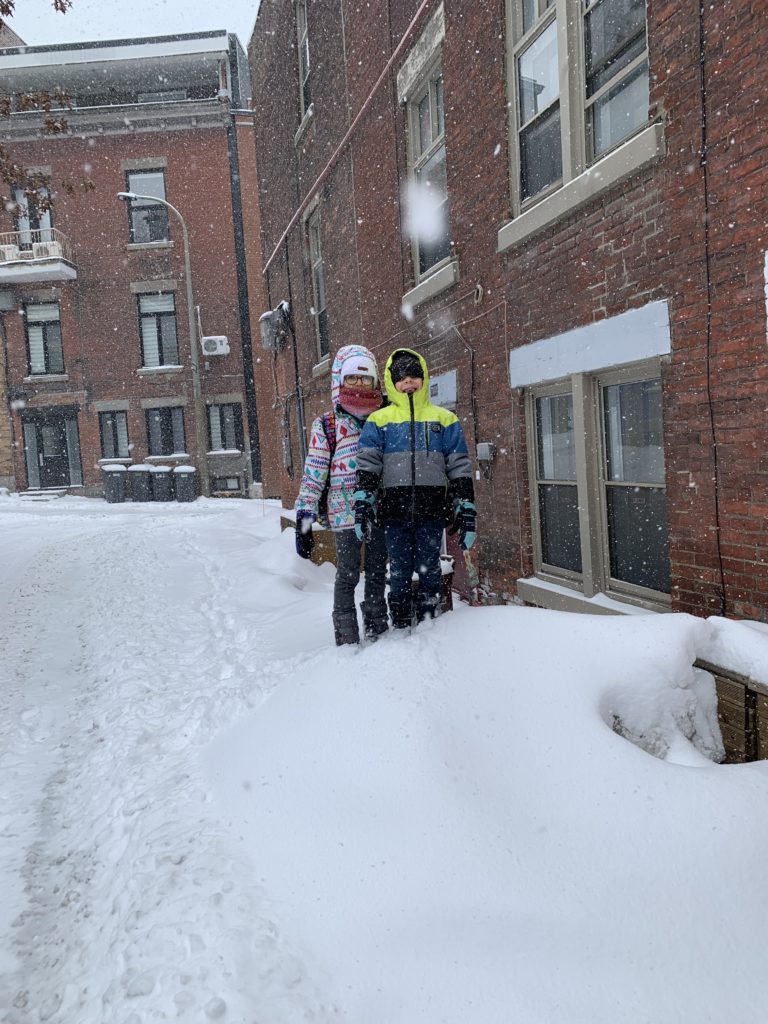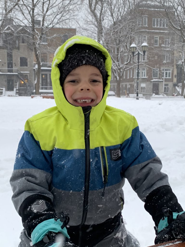 Jolie bordée de neige mardi. La dernière de la saison ? Émile, Lucie et moi étions à la médiathèque, et Odile a fait ses trajets pour la garderie en luge.