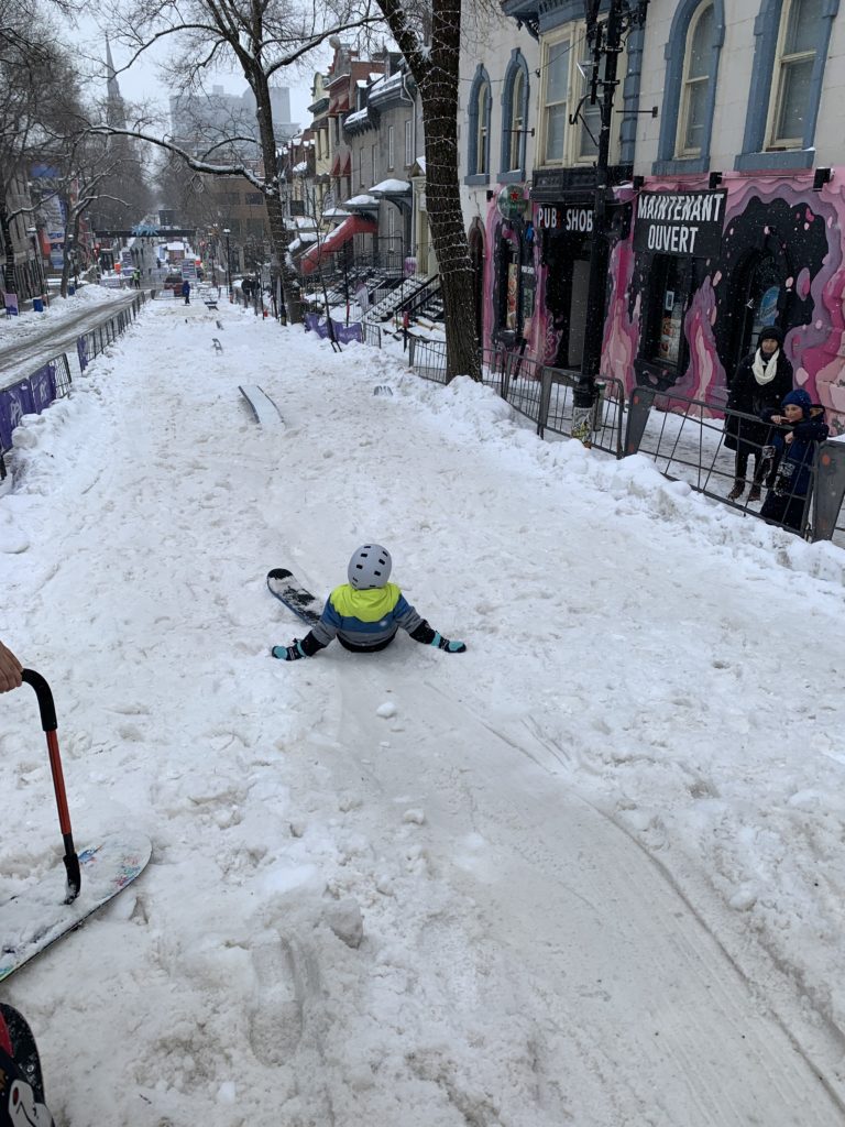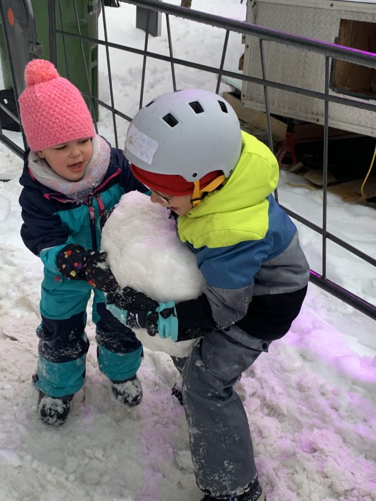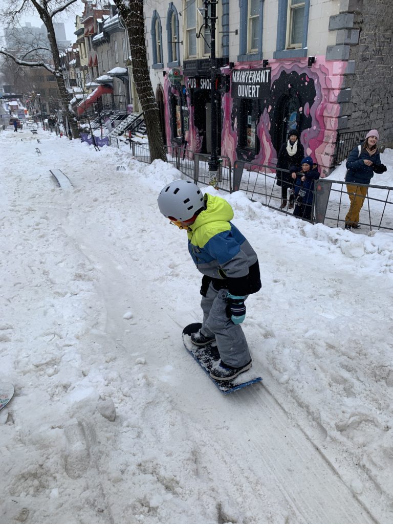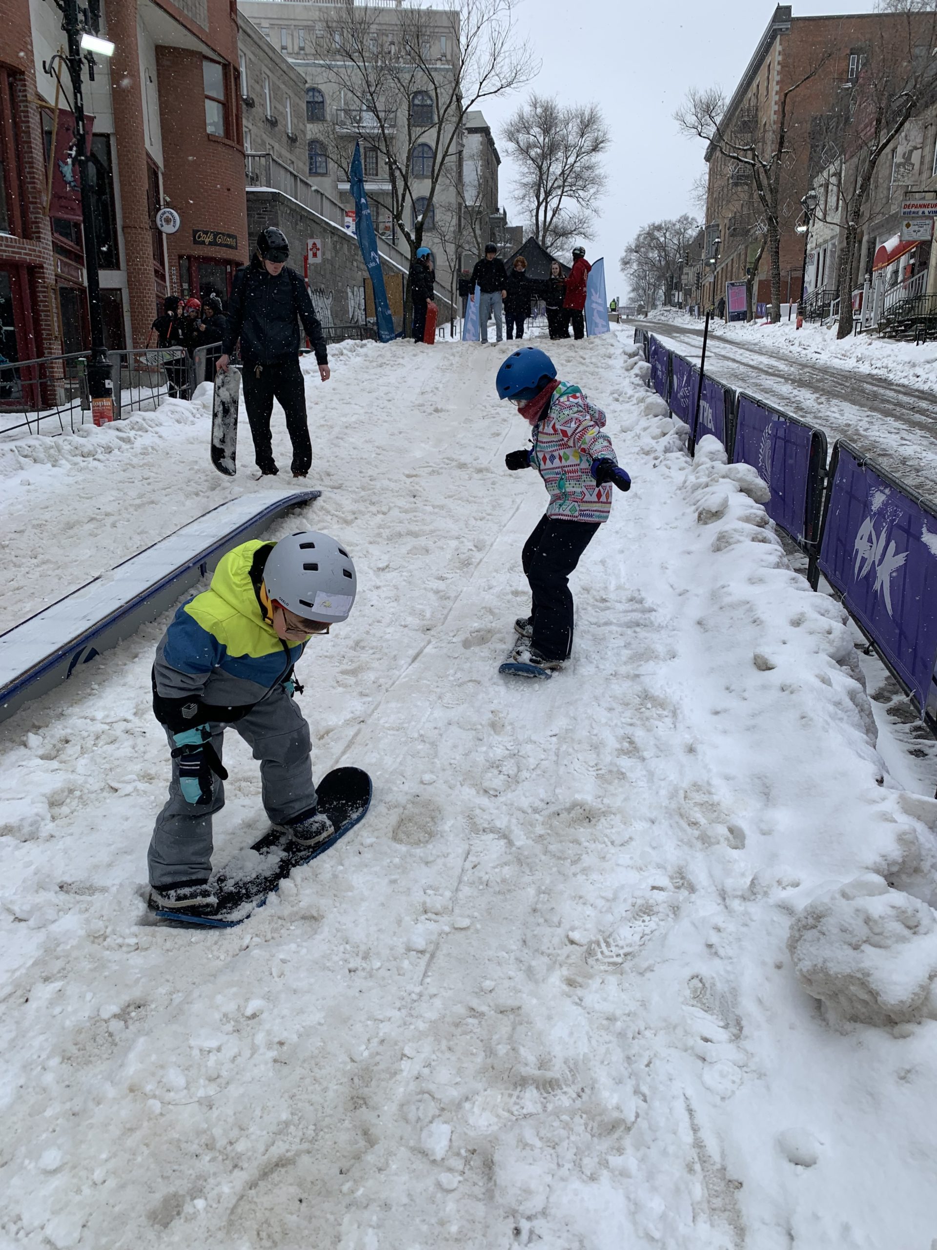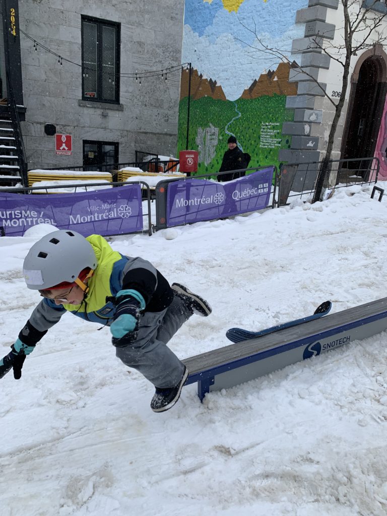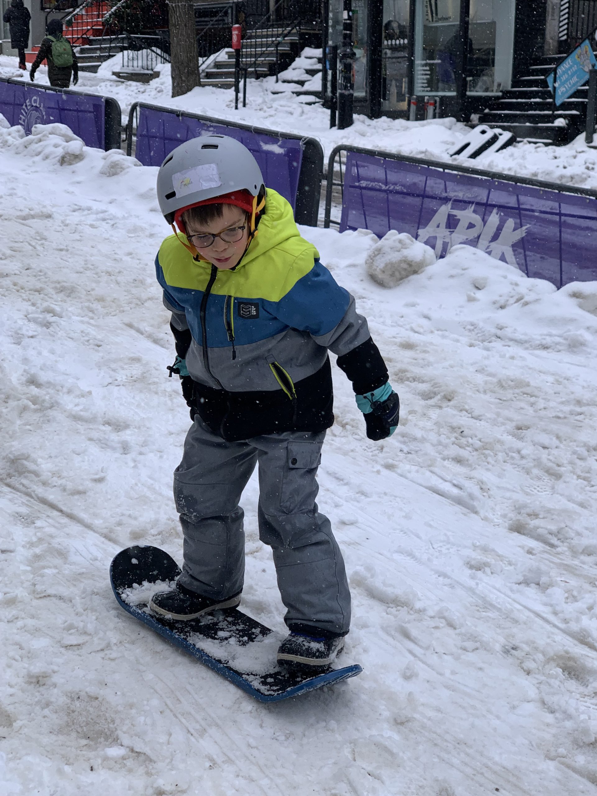 Le festival Apik s’est transformé pour devenir accessible à tous. Lucie et Émile ont pu tester le snowskate. Une planche sur laquelle ils se tiennent debout sans accrocher les pieds. La neige était très collante, ils n’ont pas du tout pu prendre de vitesse, mais du coup contrôlaient bien la planche, jusqu’à ce qu’elle s’arrête contre un tas de neige 🙂 Une belle découverte !