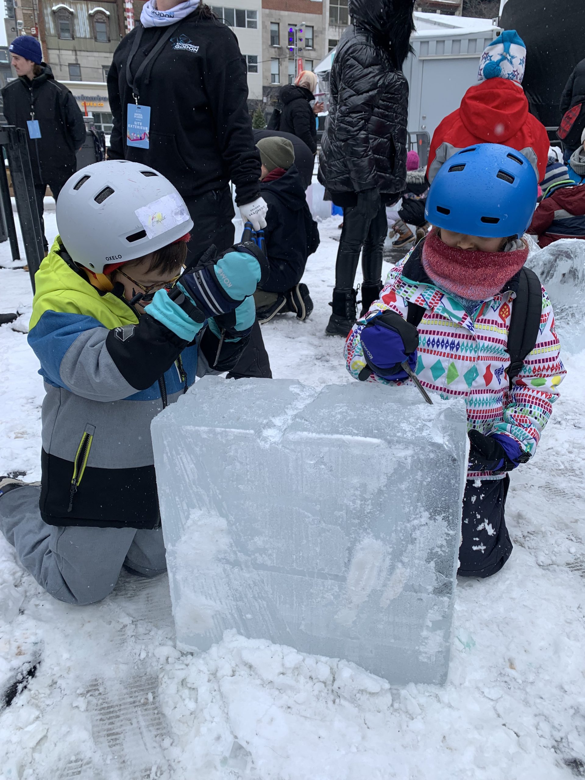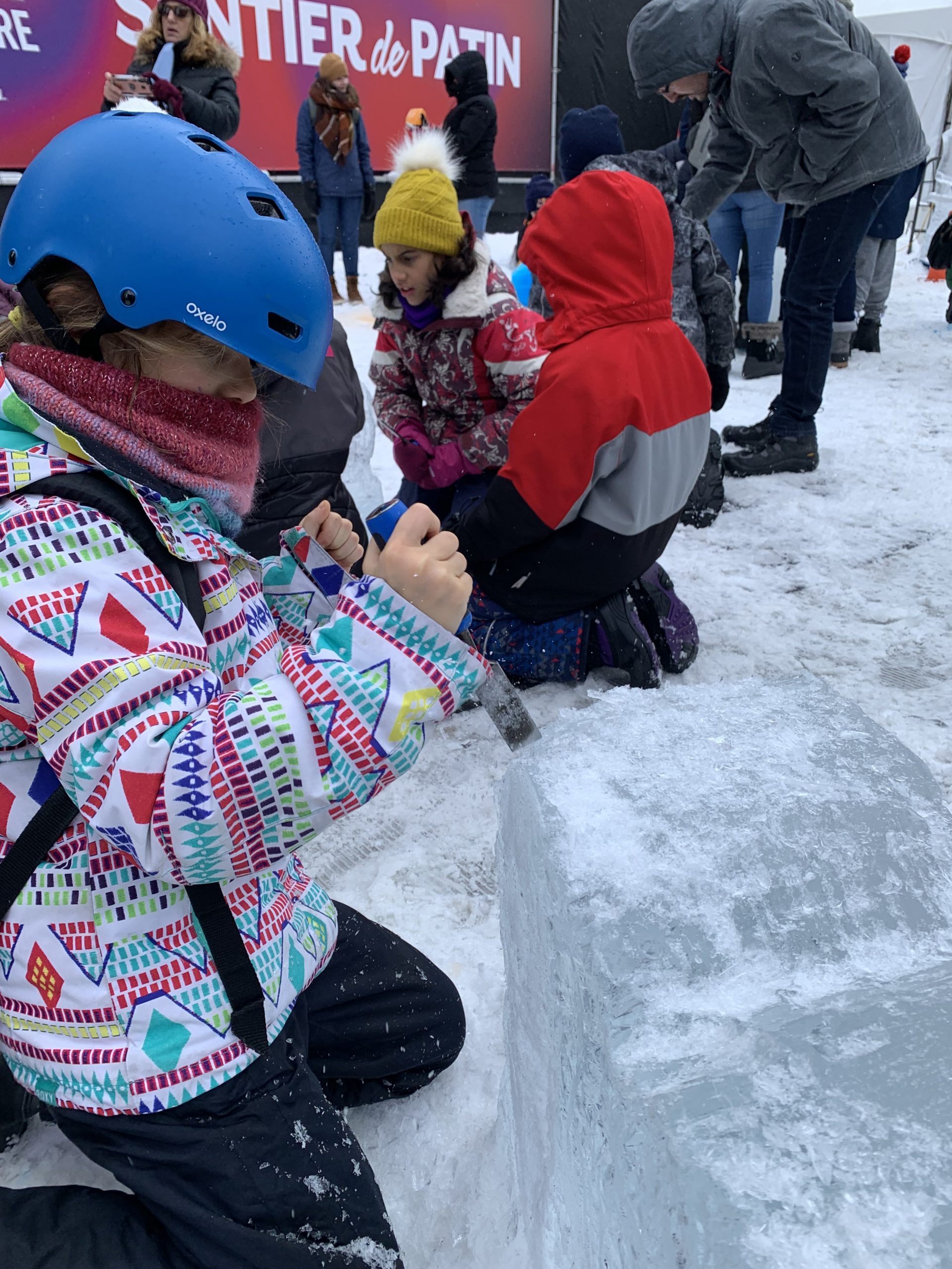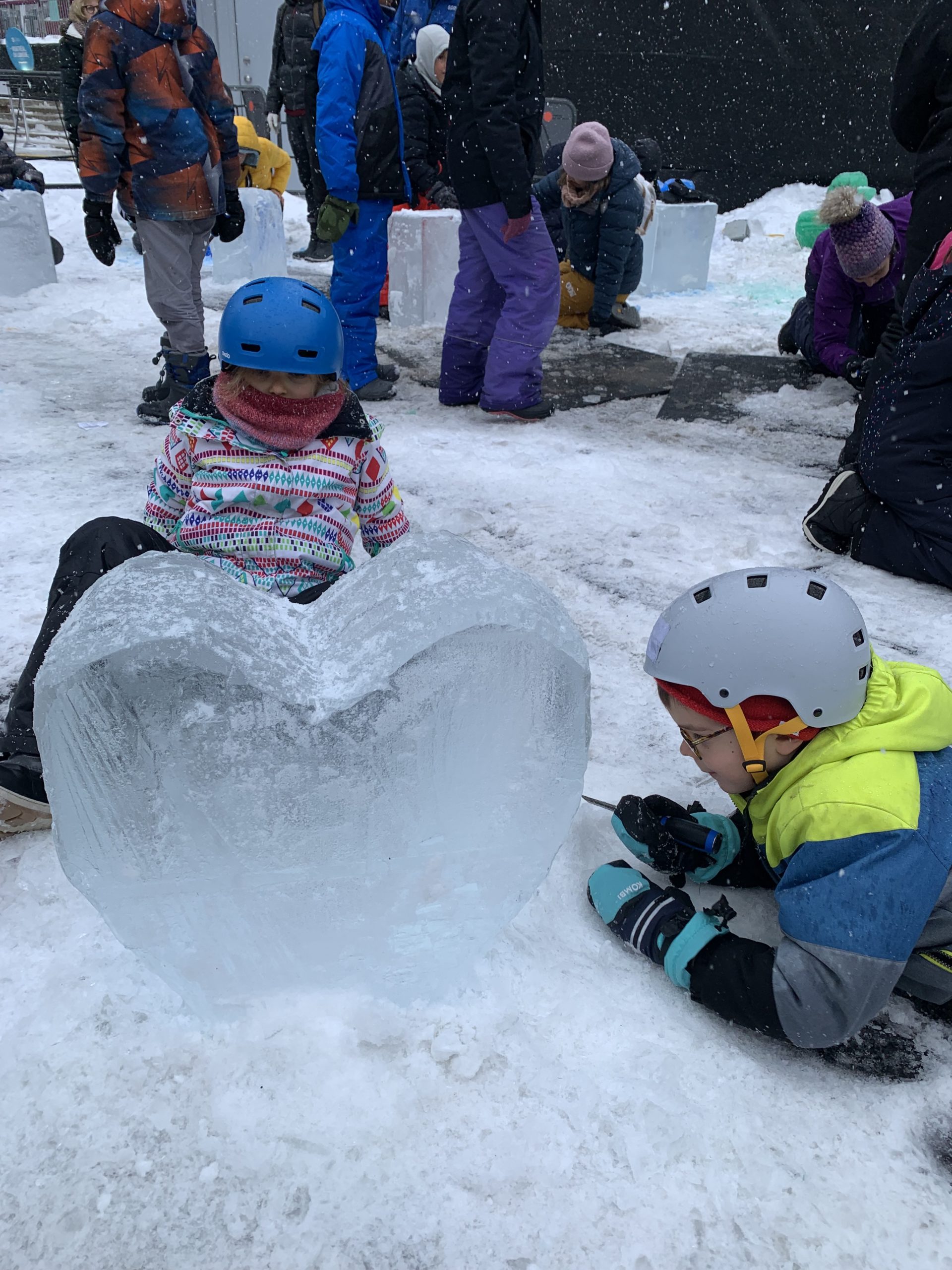Nous avons ensuite fait une sculpture sur glace. Partis d’un parallélépipède, nous avons pris environ 1 heure pour sculpter un coeur à l’aide des deux couteaux prêtés. La température était idéale, car la glace se modelait comme du beurre !