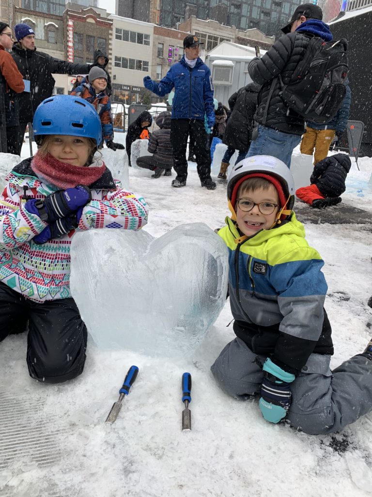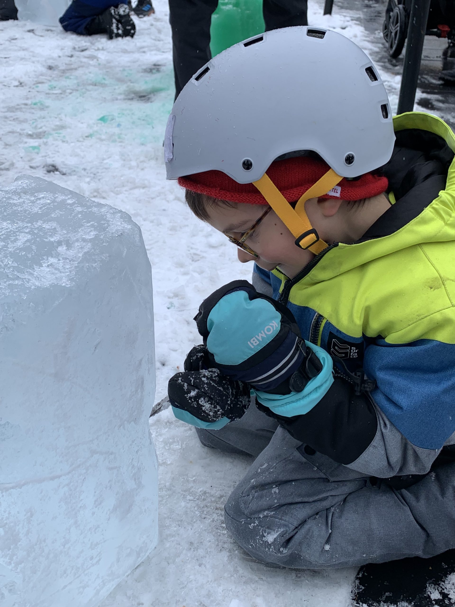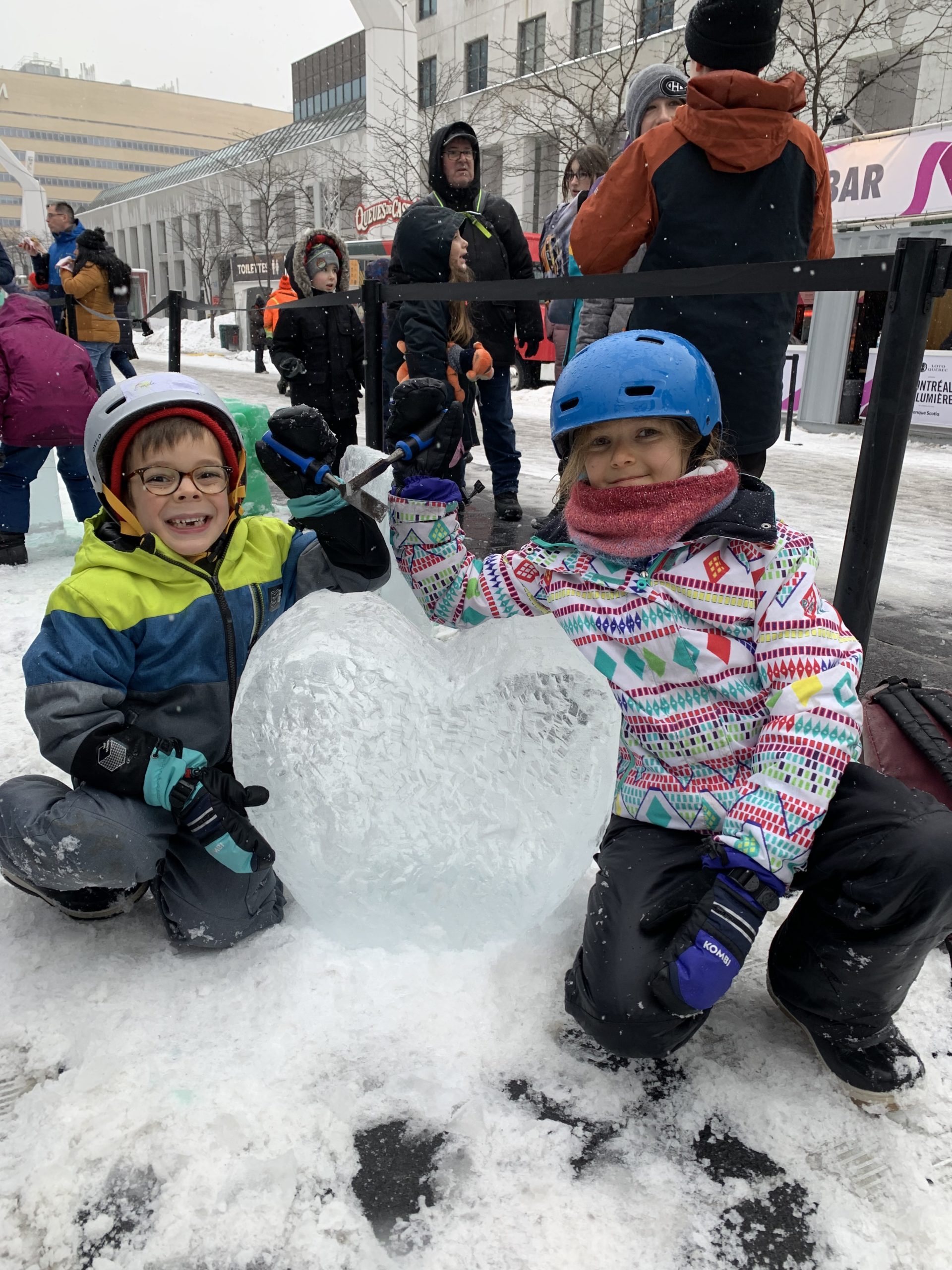 Nous avons ensuite fait une sculpture sur glace. Partis d’un parallélépipède, nous avons pris environ 1 heure pour sculpter un coeur à l’aide des deux couteaux prêtés. La température était idéale, car la glace se modelait comme du beurre !
