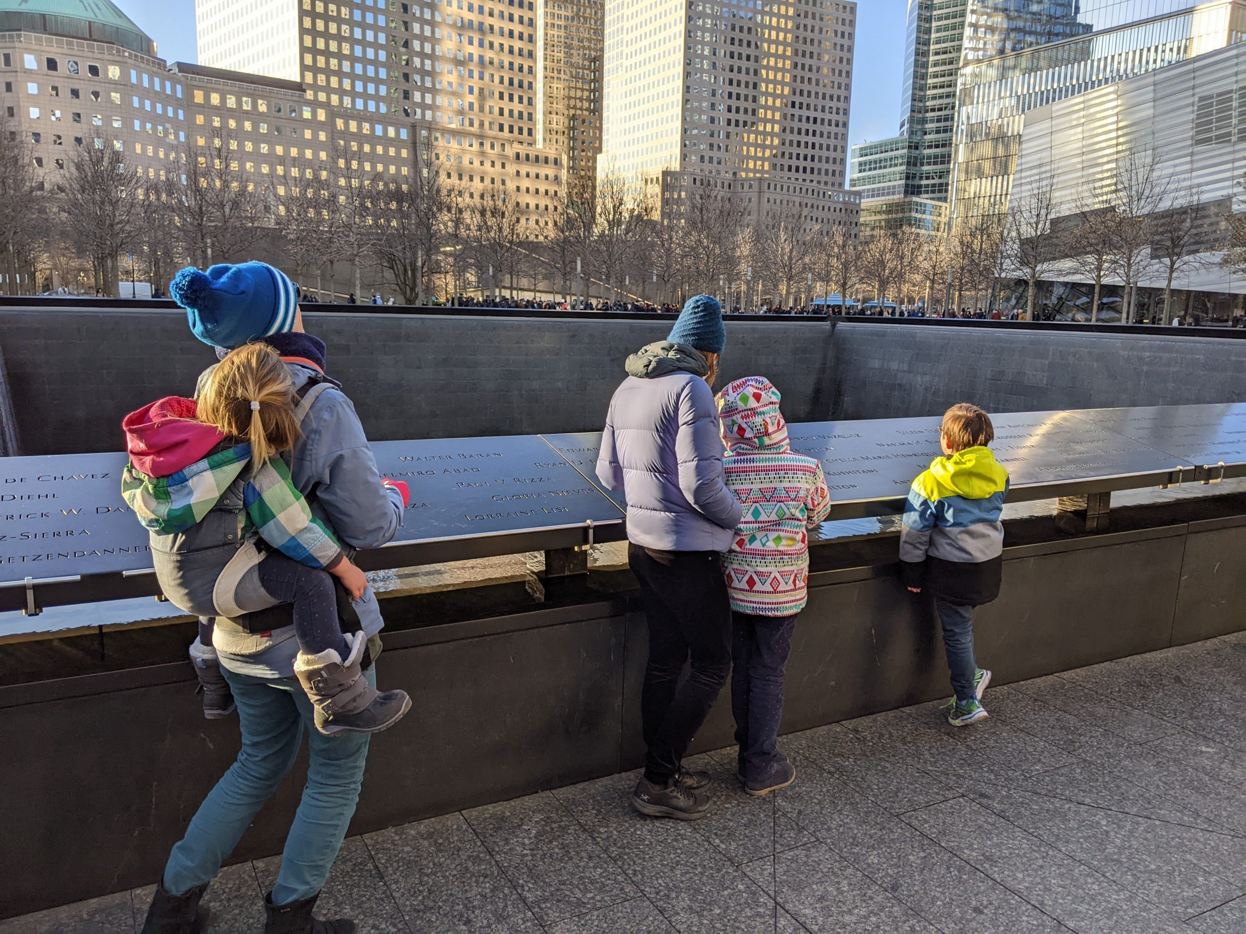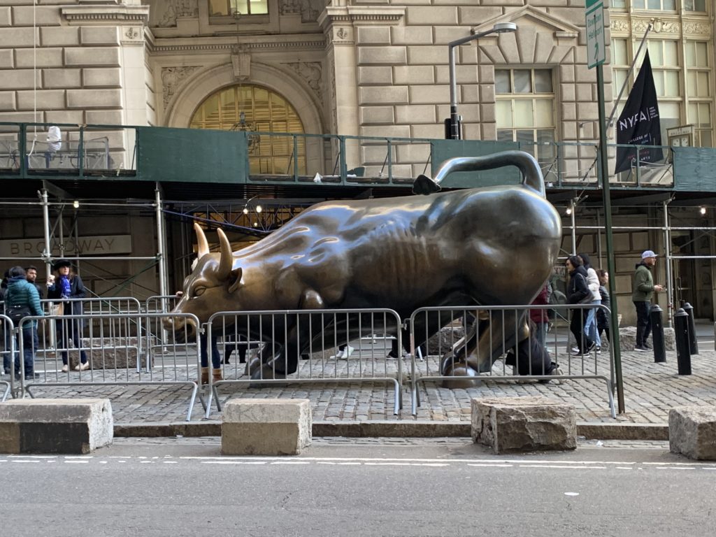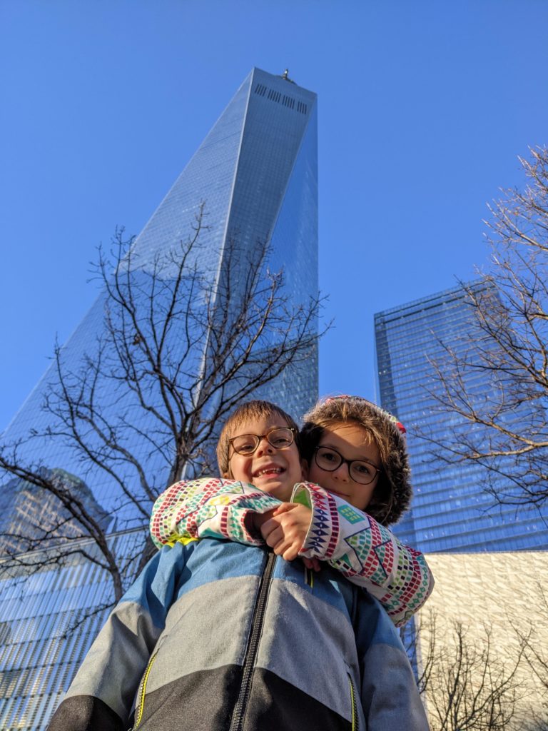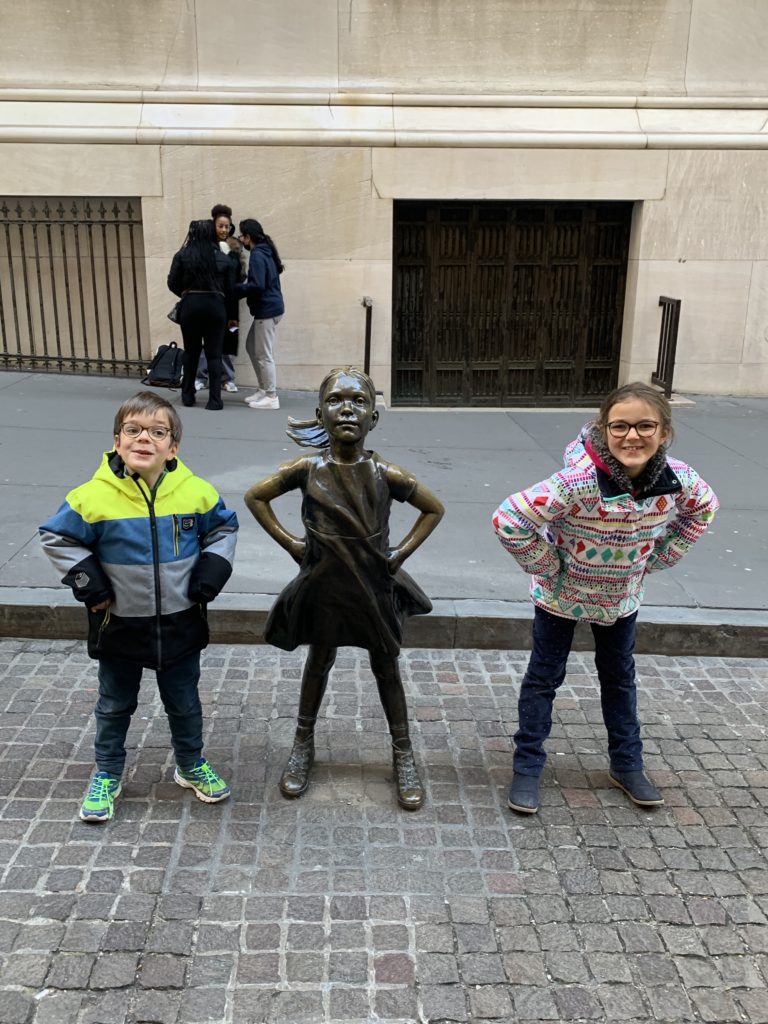 Une fois revenus à Manhattan, nous avons un peu marché dans le Financial District : sur Wall Street, chercher les statues du taureau et de la petite fille, puis jusqu’au World Trade Center. Odile a à nouveau dormi sur mon dos.