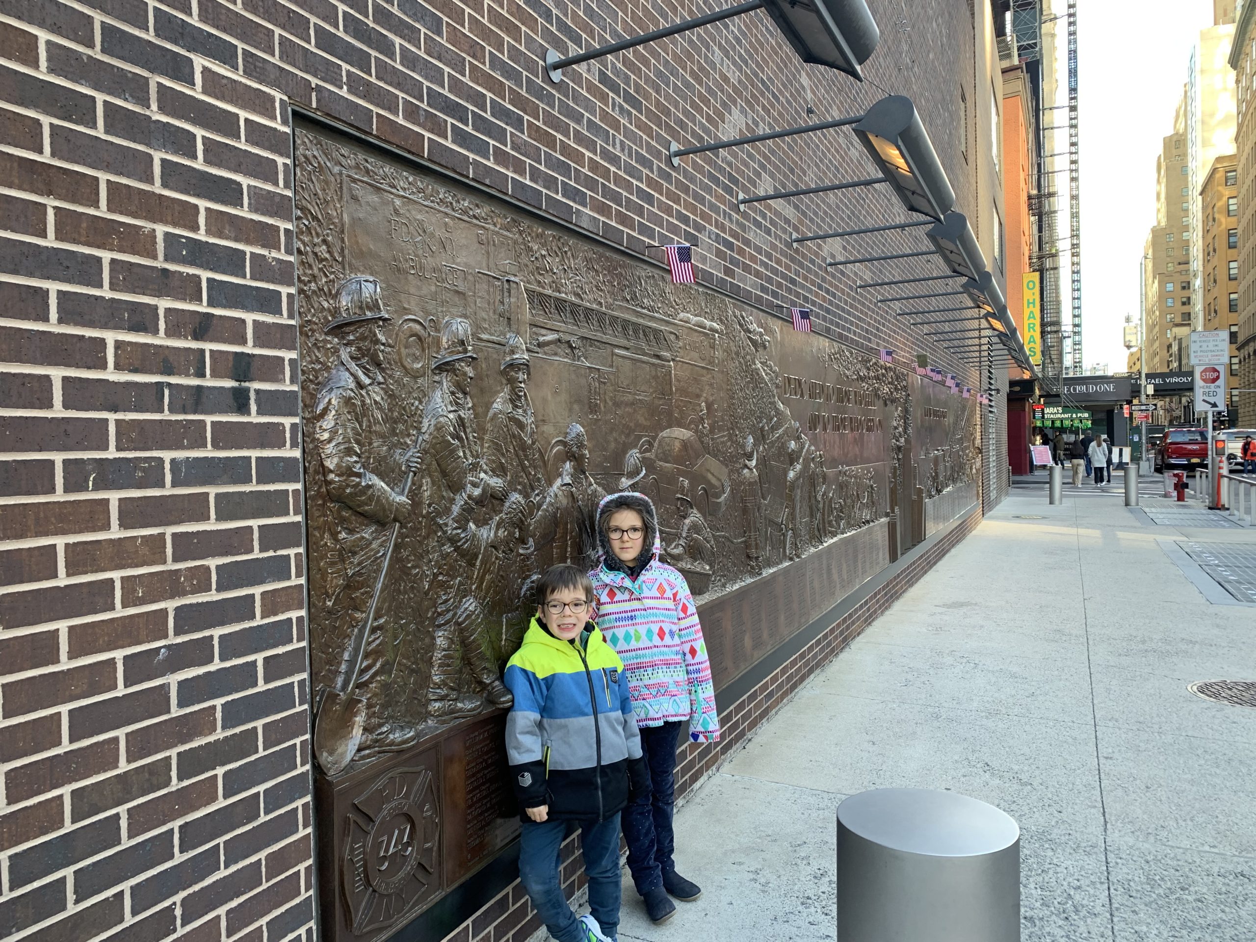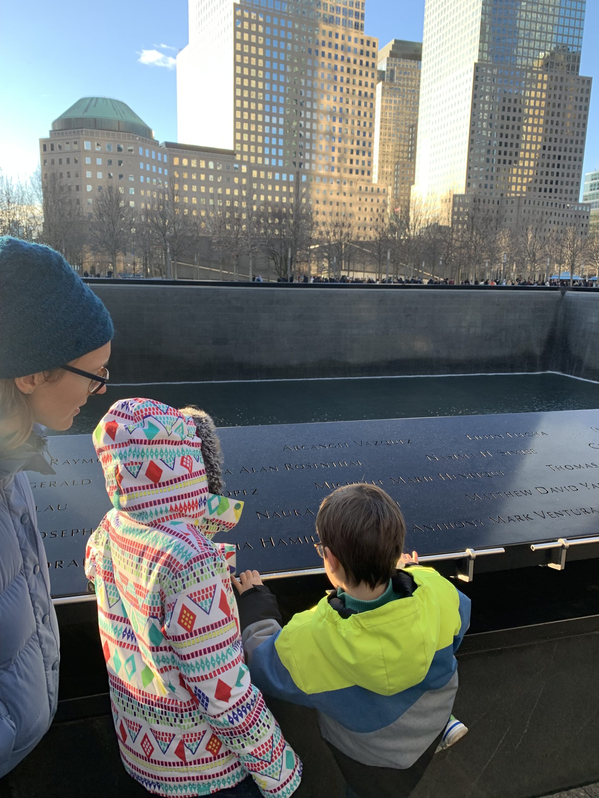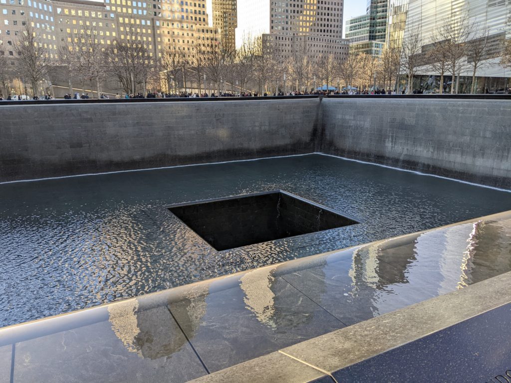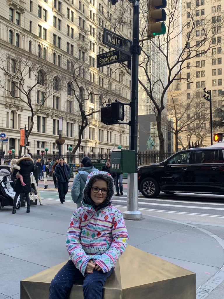 Une fois revenus à Manhattan, nous avons un peu marché dans le Financial District : sur Wall Street, chercher les statues du taureau et de la petite fille, puis jusqu’au World Trade Center. Odile a à nouveau dormi sur mon dos.