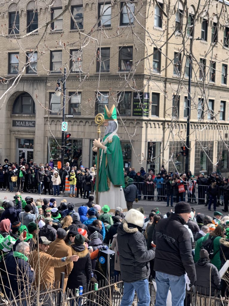 Nous sommes allés voir le défilé de la Saint Patrick ce midi. Il y avait beaucoup de vert, bien sûr, des fanfares avec de nombreuses cornemuses, et plusieurs chars bien décorés. Les enfants ont bien aimé, si ce n’est qu’il a fait particulièrement froid (-6°C environ), et que nous étions un peu sous-équipés ! Oups !