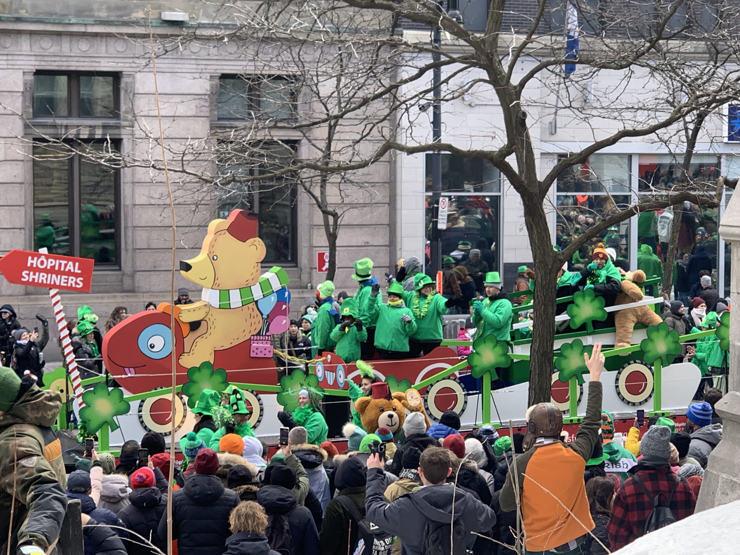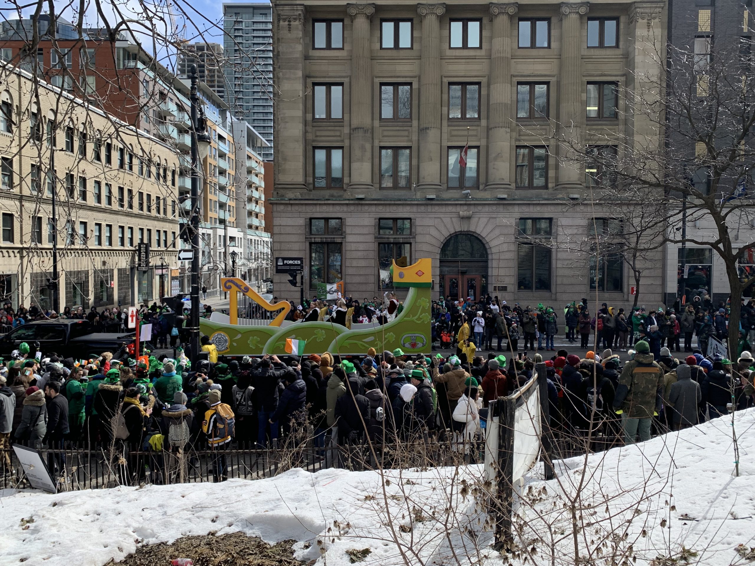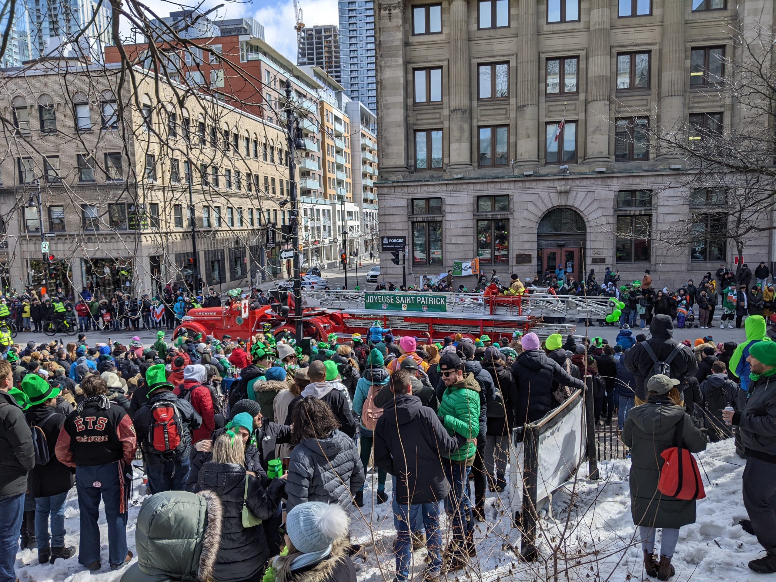 Nous sommes allés voir le défilé de la Saint Patrick ce midi. Il y avait beaucoup de vert, bien sûr, des fanfares avec de nombreuses cornemuses, et plusieurs chars bien décorés. Les enfants ont bien aimé, si ce n’est qu’il a fait particulièrement froid (-6°C environ), et que nous étions un peu sous-équipés ! Oups !