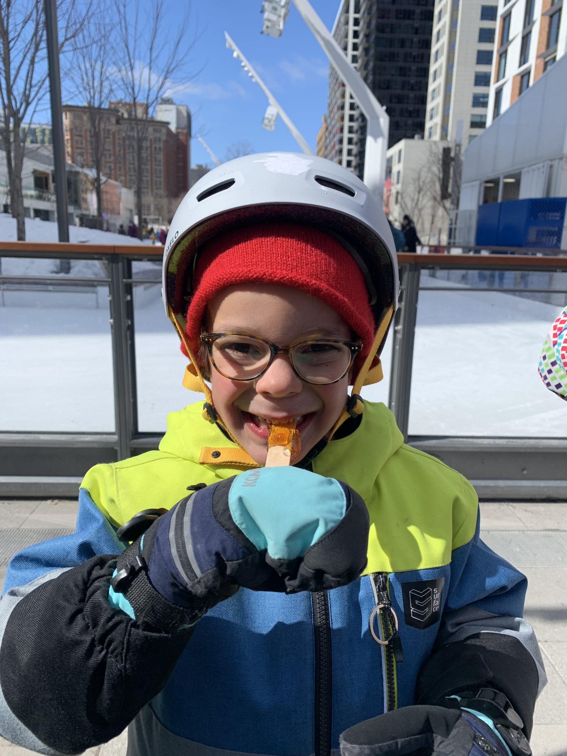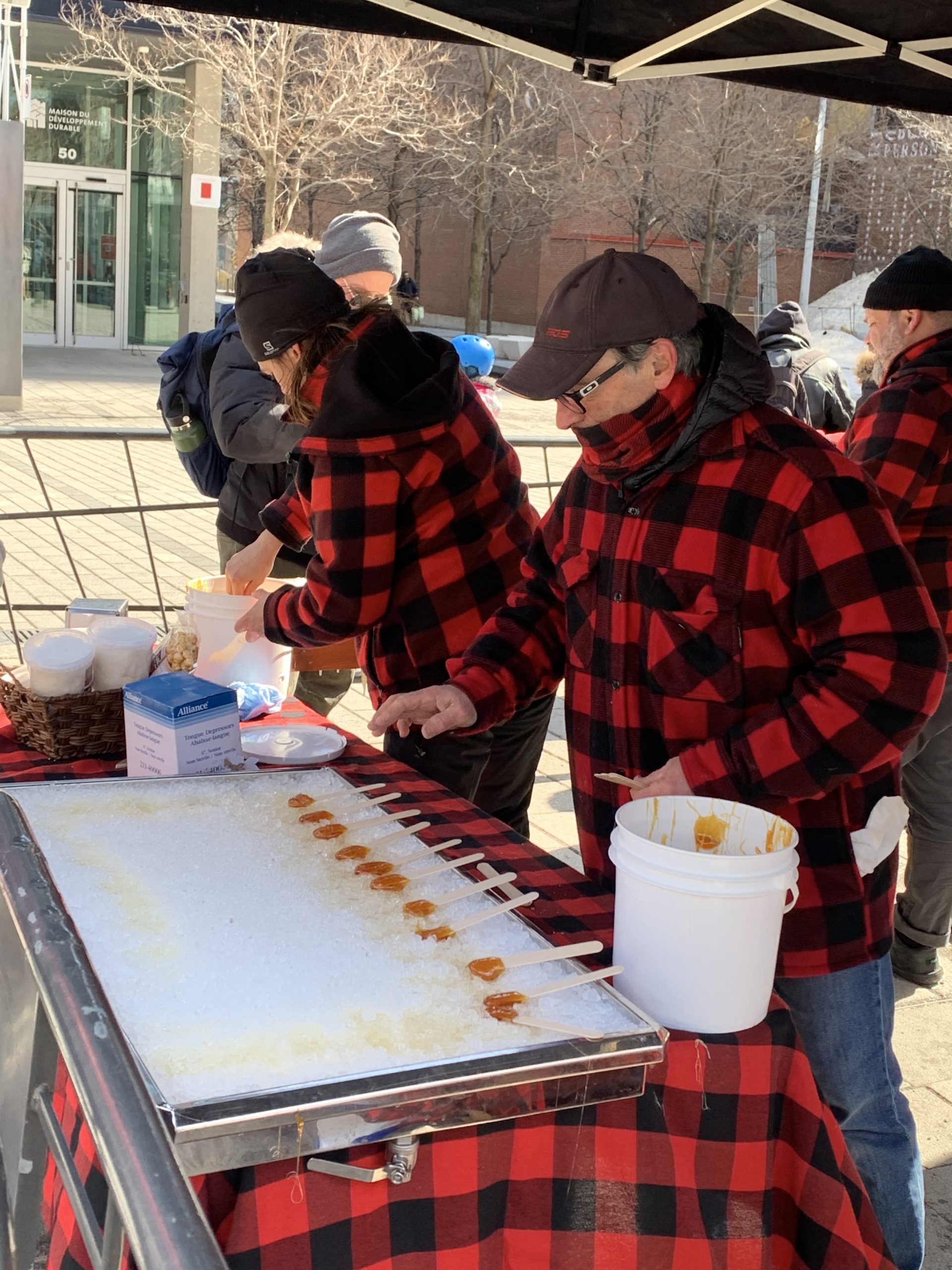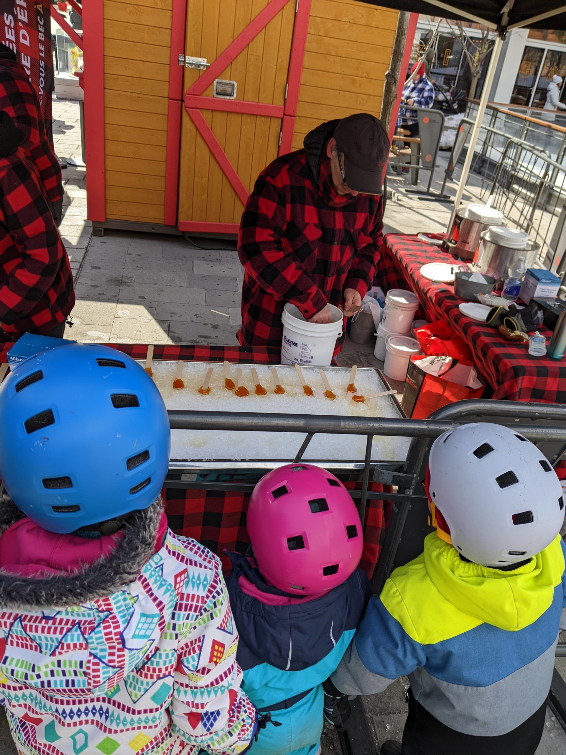 En rentrant, nous sommes repassés rapidement à l’esplanade Tranquille, et nous avons pu avoir des sucettes de tire d’érable ! C’est du sirop d’érable épais (chauffé davantage que le sirop habituel) versé sur de la neige autour d’un bâton. Hier, le stand était fermé car ils avaient tout distribué, mais nous avons bien pu en profiter aujourd’hui, certains gourmands en ont même pris 2 fois !