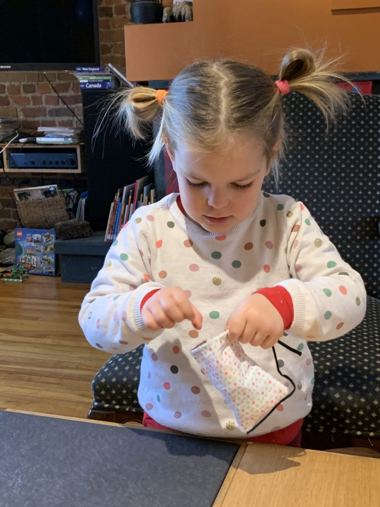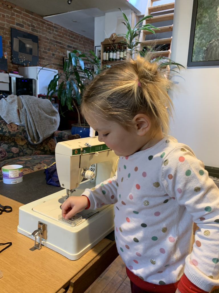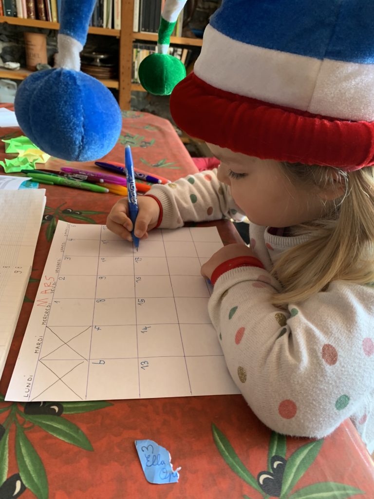 Cette semaine, je suis allée avec elle à la gym, elle s’est déguisée (en Asterix, pour ceux qui ne reconnaîtraient pas 😉 ), nous avons fait des jeux, joué avec ses bébés, cousu un petit sac pour ses élastiques à cheveux, préparé un calendrier du mois de mars (un peu en retard certes…).