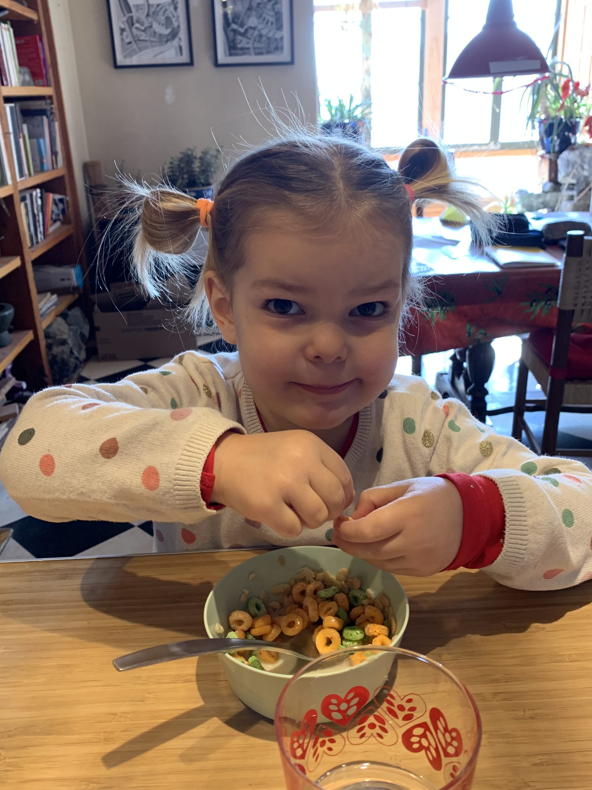 Les soirées sont un peu plus difficile pour Odile depuis le début de l’école, car le soir je dois davantage partager mon attention entre les 3 enfants, tandis que quand Émile et Lucie étaient avec moi toute la journée, elle était toujours la reine de la soirée ! Le matin également, nous sommes davantage minutés par le début de l’école, donc moins sereins.