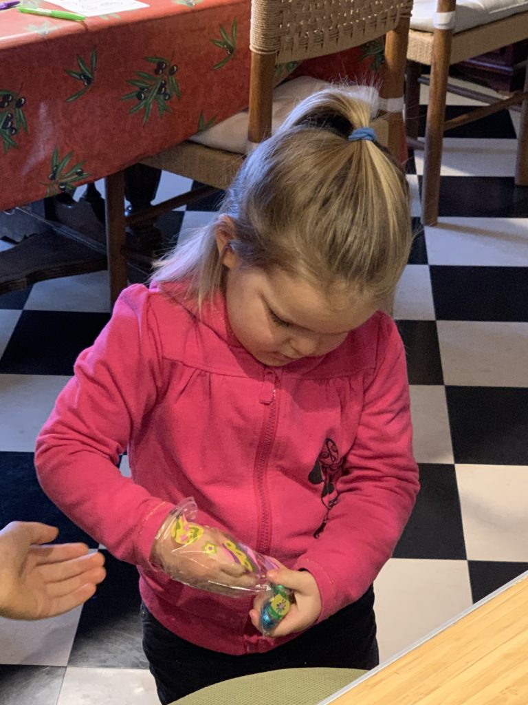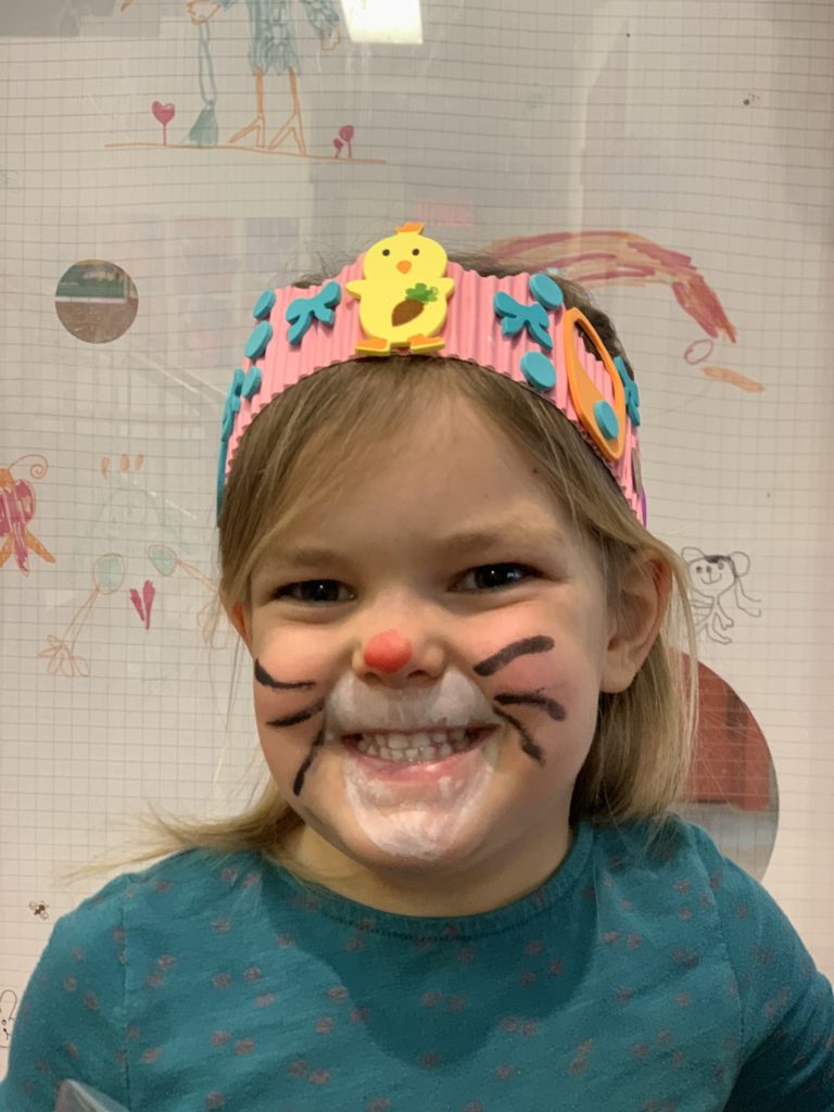Odile a pu aller à la garderie jeudi, et elle a ramené plein d’oeuvres de Pâques : un panier, une couronne, et de nombreux dessins. Le lapin avait surtout les paniers de chaque enfant, et Odile a généreusement partagé ses oeufs de Pâques avec nous le soir. Qu’elle était fière !