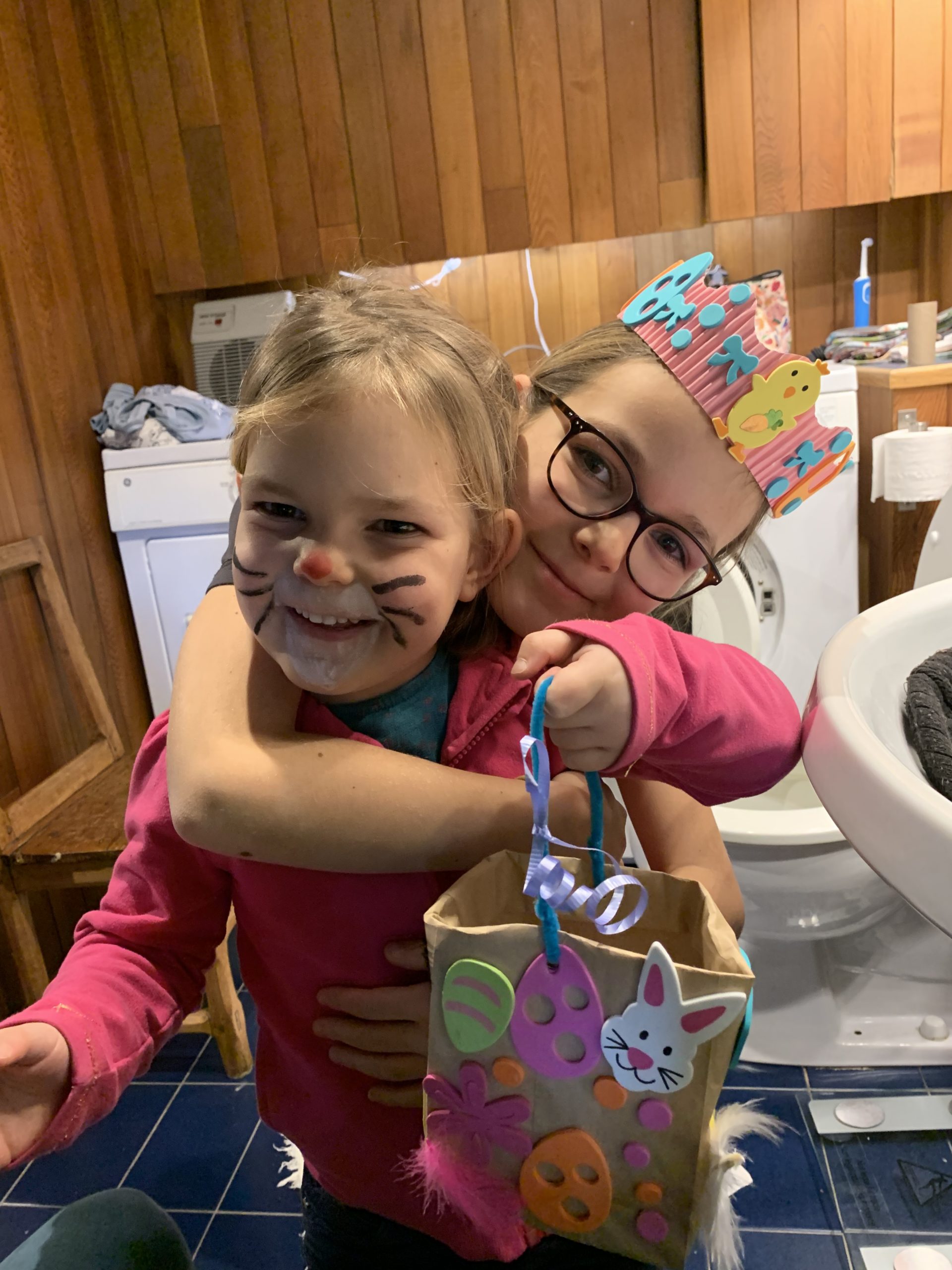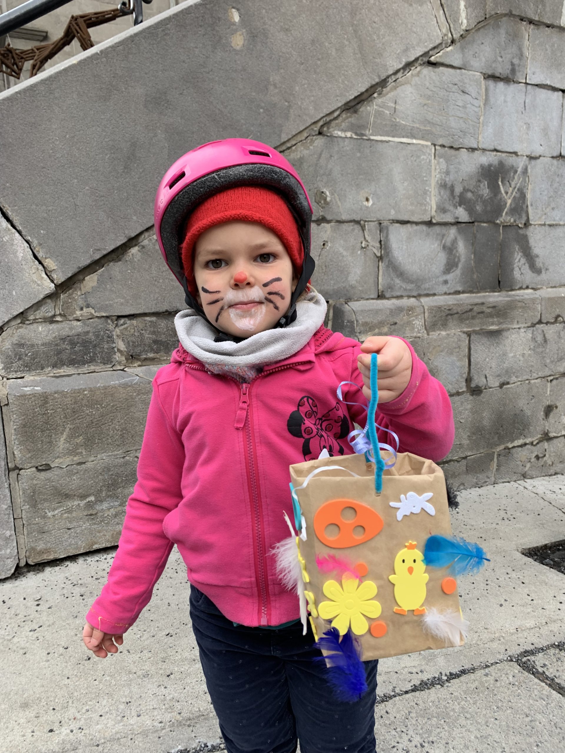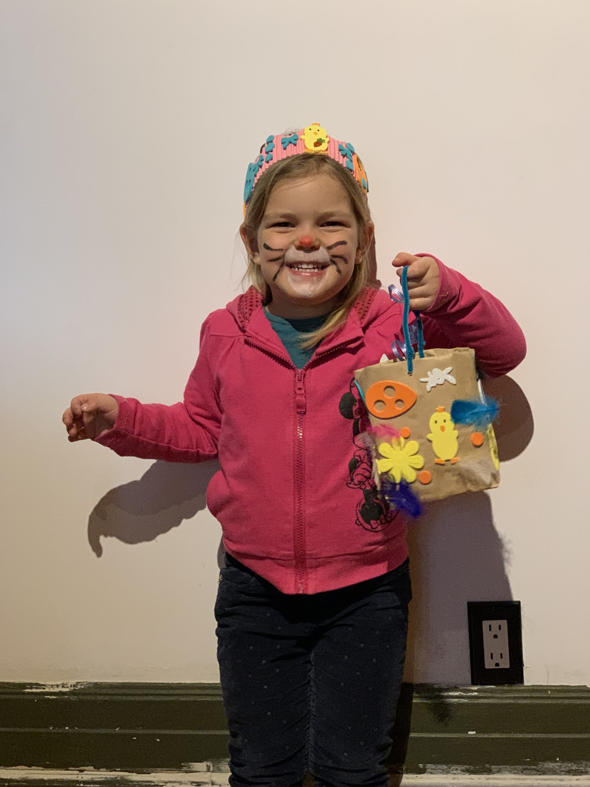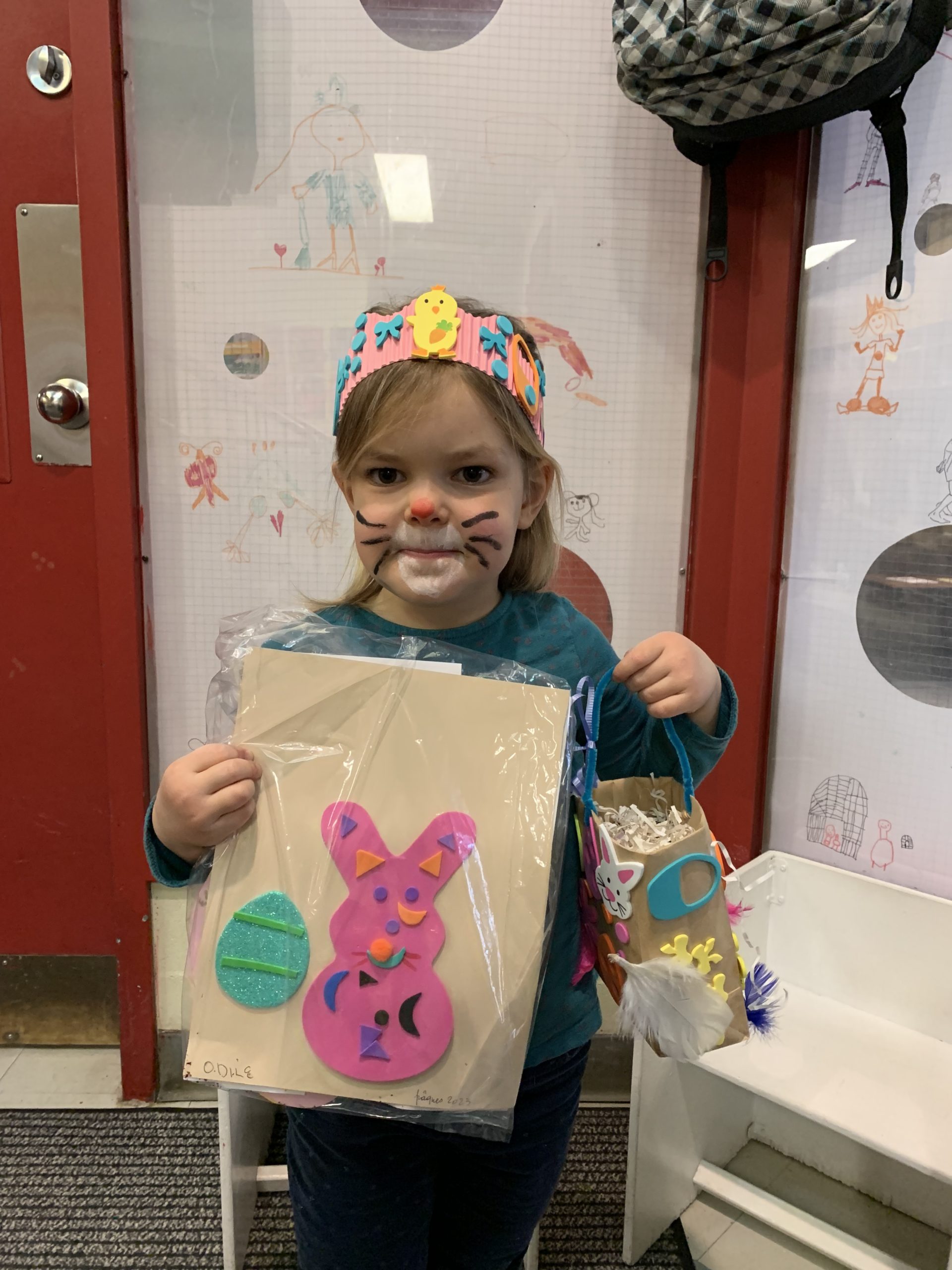 Odile a pu aller à la garderie jeudi, et elle a ramené plein d’oeuvres de Pâques : un panier, une couronne, et de nombreux dessins. Le lapin avait surtout les paniers de chaque enfant, et Odile a généreusement partagé ses oeufs de Pâques avec nous le soir. Qu’elle était fière !