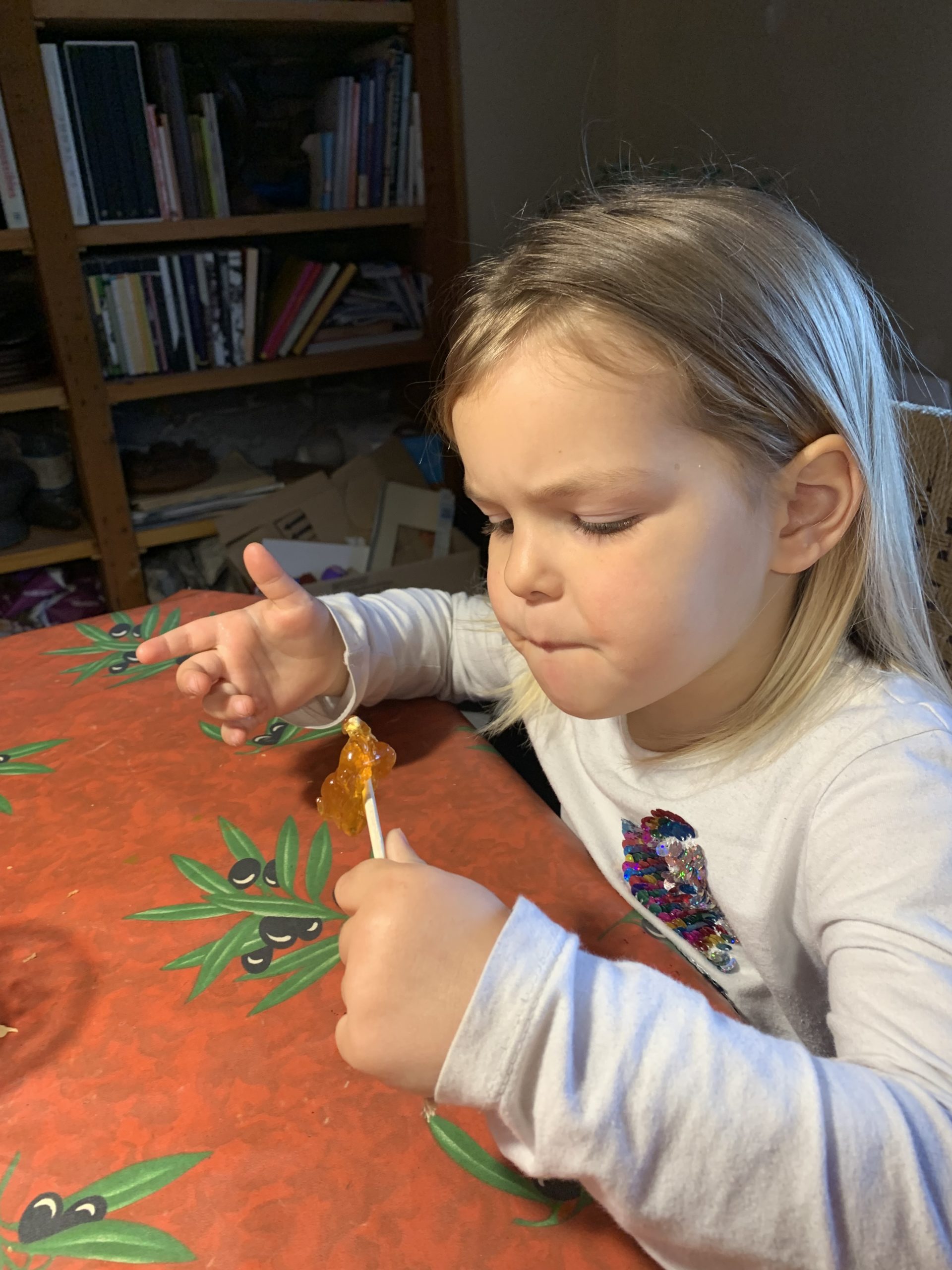 De retour à la maison, nous avons mangé des sucettes de tire d’érable. Nous en avions acheté dans la cabane à sucre du Mont Saint-Grégoire. Nous nous sommes régalés ! À défaut de neige, nous avons utilisé de la glace pour faire refroidir la tire. Nous n’avions pas tout à fait assez anticipé mais cela a quand même été un succès !
