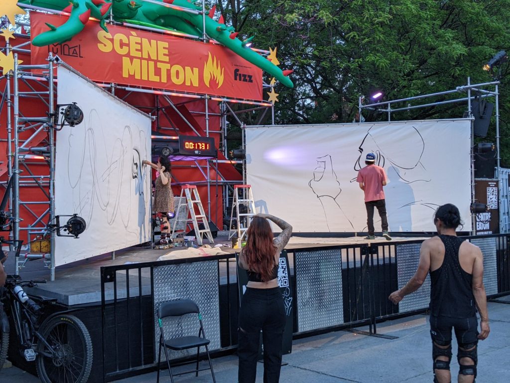 Samedi soir, Thomas, Lucie, Pépi et Mémie sont allés y refaire un tour, pour voir le début d’une “battle” de graffeurs. Il s’agit d’une compétition où des artistes d’affrontent en temps limité. Celui qui réalise le graffiti en noir et blanc qui plaît le plus remporte la manche.