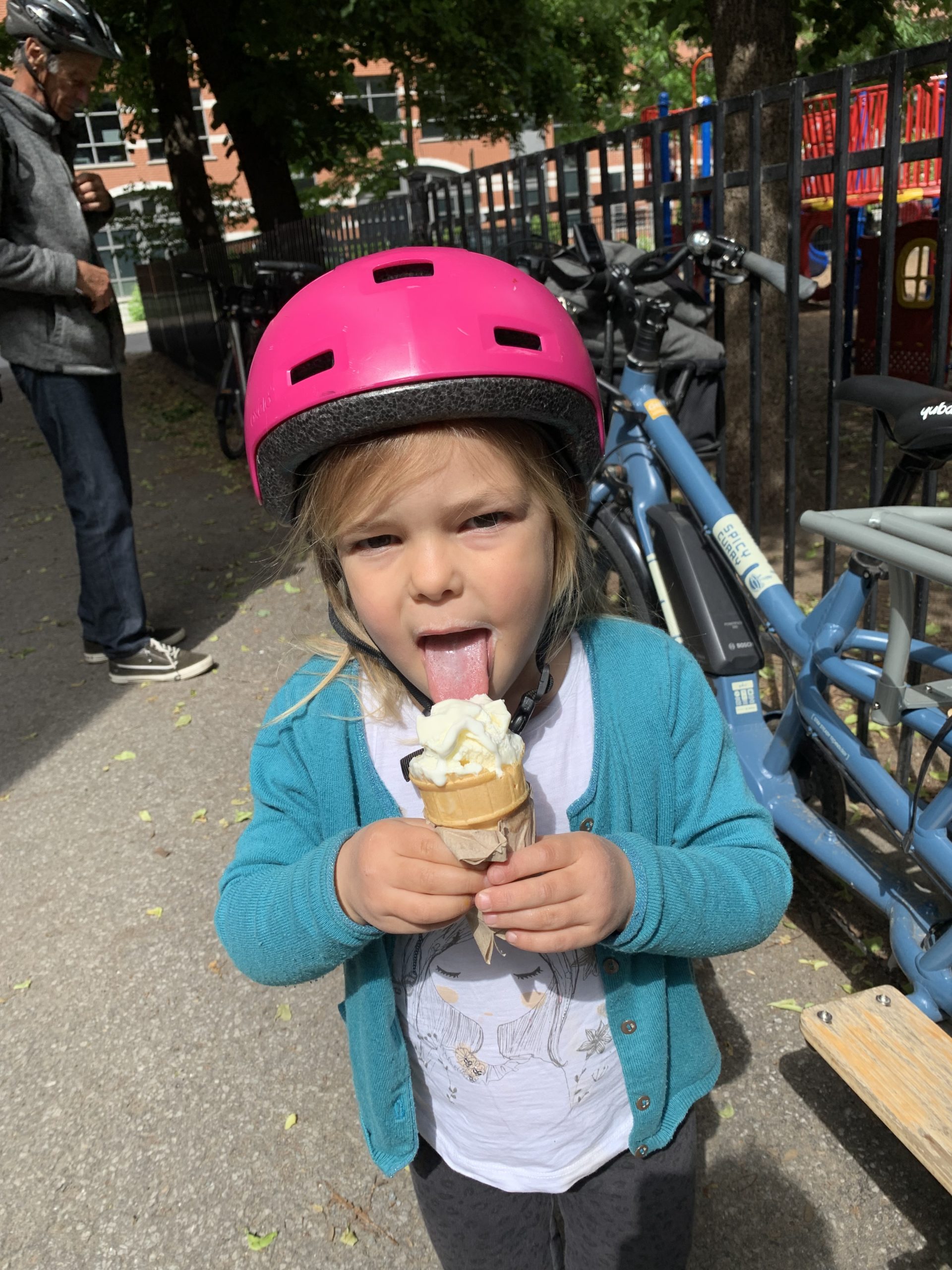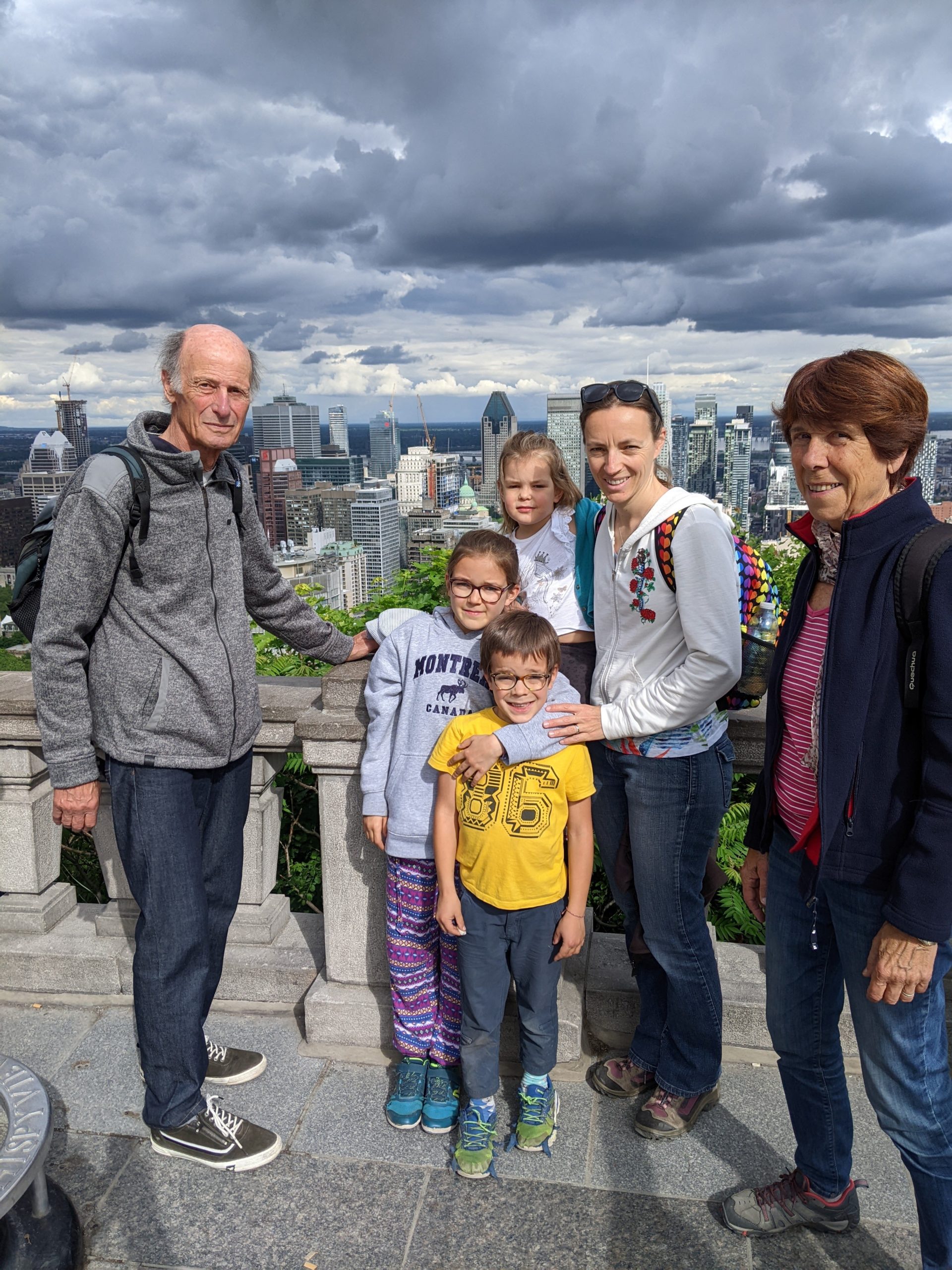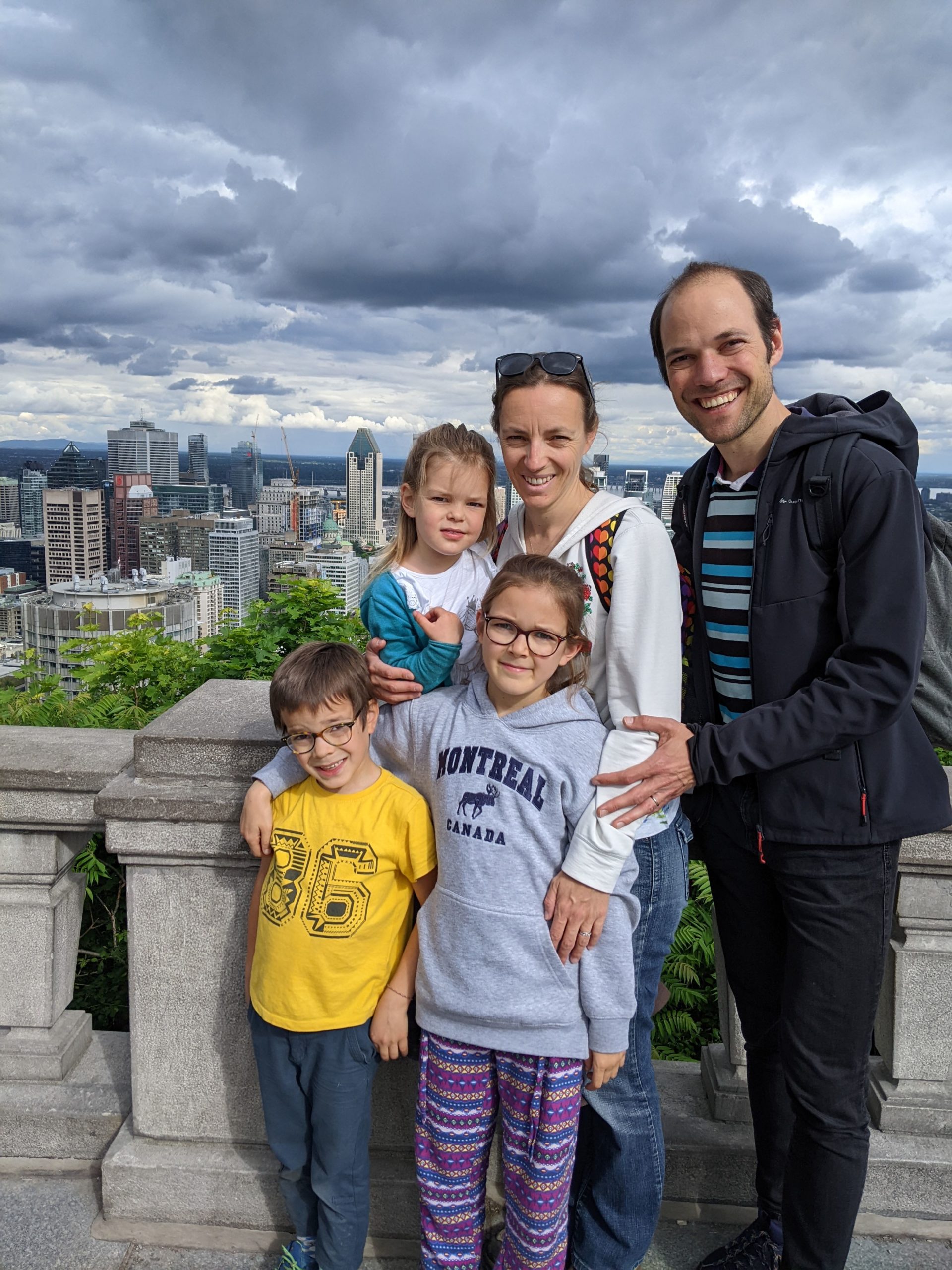 Malgré la météo maussade, nous sommes allés picniquer au Mont Royal ce soir. Nous avons récupéré Odile un peu plus tôt que d’habitude à la garderie – sa maîtresse Lila lui a du coup donné son goûter à emporter ! – puis Émile et Lucie à la sortie de l’école. Je suis montée en Yuba avec les enfants pendant que Thomas et ses parents montaient en bus.