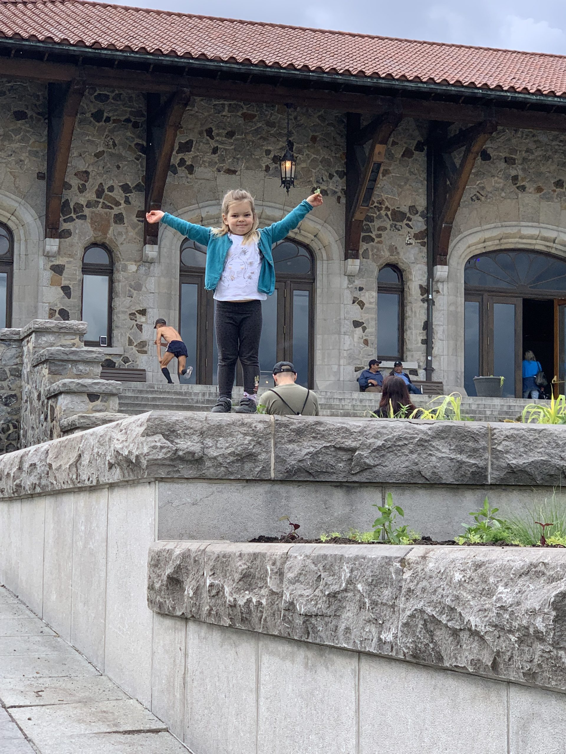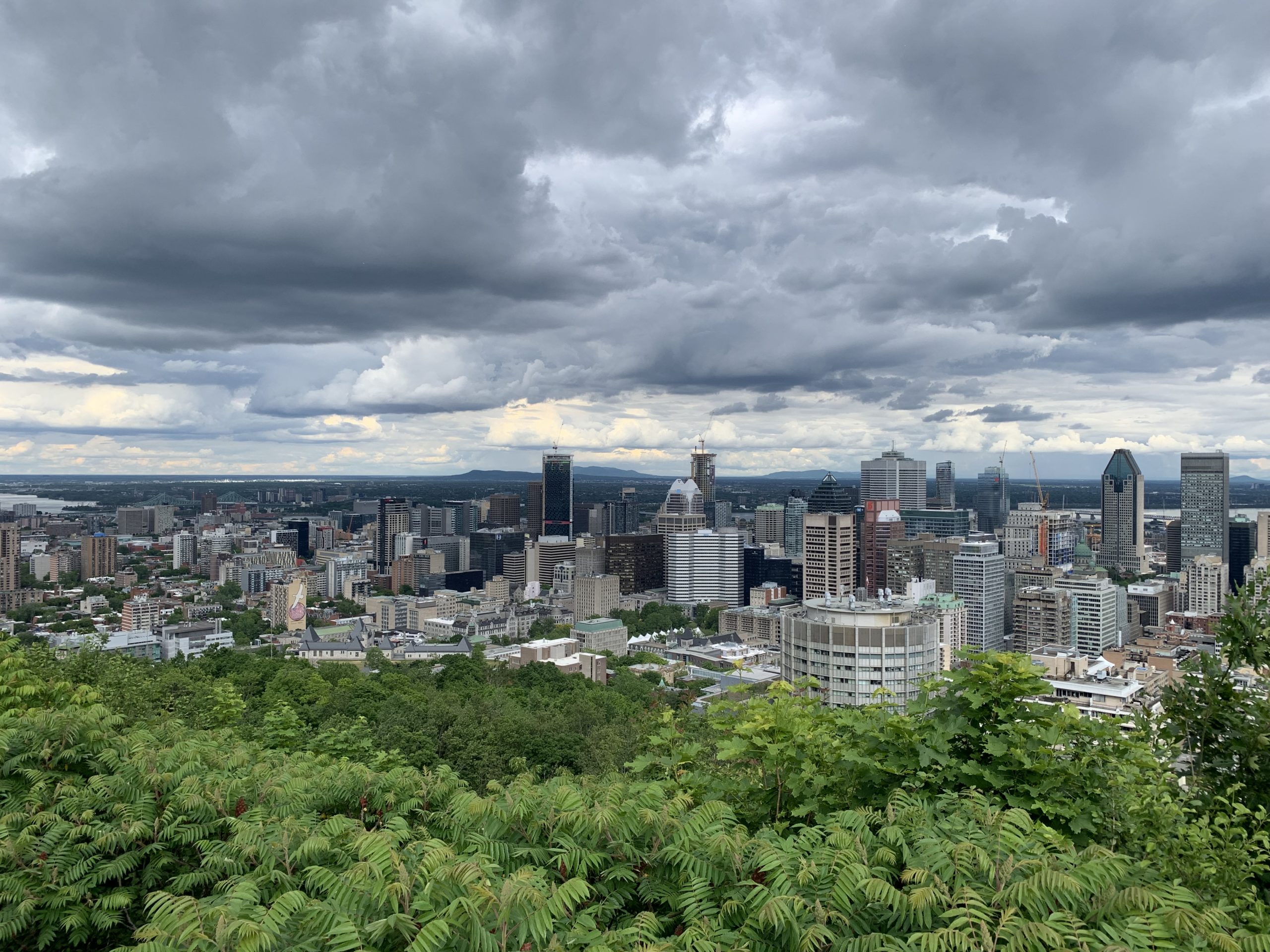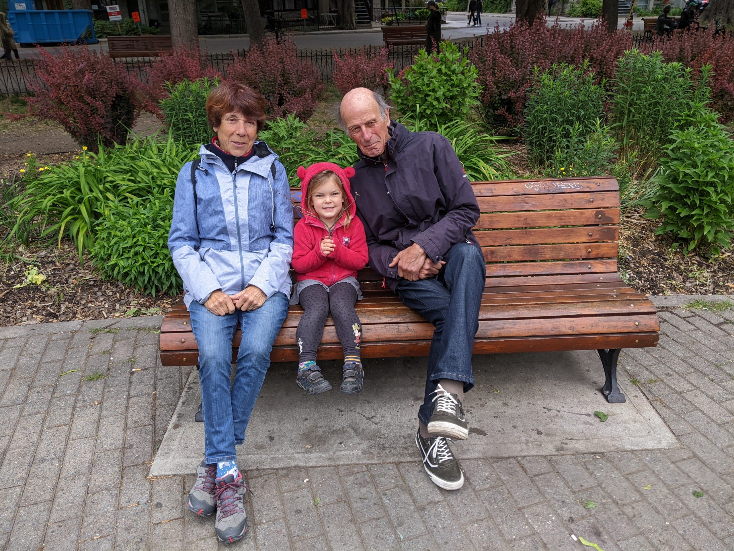 Malgré la météo maussade, nous sommes allés picniquer au Mont Royal ce soir. Nous avons récupéré Odile un peu plus tôt que d’habitude à la garderie – sa maîtresse Lila lui a du coup donné son goûter à emporter ! – puis Émile et Lucie à la sortie de l’école. Je suis montée en Yuba avec les enfants pendant que Thomas et ses parents montaient en bus.