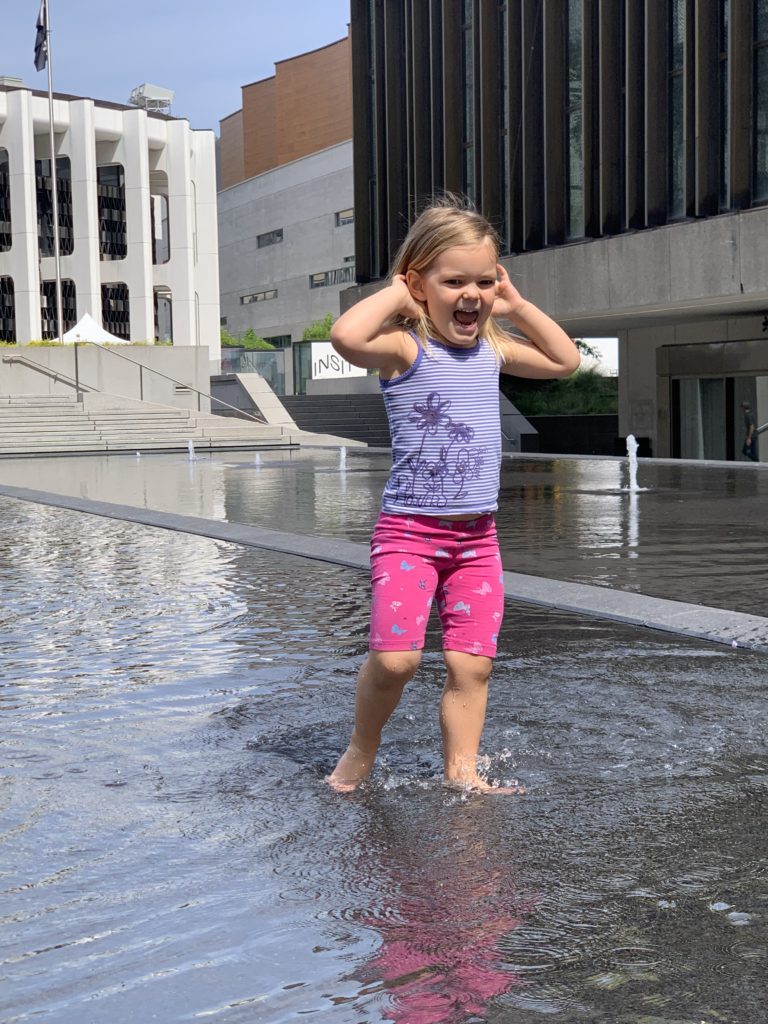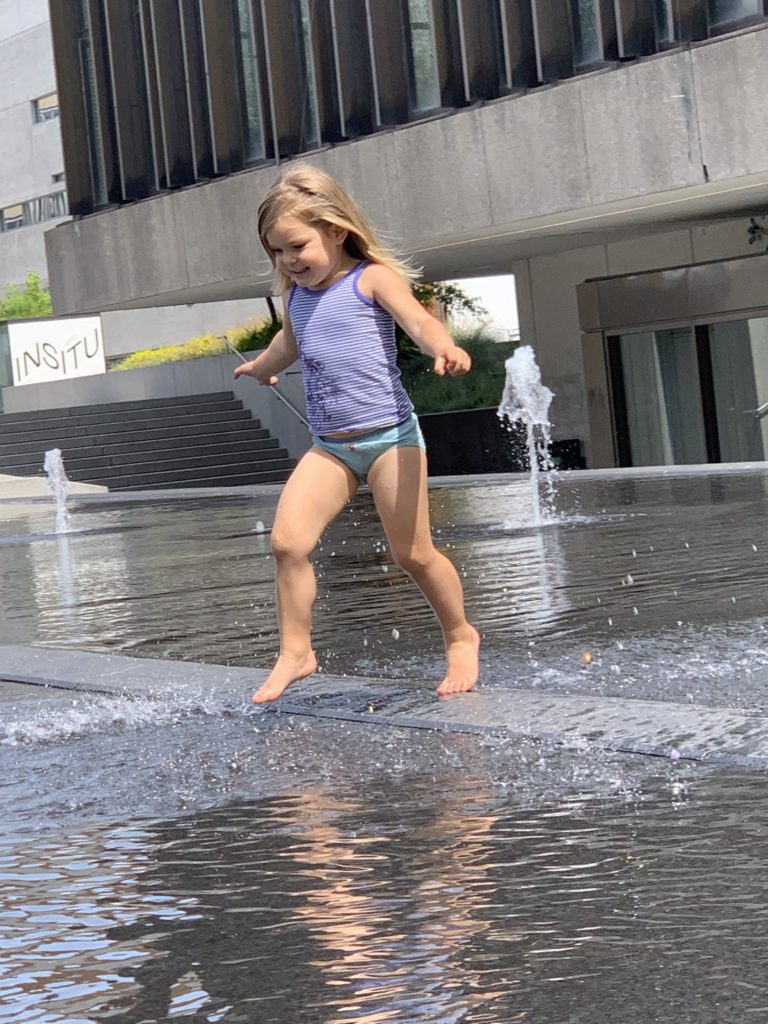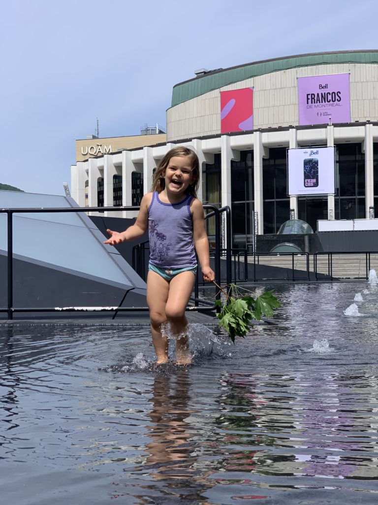 Odile et moi avons testé les jeux d’eau de la Place des Arts aujourd’hui. Nous reviendrons … avec les maillots !