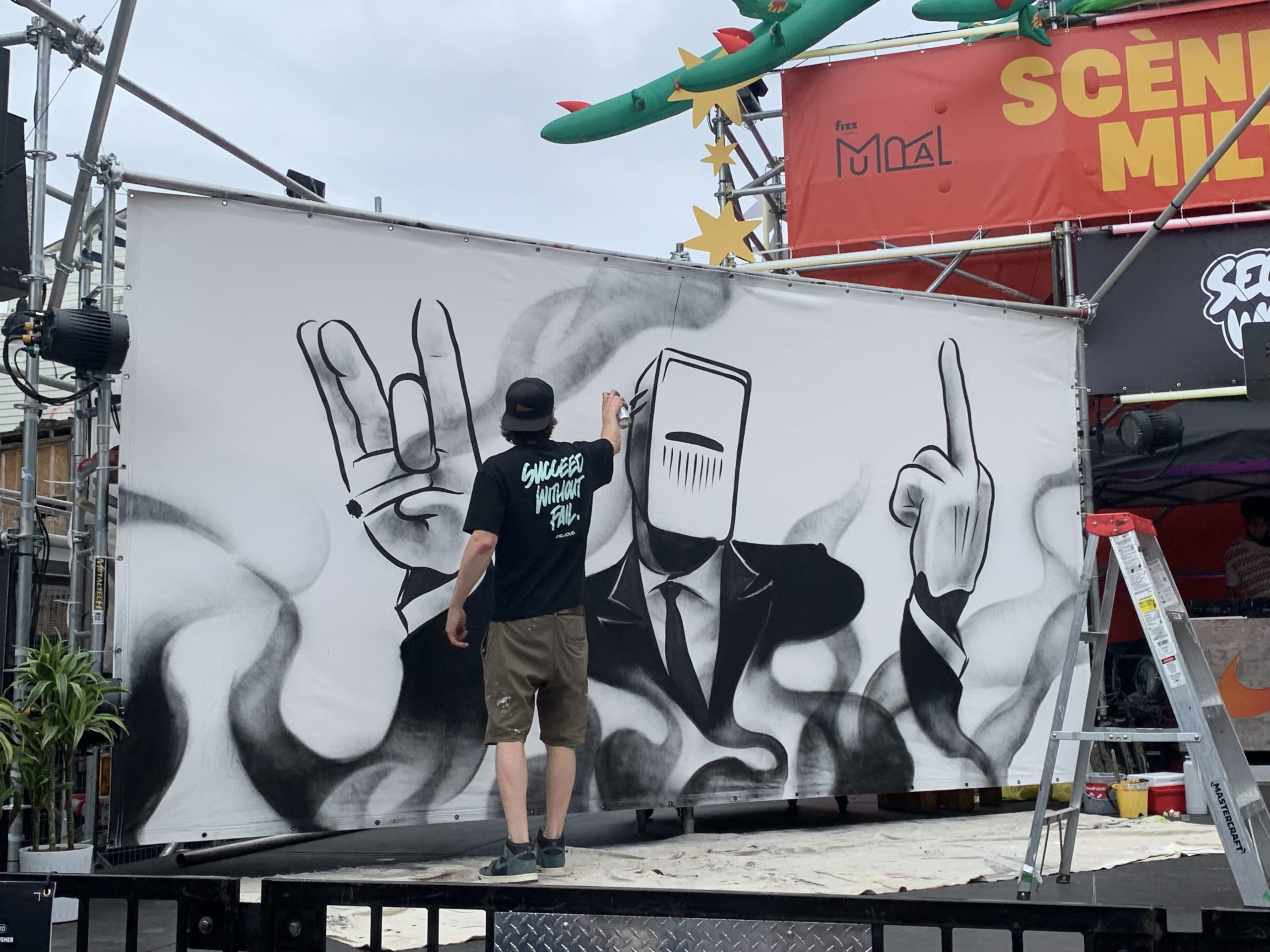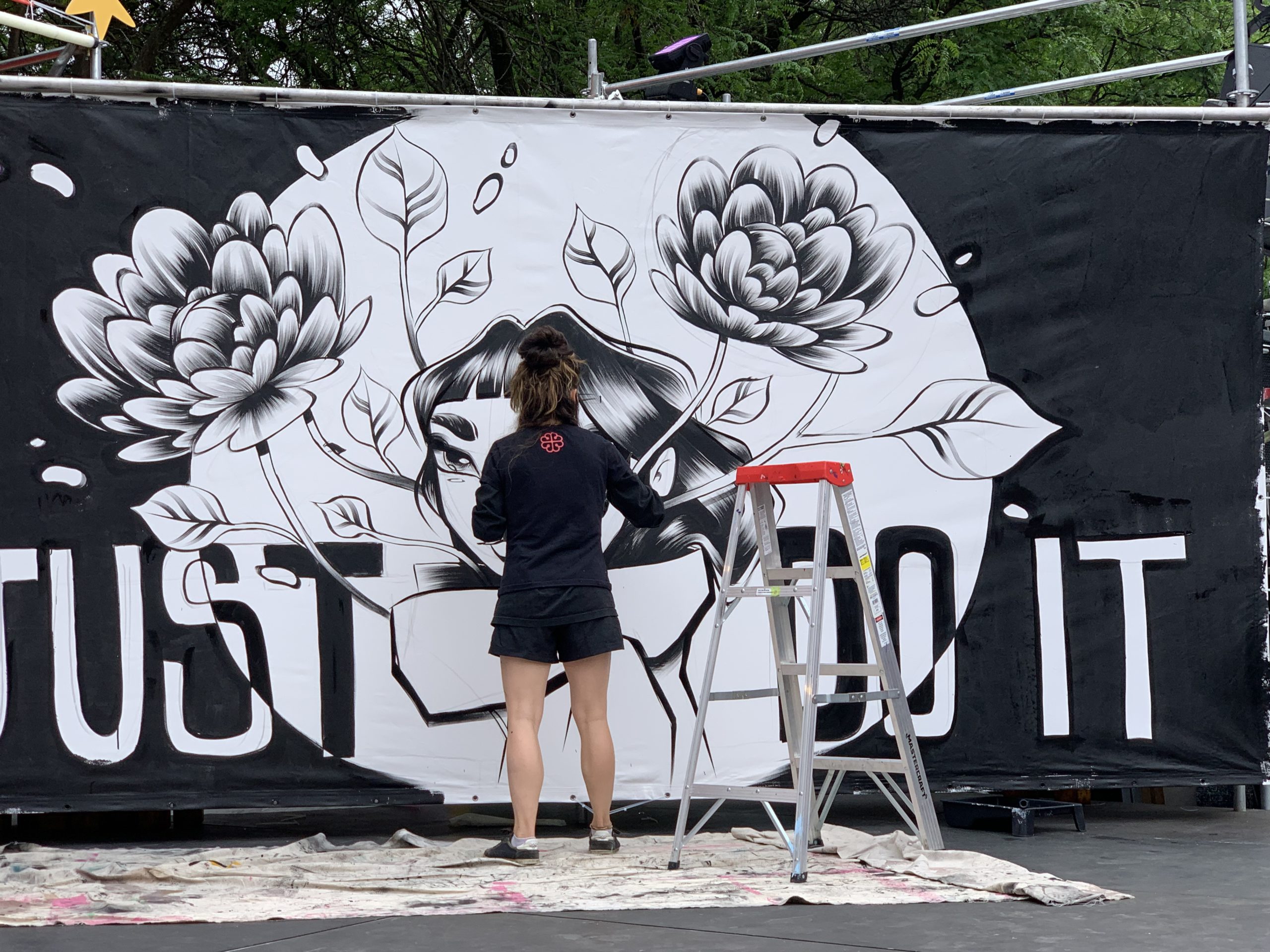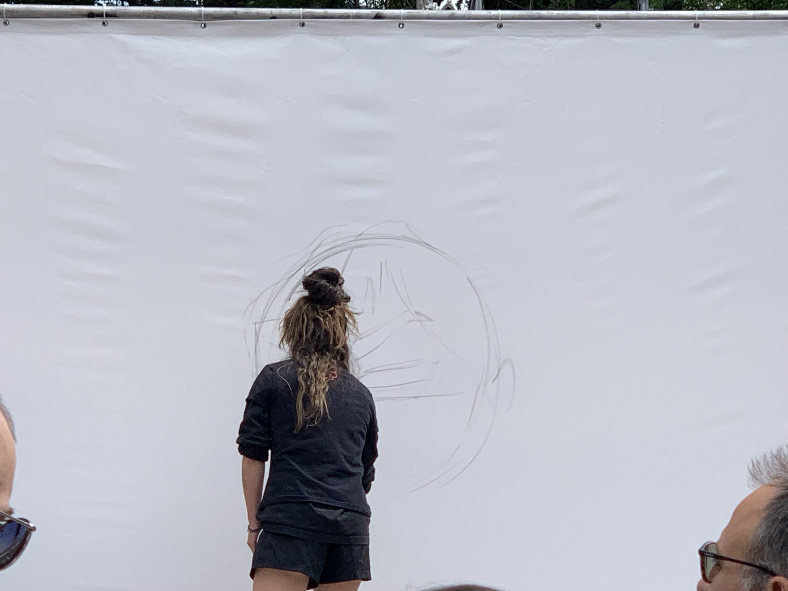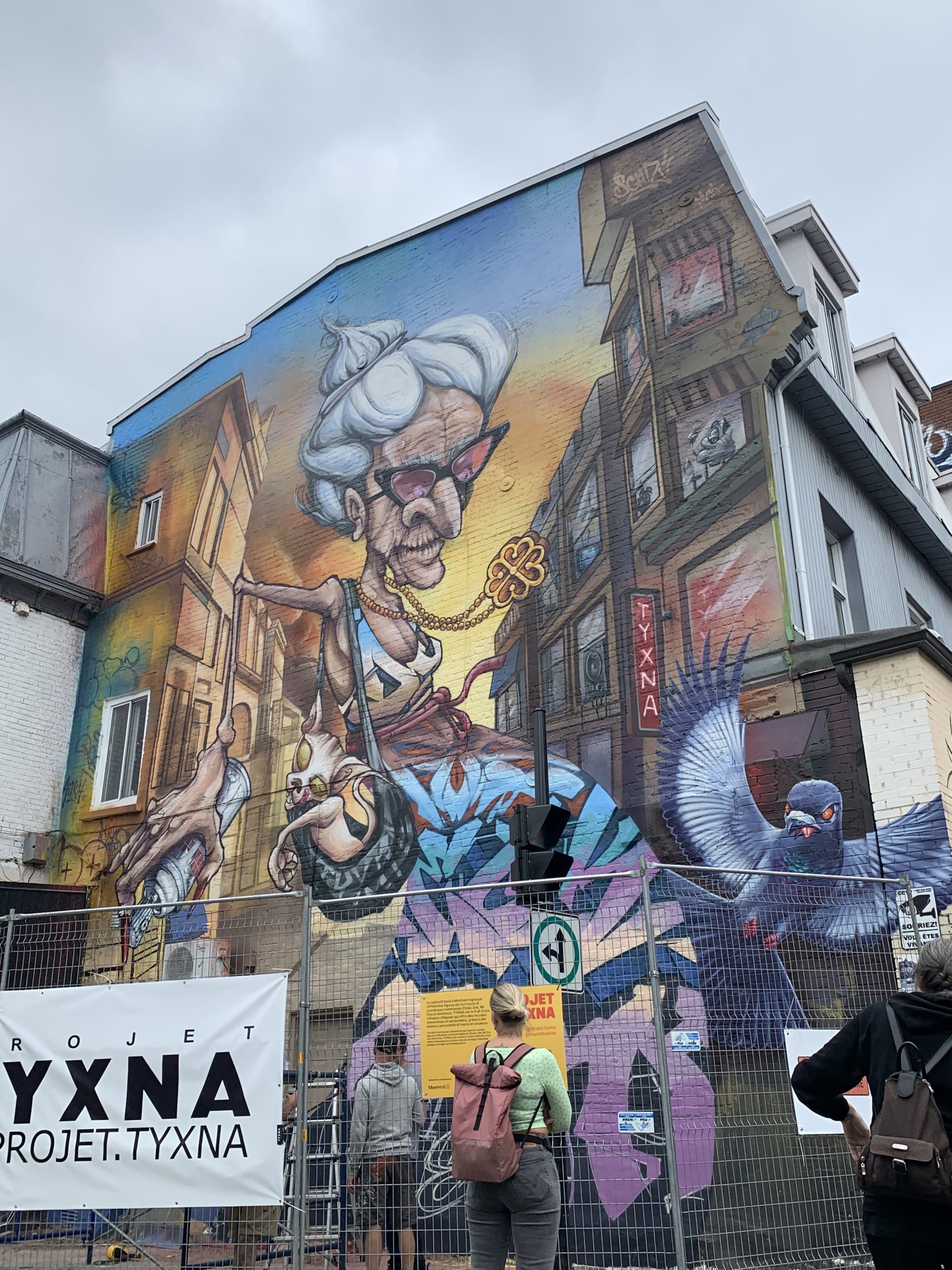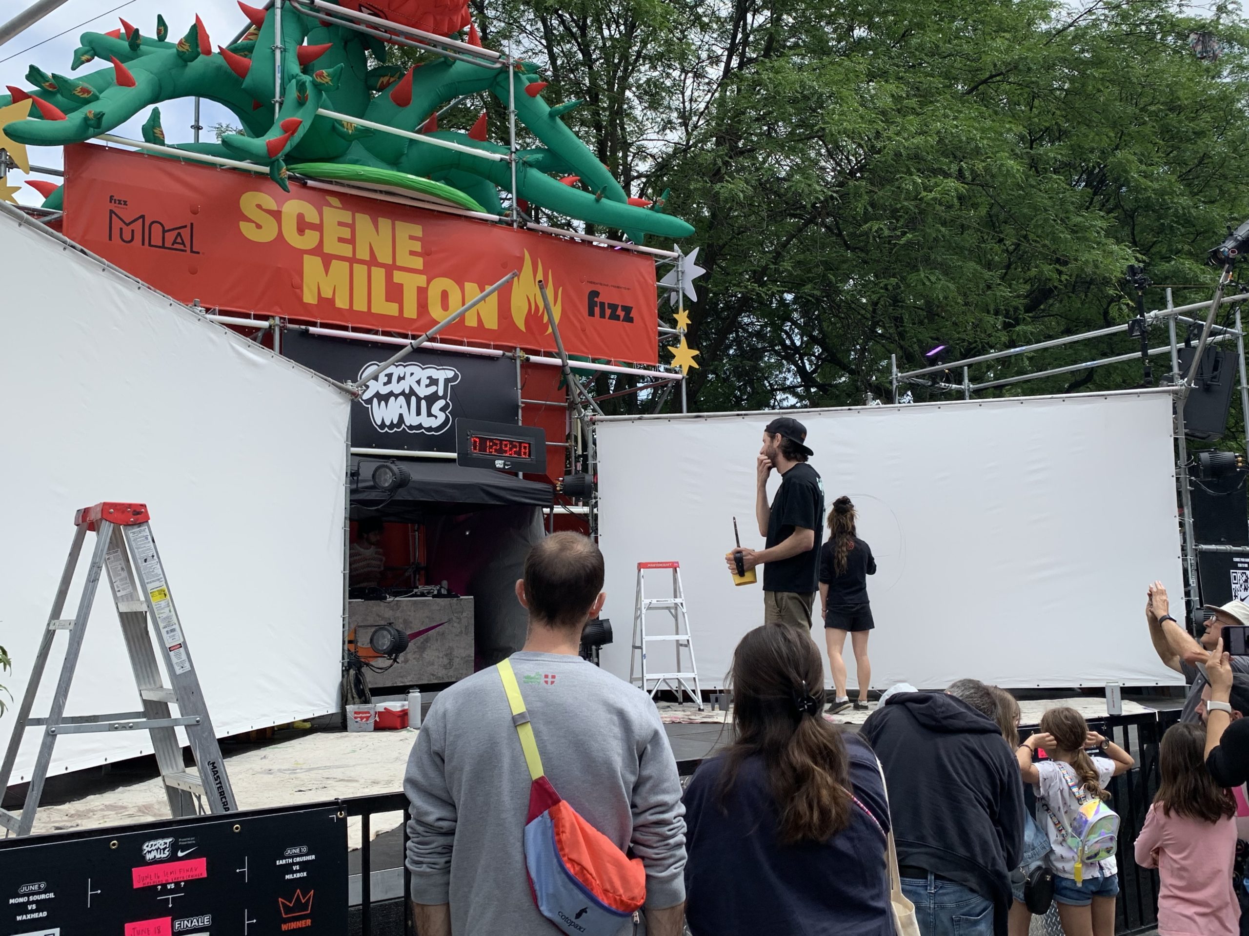 L’après midi, nous sommes retournés au festival Mural, pour enfin réussir à voir une “battle” de graffeurs. Il s’agissait même de la finale. En 1h30, chacun a donc du réaliser une murale en noir et blanc, et le gagnant a été désigné par le public en fonction du volume sonore. C’est celui de gauche qui a gagné, même si notre préférence allait à celle de droite 🙂