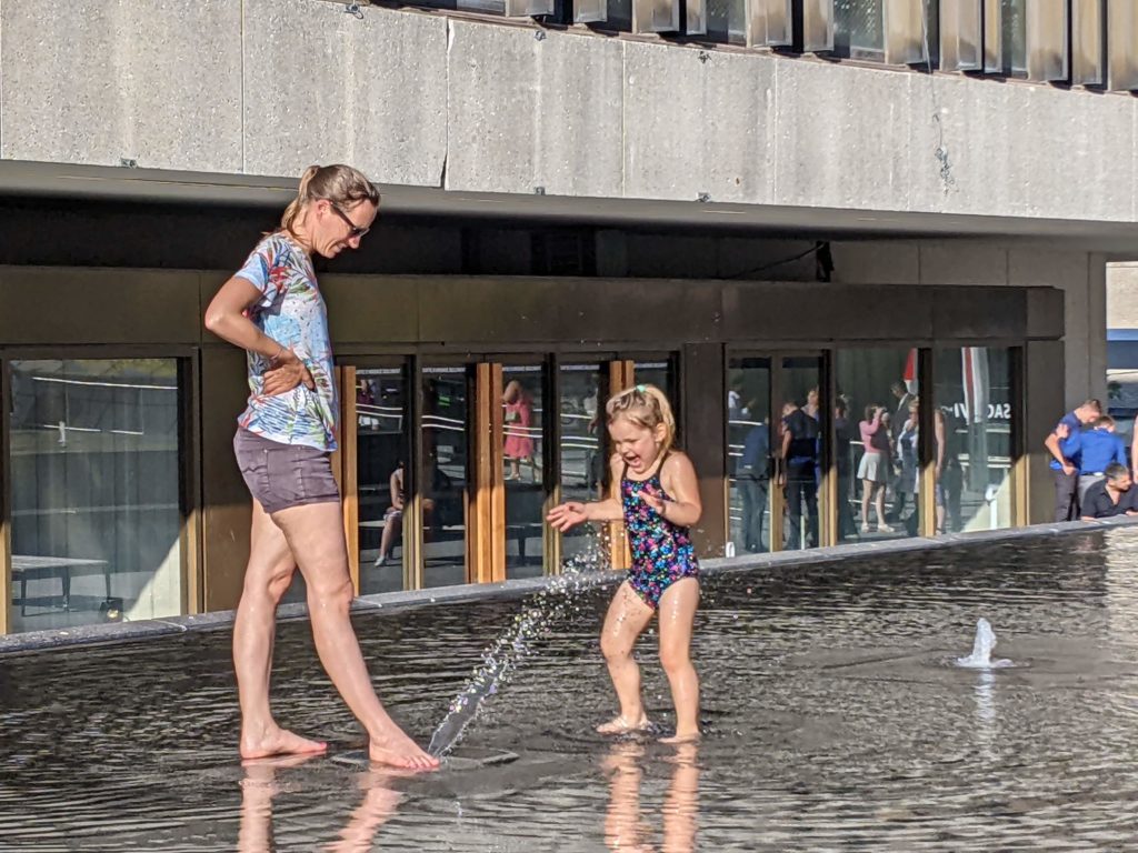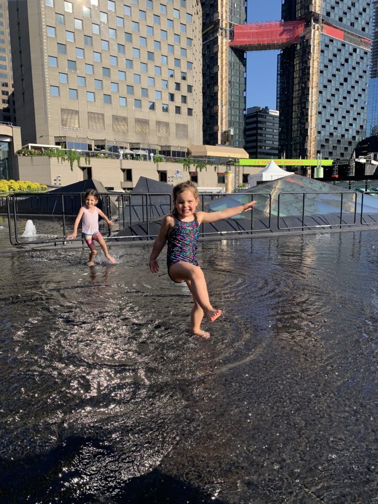 Après les avoir posés à leur cours de théâtre, j’ai récupéré Odile, que j’ai aussi amené à des jeux d’eau, cette fois ci à la Place des Arts. Thomas nous a ramenées en Yuba 😉