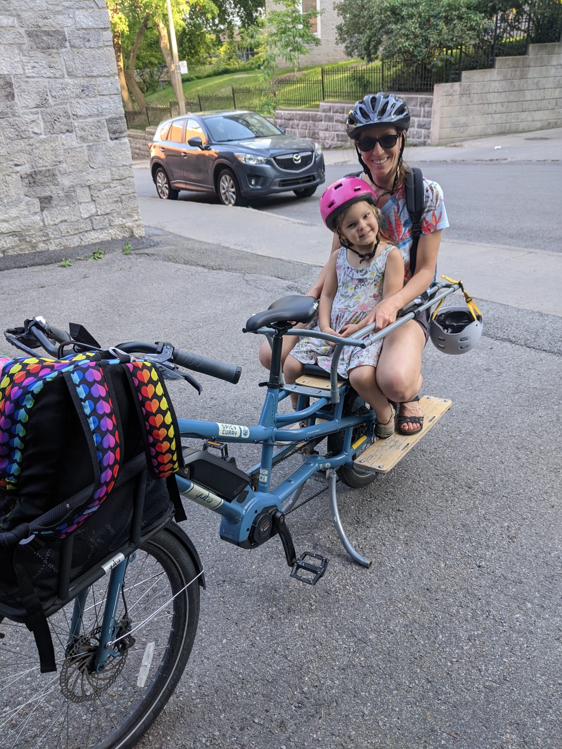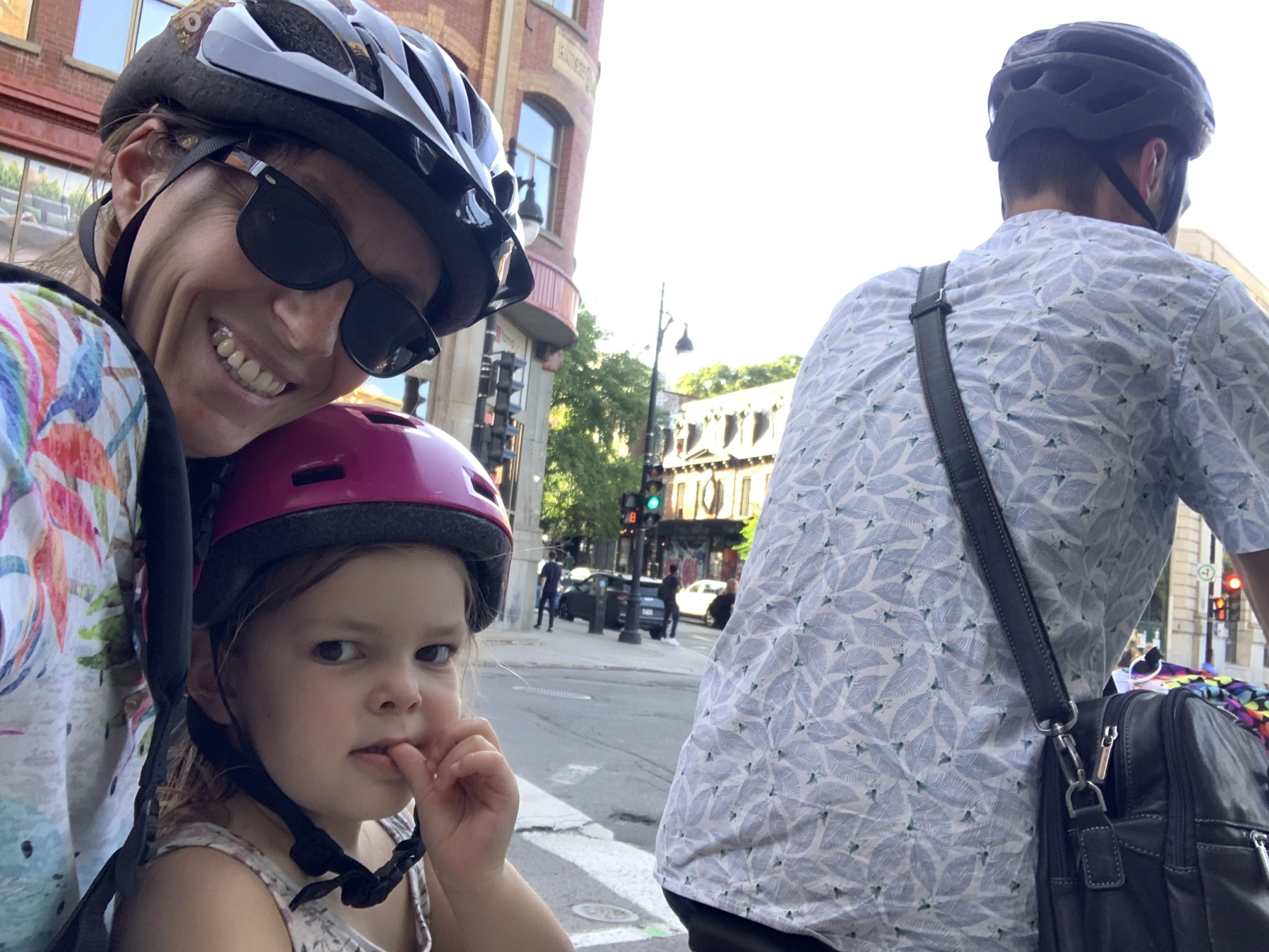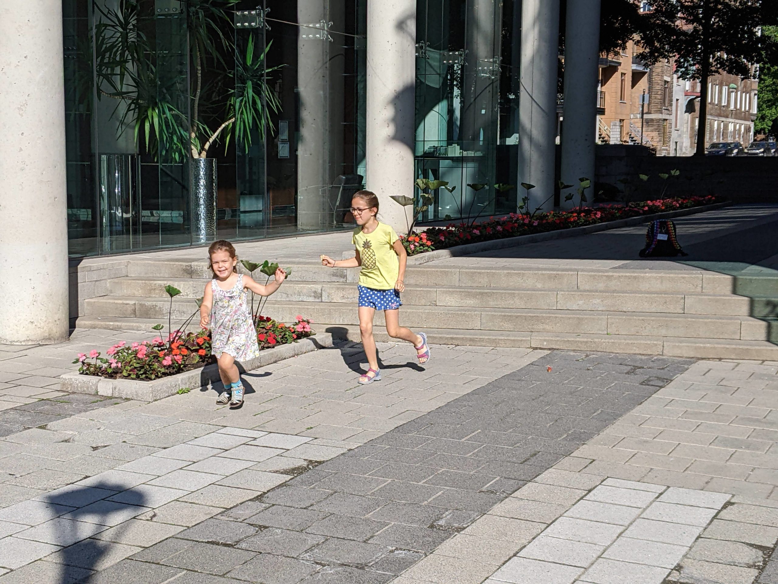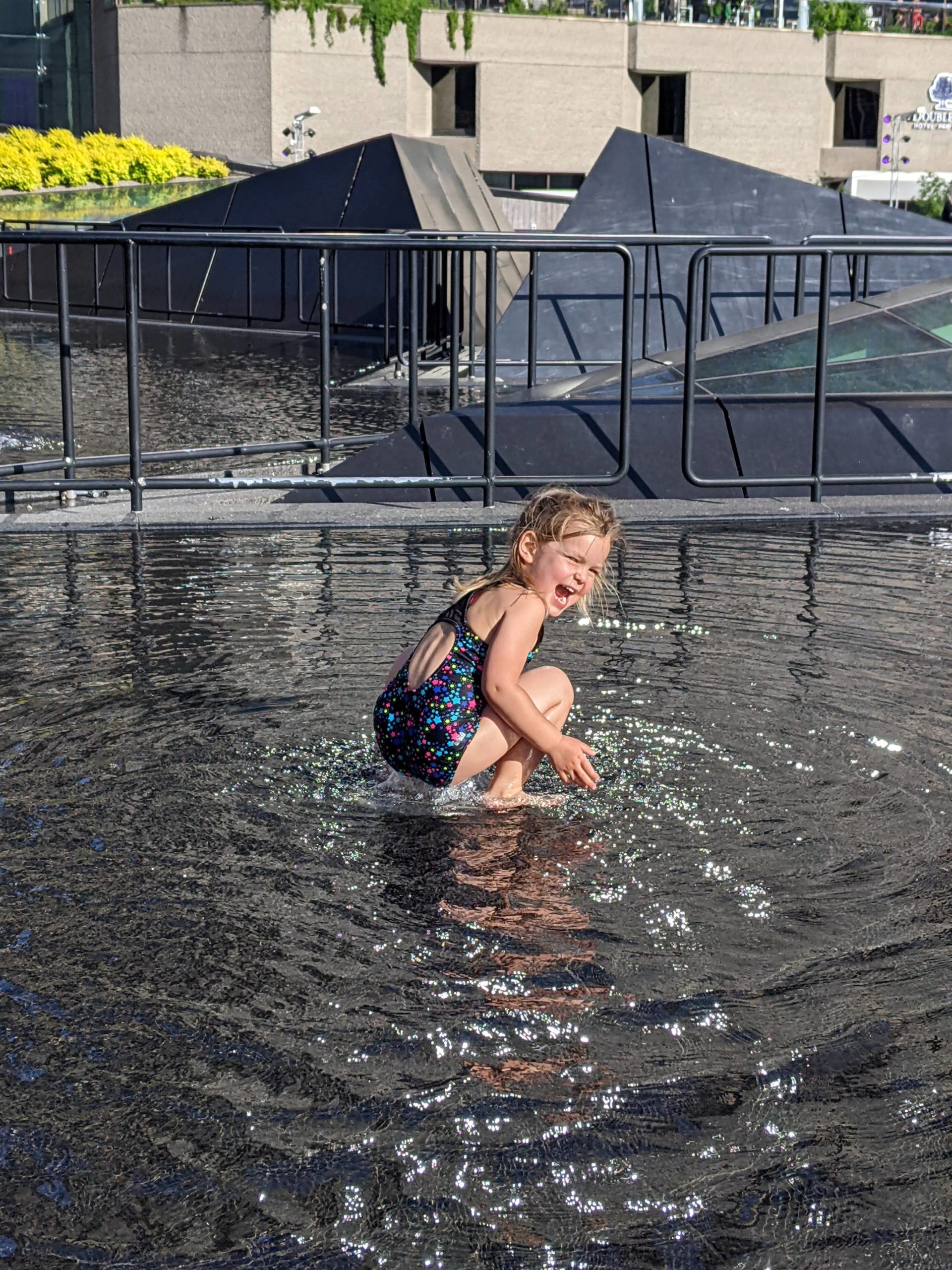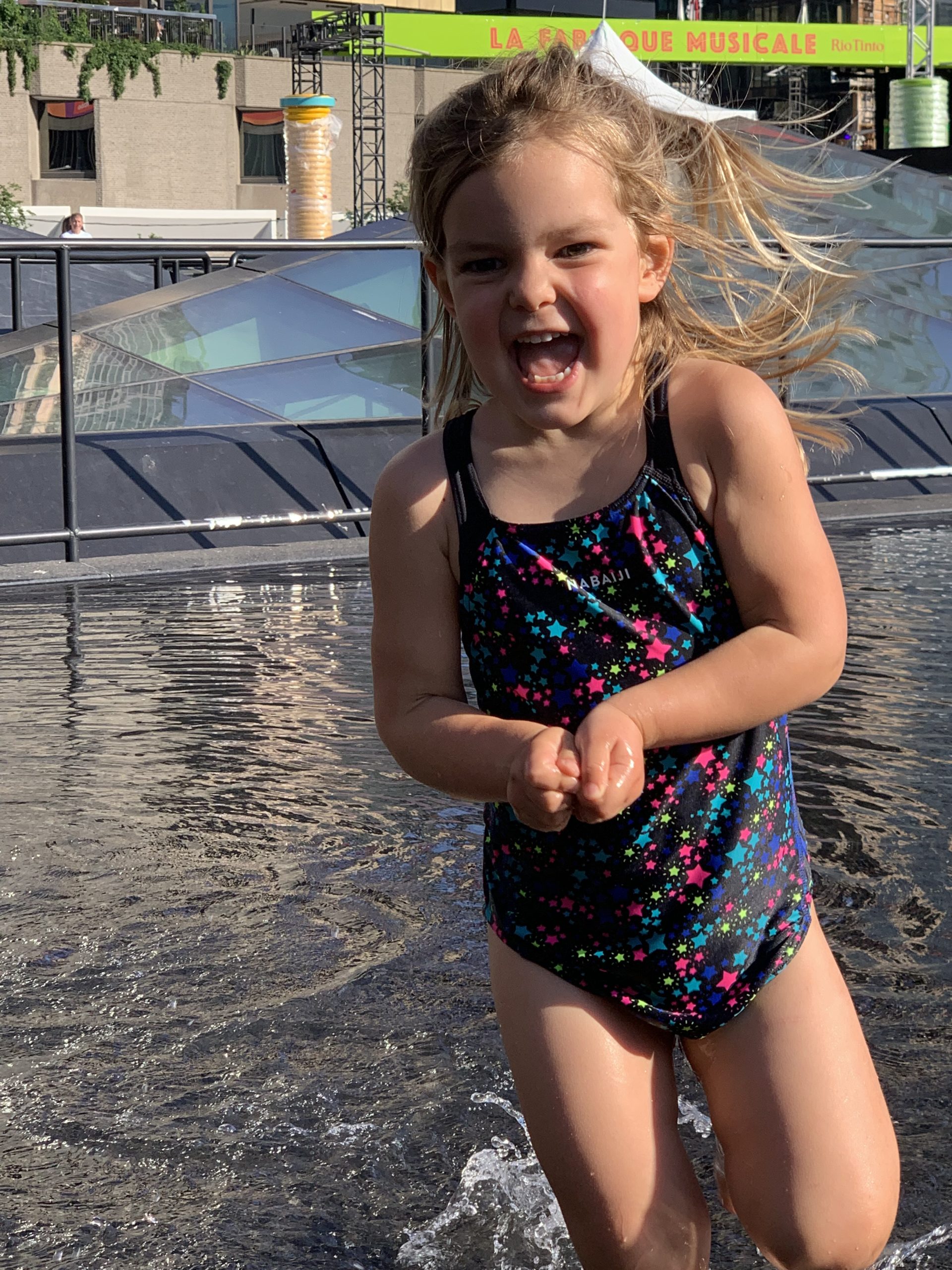 Après les avoir posés à leur cours de théâtre, j’ai récupéré Odile, que j’ai aussi amené à des jeux d’eau, cette fois ci à la Place des Arts. Thomas nous a ramenées en Yuba 😉
