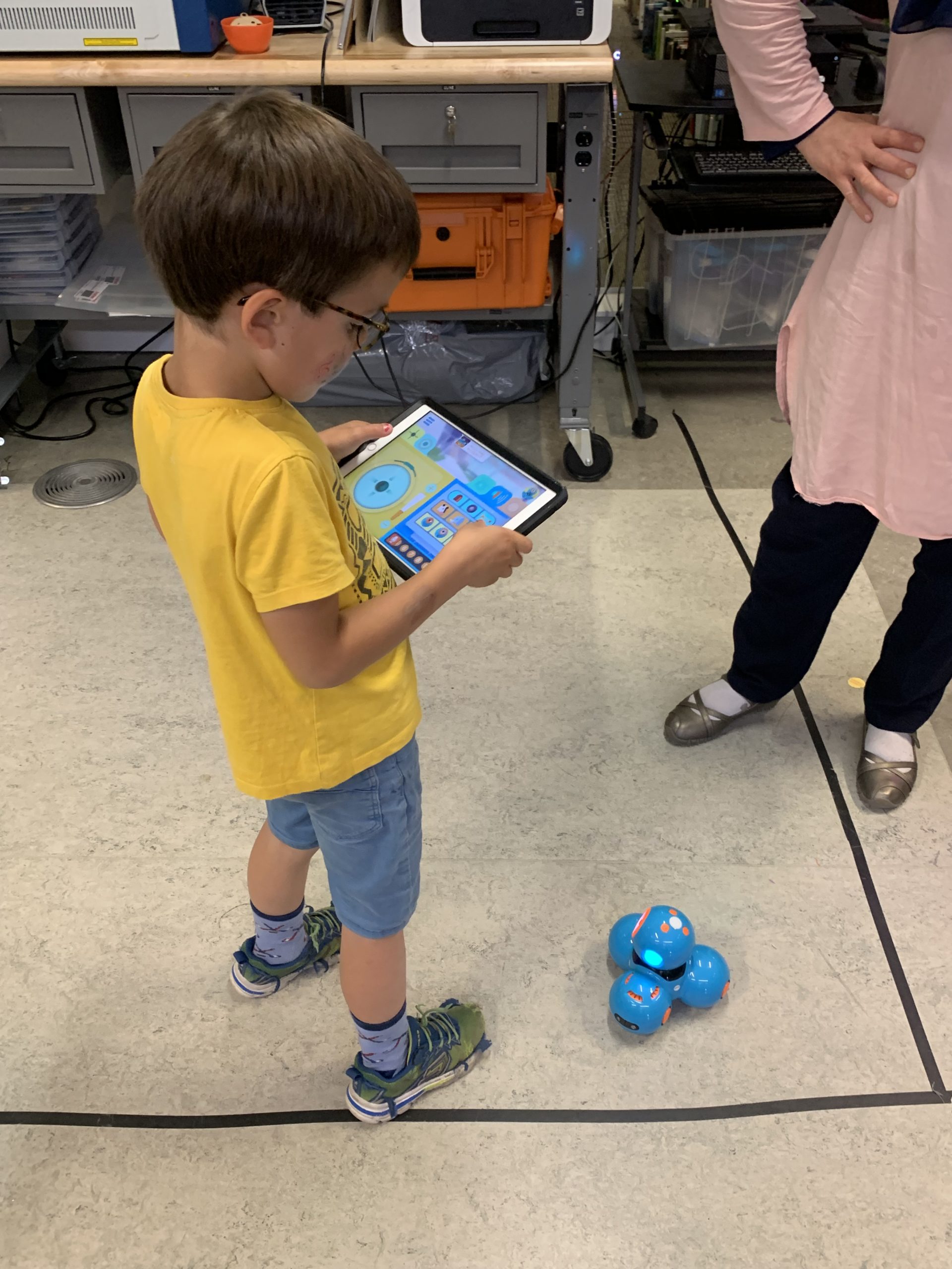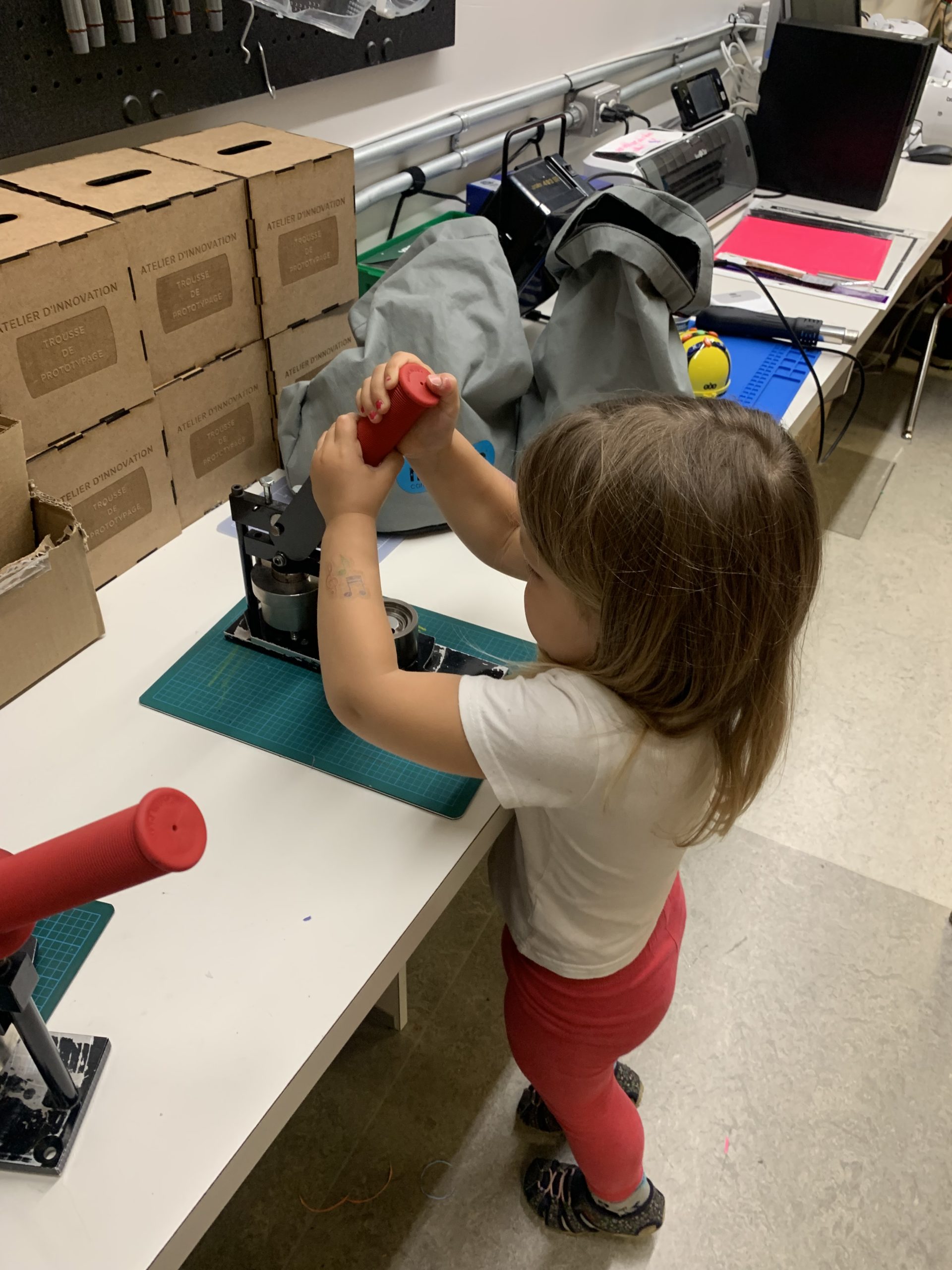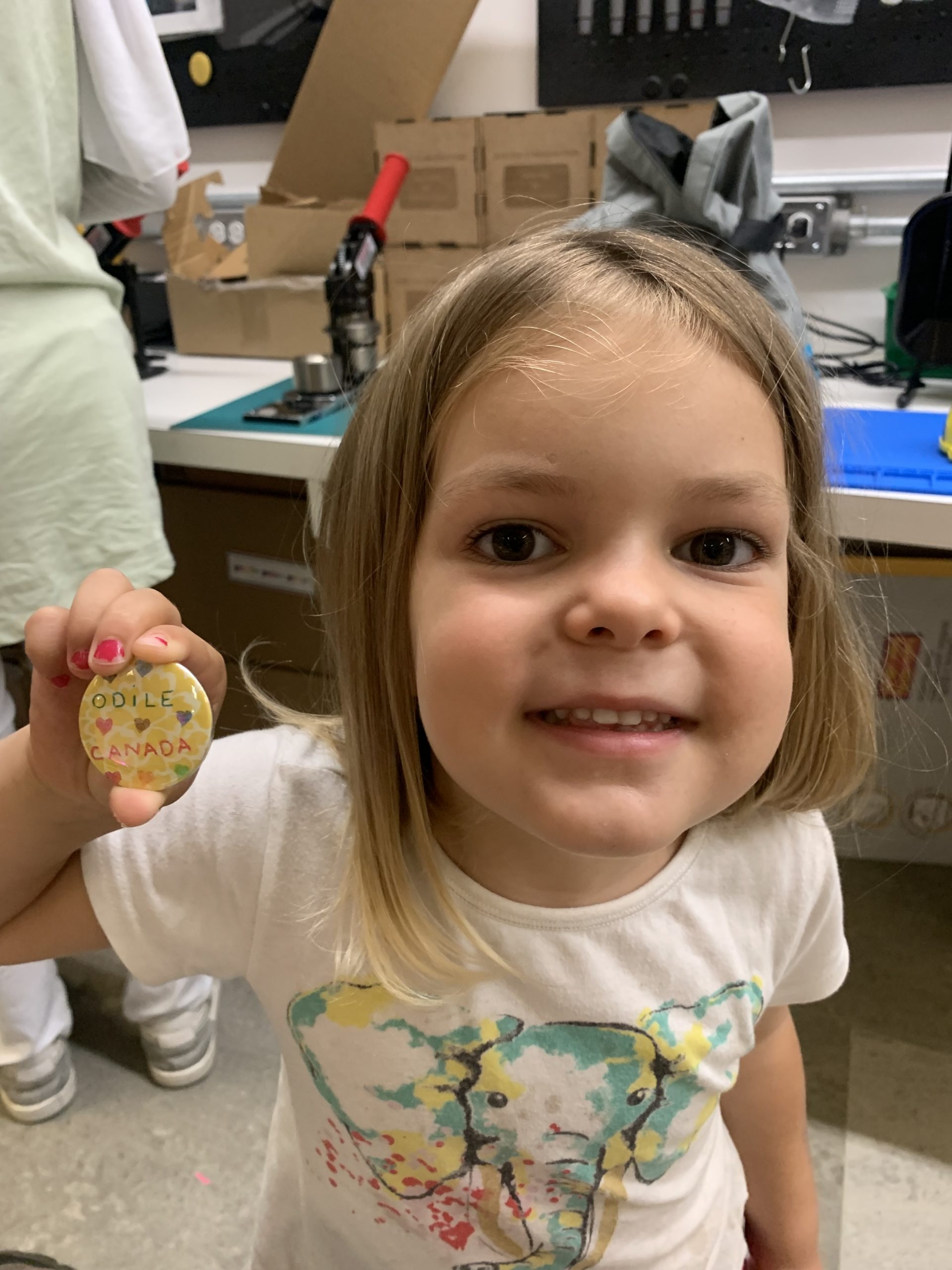 L’après-midi, nous sommes retournés à la Hutte, cette fois Lucie a fabriqué un petit porte-clé avec l’imprimante 3D et Émile s’est cousu un coussin. Odile est arrivé sur la fin de la séance et elle a fabriqué plusieurs petits macarons (des badges).