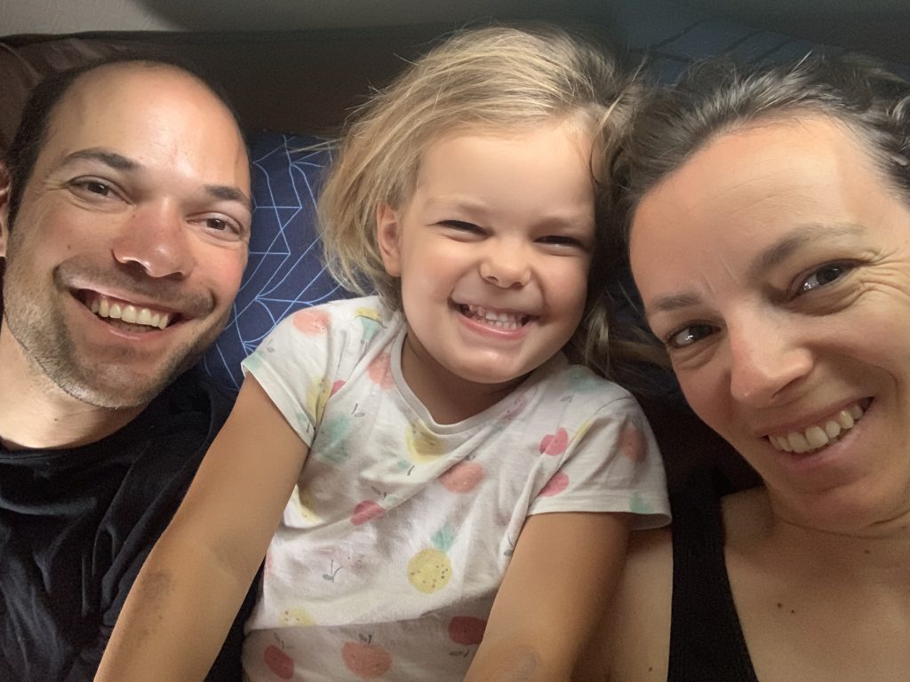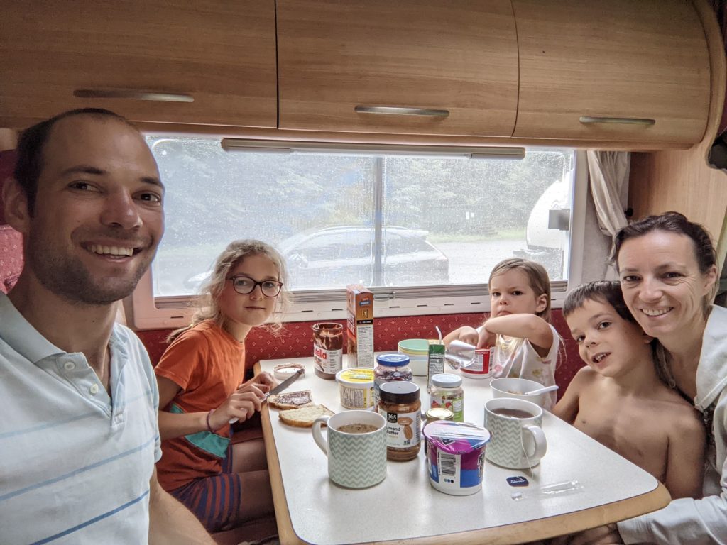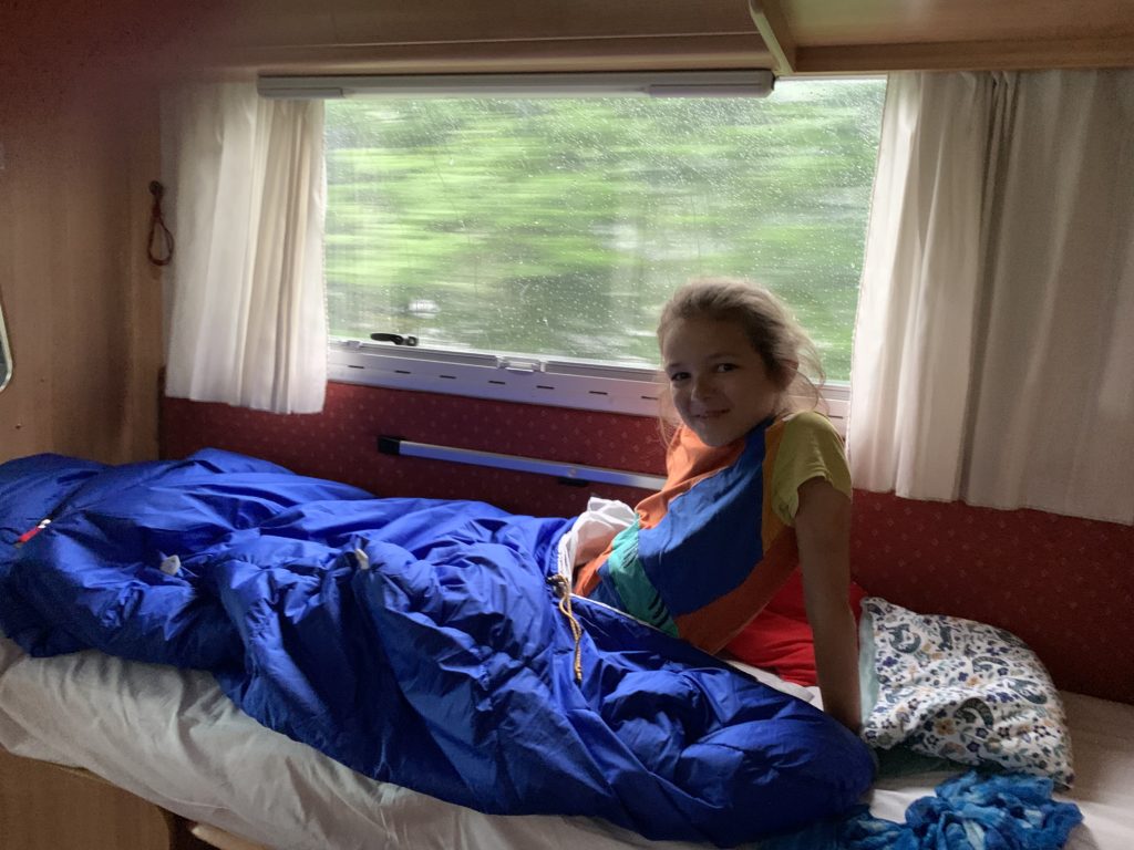 Et tout le monde est ravi de s’installer pour la première nuit dans le camping car ! Odile et Émile dorment dans des lits superposés au fond du véhicule (isolés par de petits rideaux); Lucie dort dans l’espace central, où les banquettes se transforment en lit; et Thomas et moi dormons sur un lit au dessus du chauffeur.