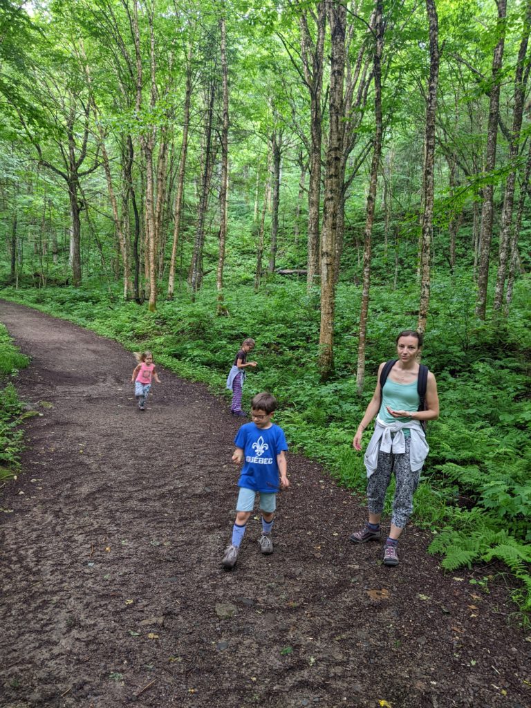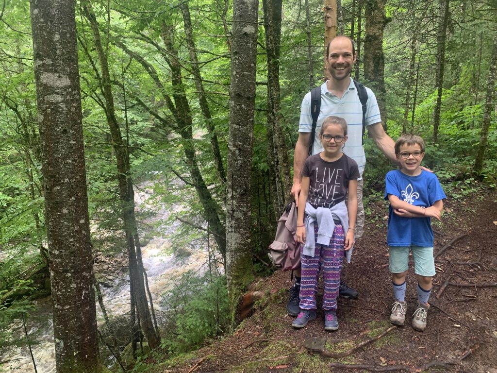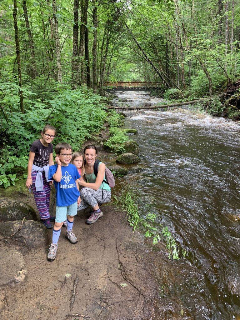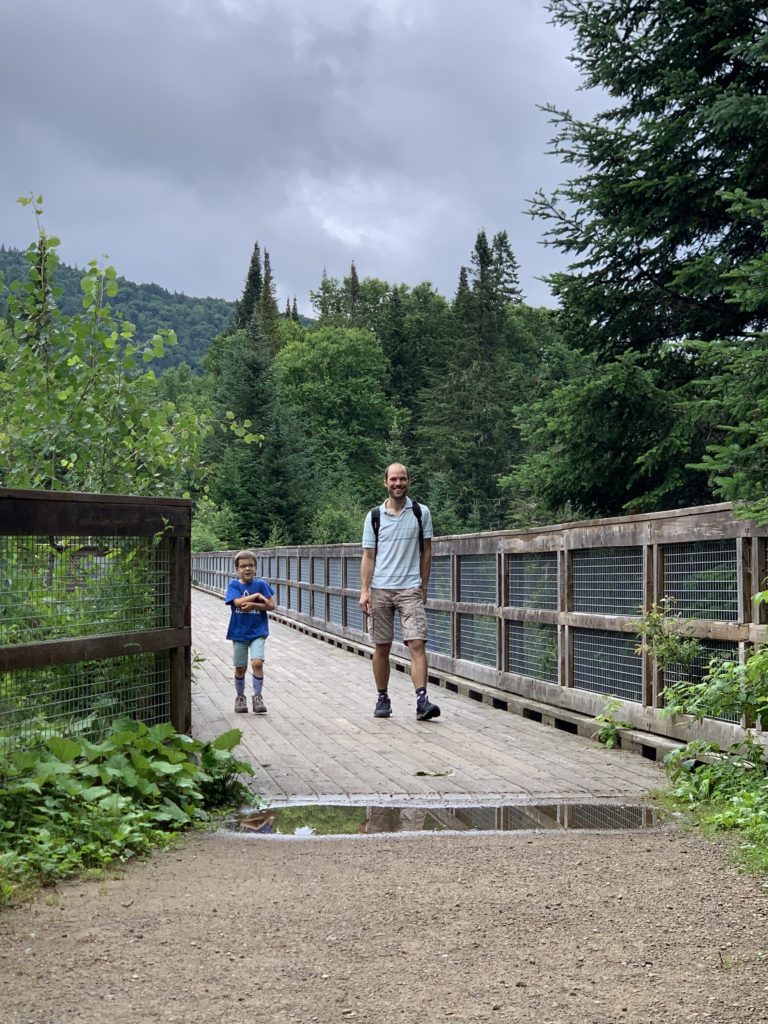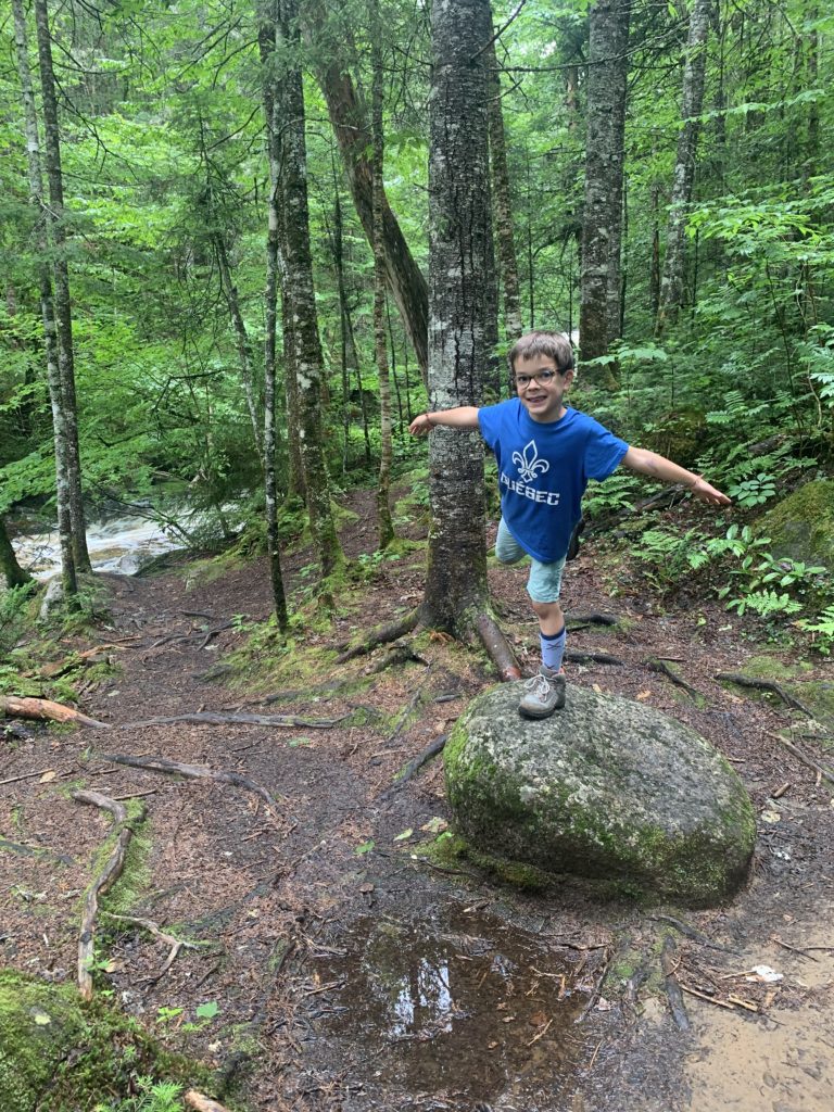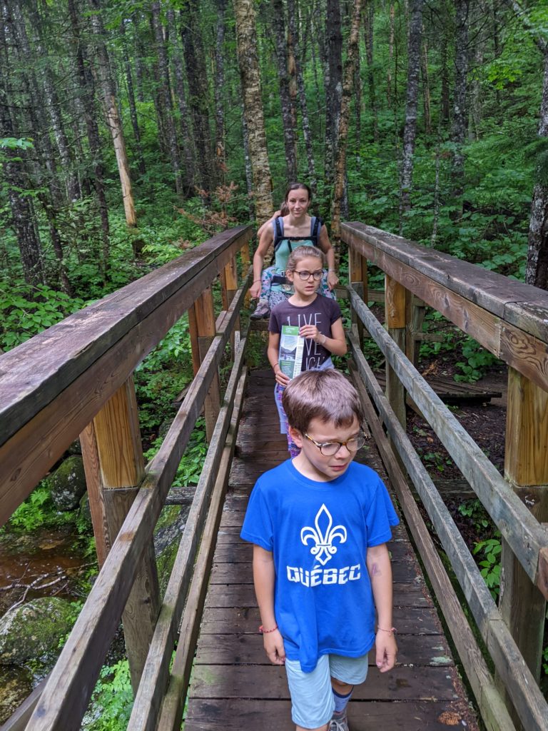 Il a beaucoup plu cette première nuit (et nous sommes ravis d’être au sec dans notre camping car !) et encore au réveil. Mais nous arrivons quand même à faire une jolie balade dans la forêt entre les gouttes le lendemain matin. Nous traversons la rivière Jaques Cartier, et longeant de petits cours d’eau.