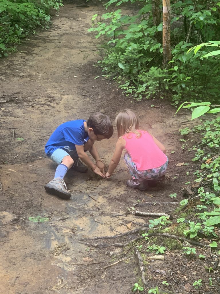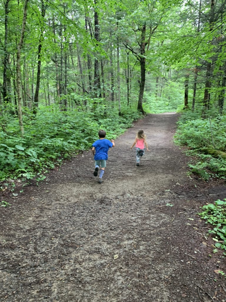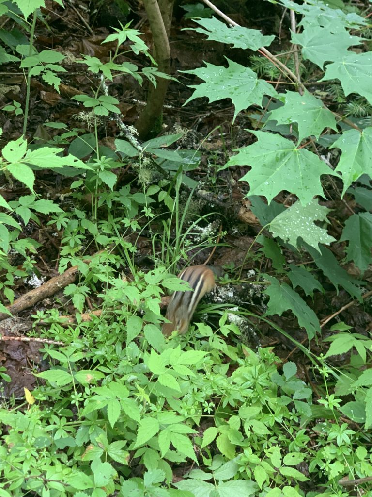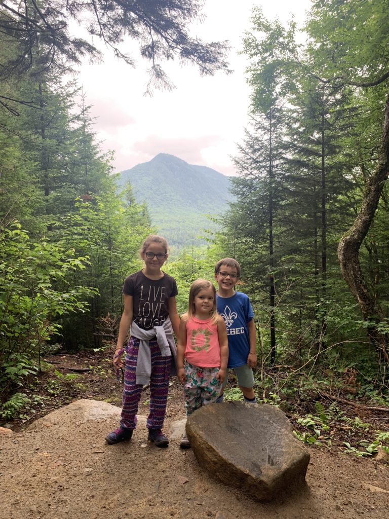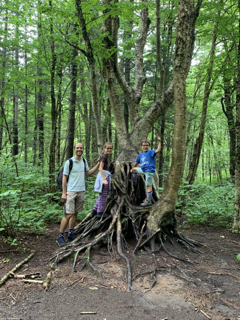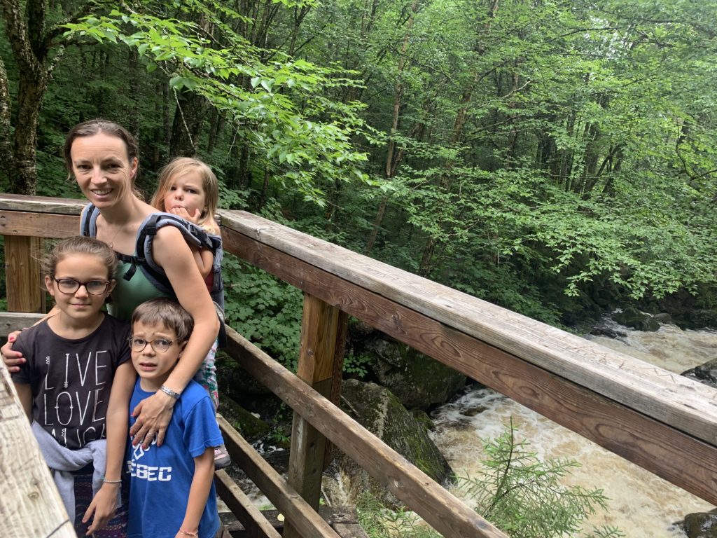 Il a beaucoup plu cette première nuit (et nous sommes ravis d’être au sec dans notre camping car !) et encore au réveil. Mais nous arrivons quand même à faire une jolie balade dans la forêt entre les gouttes le lendemain matin. Nous traversons la rivière Jaques Cartier, et longeant de petits cours d’eau.