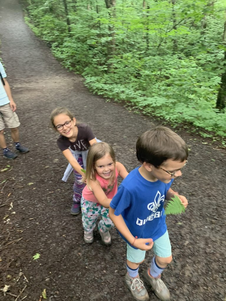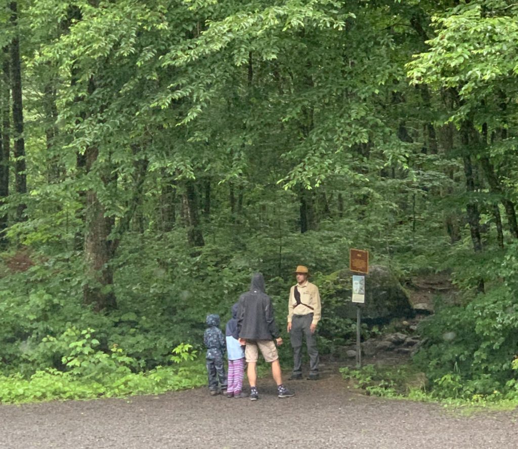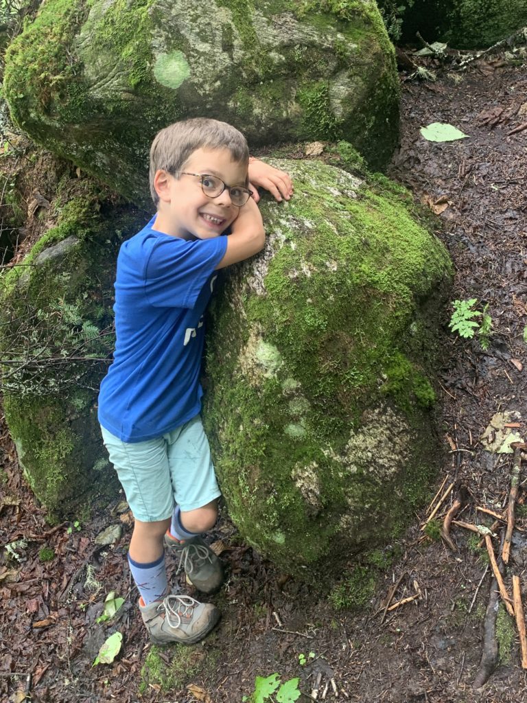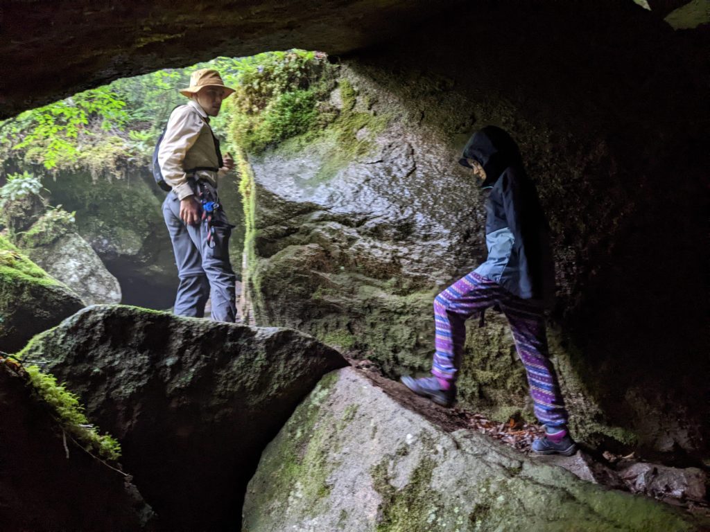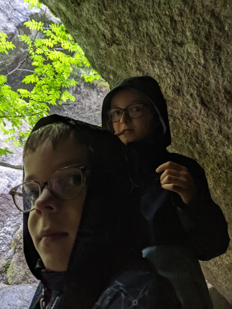 Il se remet à pleuvoir bien fort quand nous revenons de notre balade, mais après le déjeuner, nous allons quand même rejoindre le point de rendez-vous de la visite que nous avions réservé pour l’après-midi. Pendant qu’Odile fait sa sieste à l’abri dans le camping-car, Lucie, Émile et Thomas rejoignent le ranger pour une balade (privée !) guidée sous d’énormes roches, à la découvertes de mousses et lichens. Ils ne reviennent pas complètement trempés, et nous retournons à notre parking pour dormir.