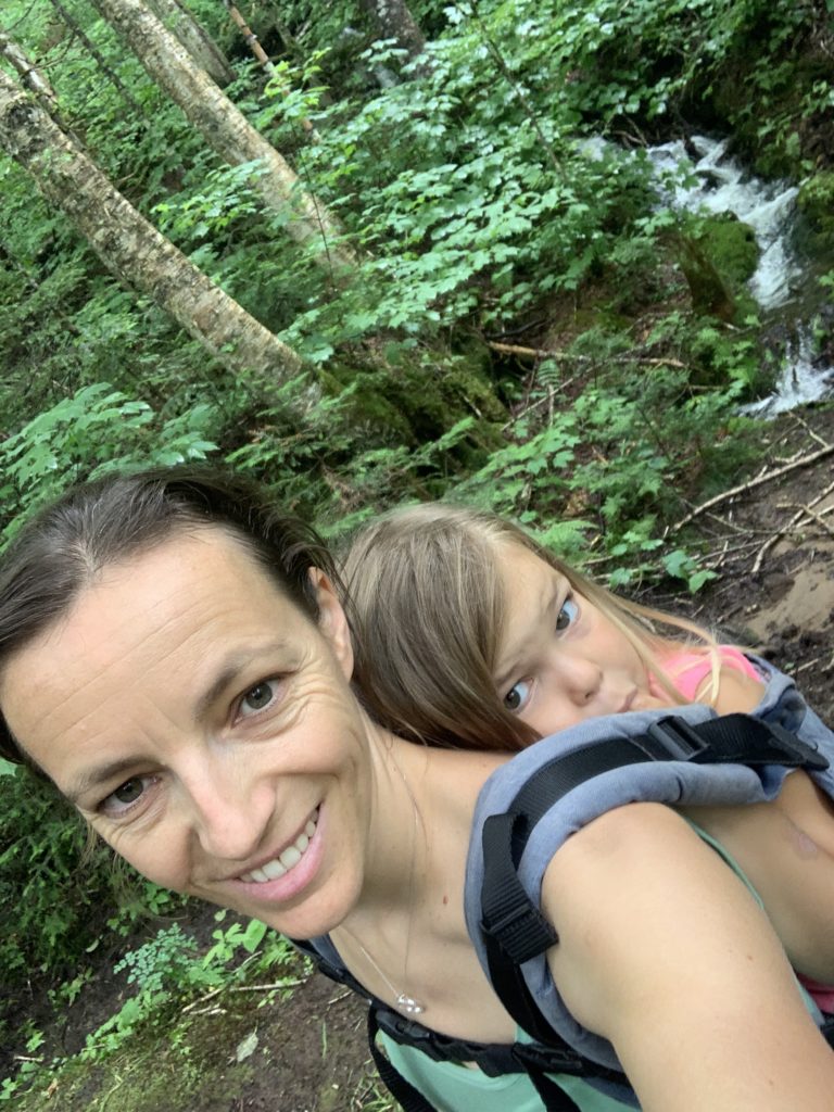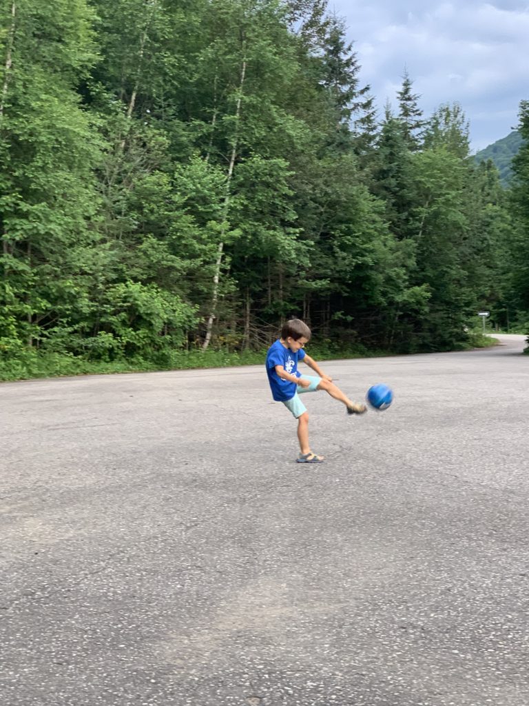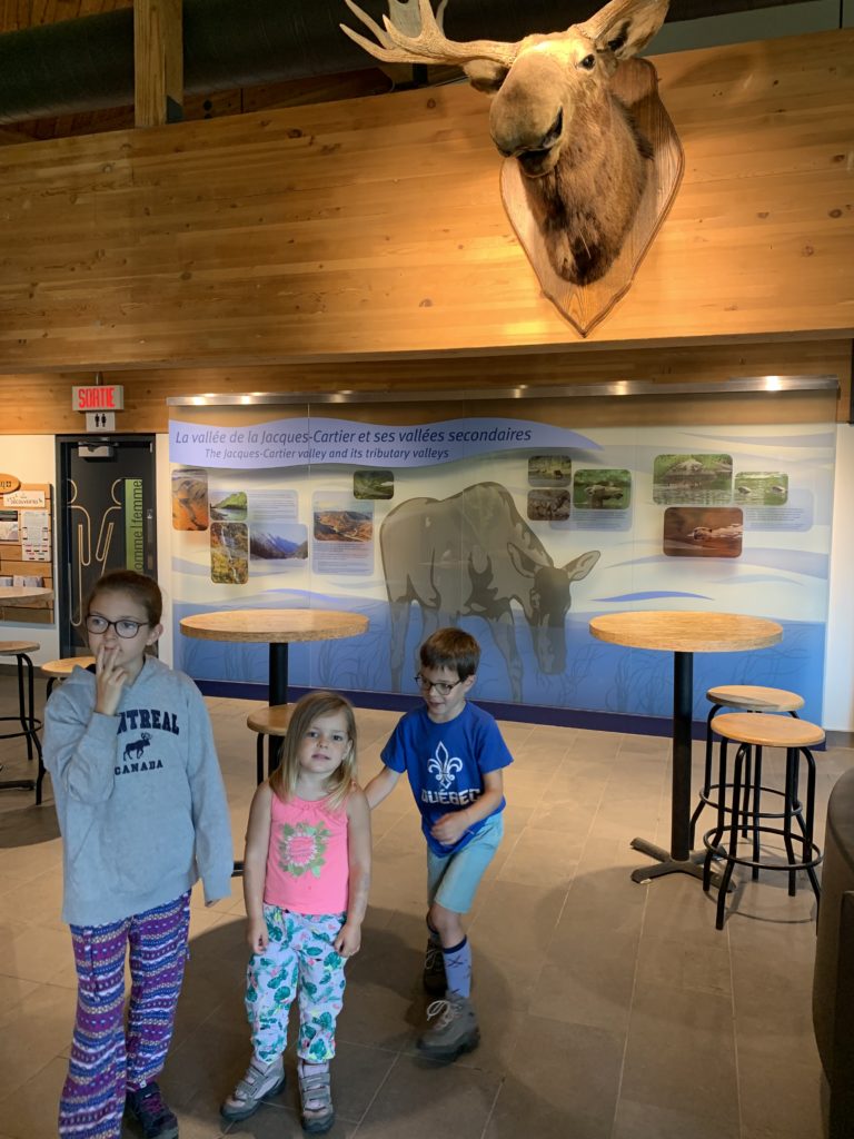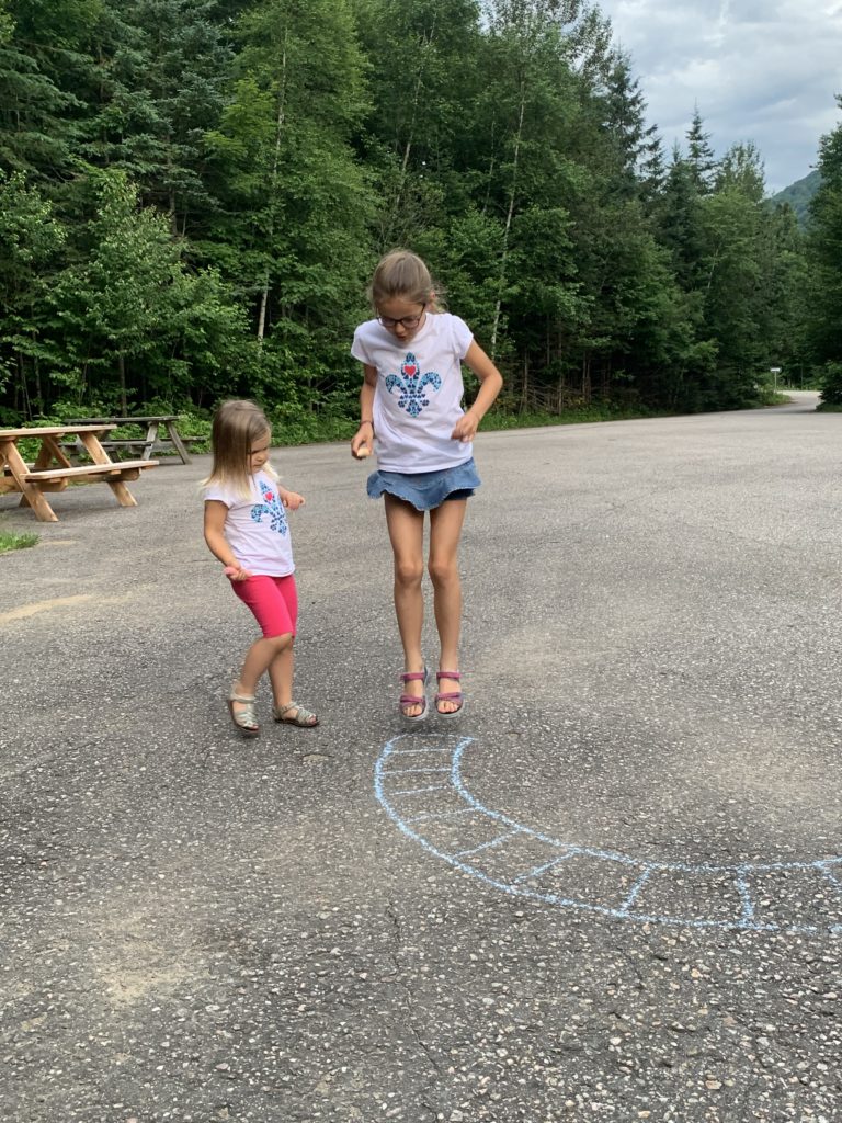 Notre première étape est le Parc National de la Jacques Cartier. Nous avions réservé une place de camping pour deux nuit. En fait, il s’agit d’une place sur un parking de camping car, ce n’est pas le plus bucolique, mais Émile est ravi de pouvoir taper dans son ballon, et les filles de pouvoir dessiner avec les craies.