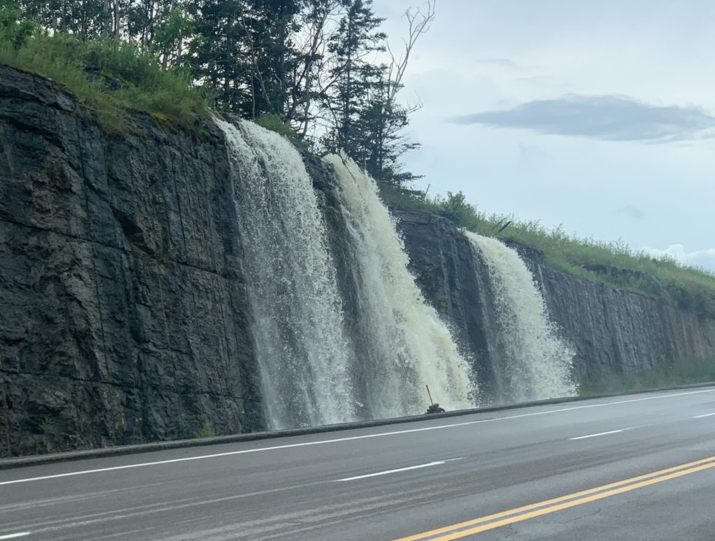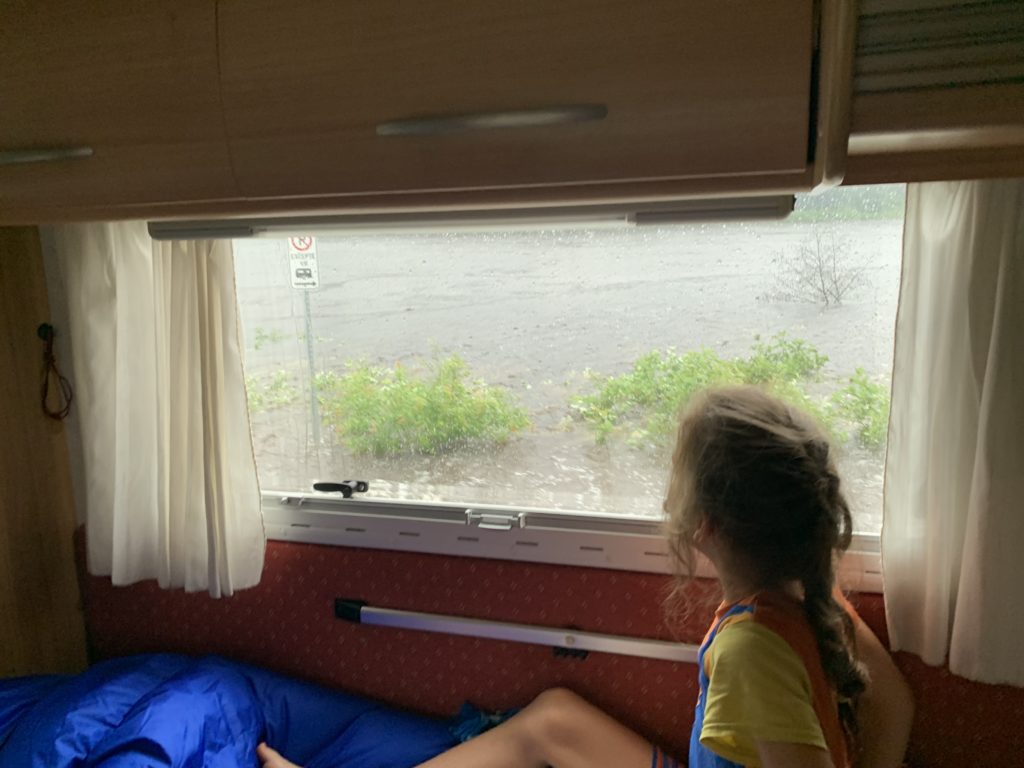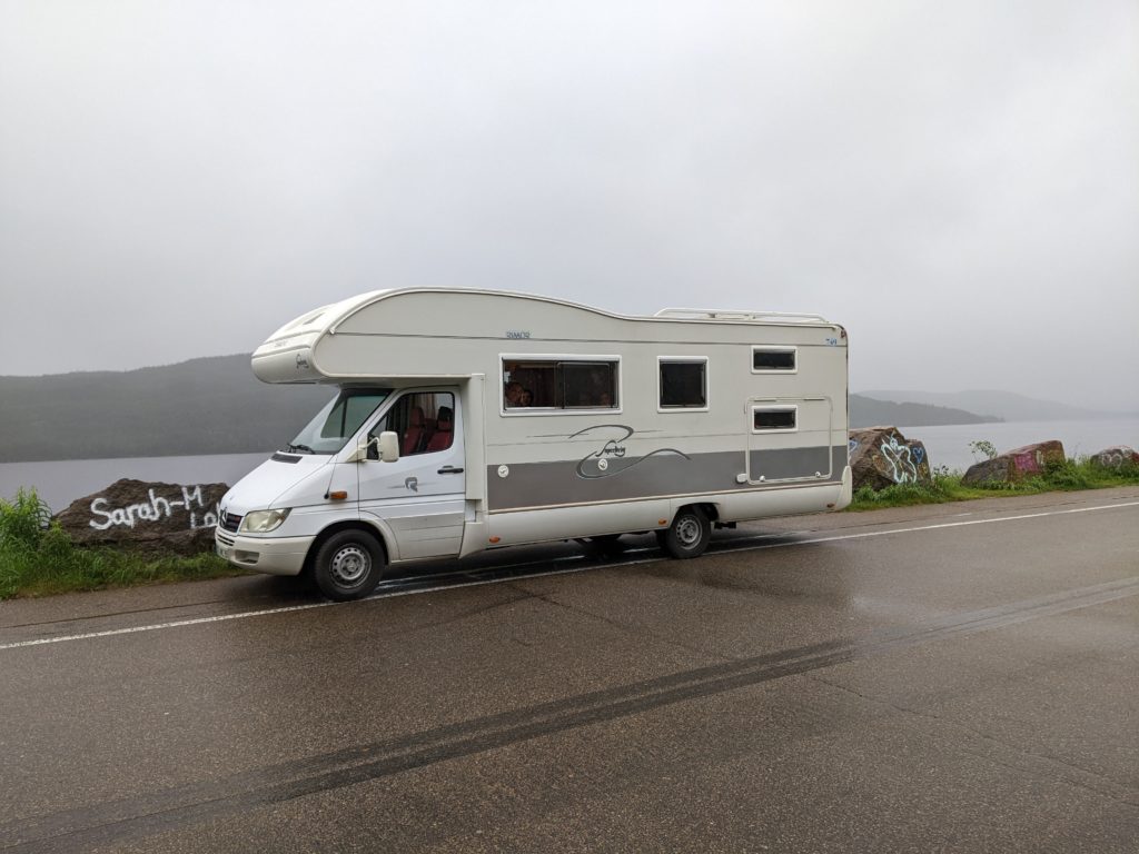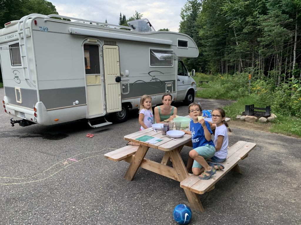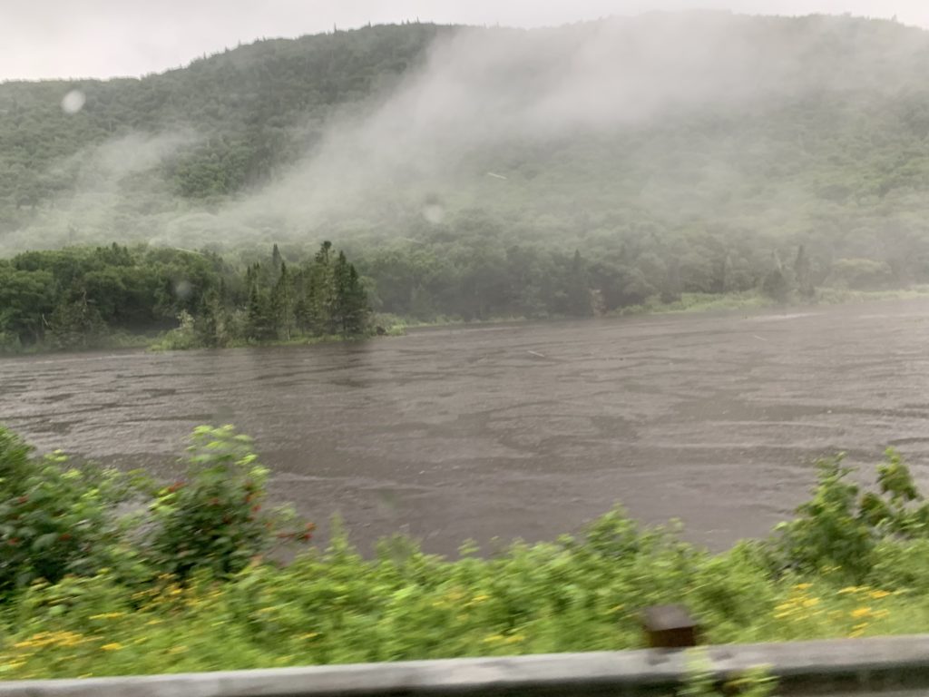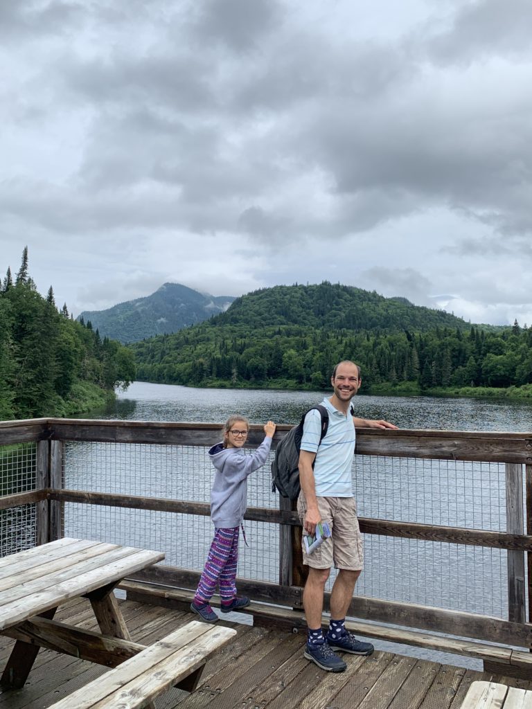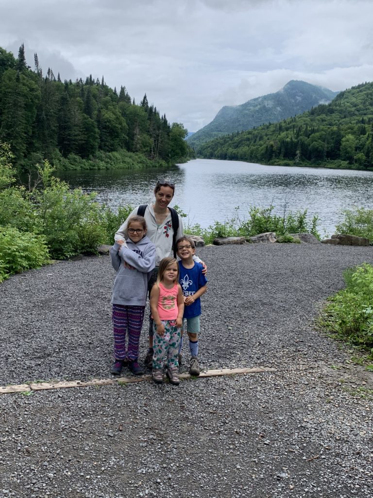 Il a plu (fort !) toute la soirée et la nuit, et le lendemain matin, nous sommes réveillés à 7h par un ranger qui nous dit qu’il faut quitter immédiatement le parc, car la rivière commence à déborder sur la route ! Ni une, ni deux, nous partons, avec les enfants encore endormis ! Nous nous arrêtons très vite après pour un petit-déjeuner bien bucolique, au bord du lac Jacques Cartier (what else !).