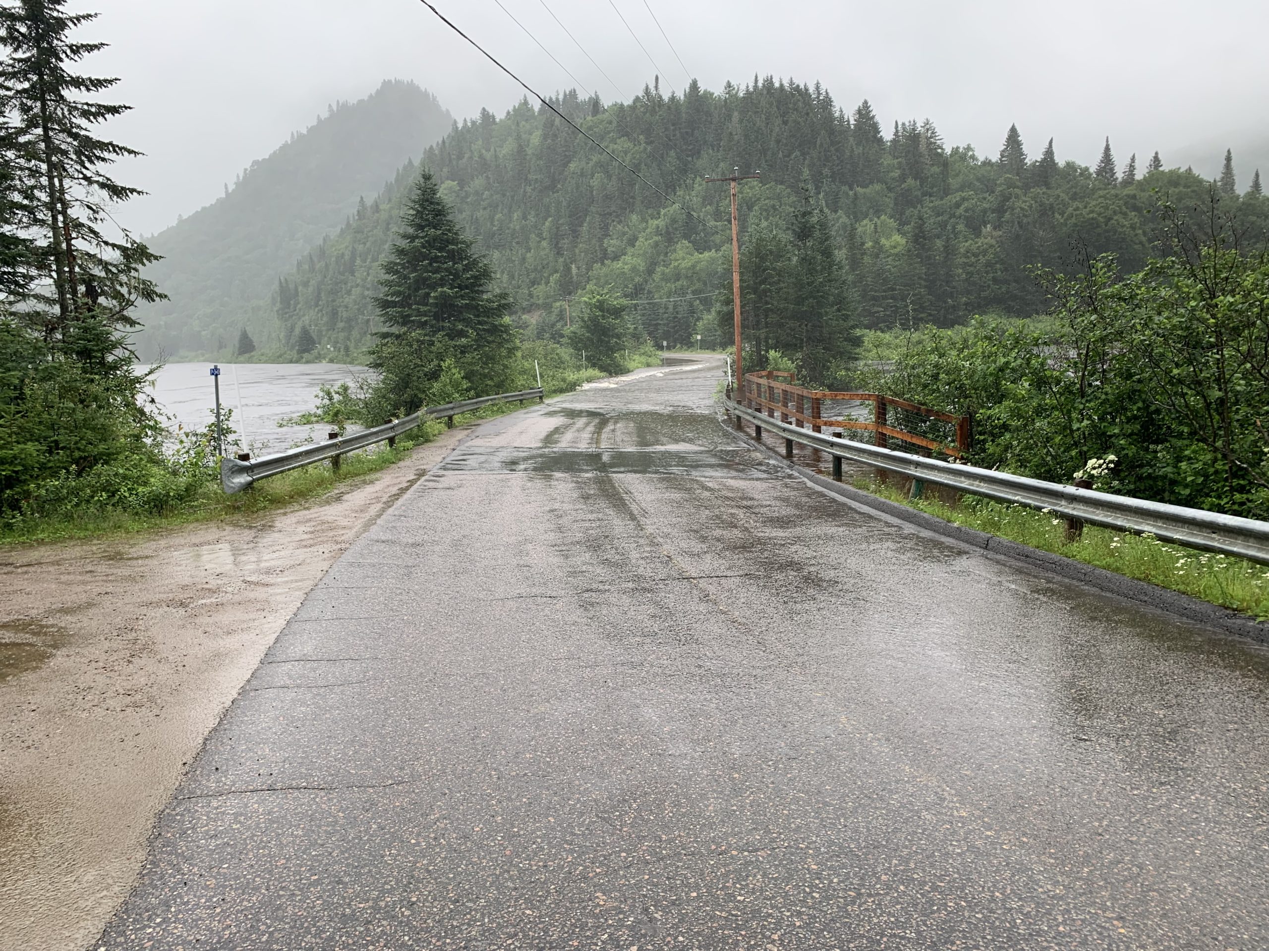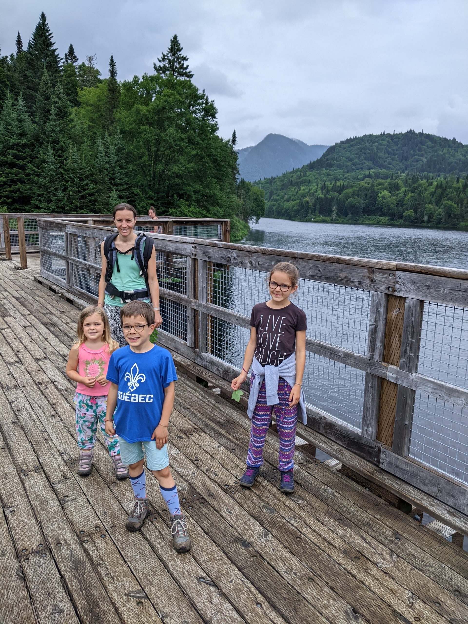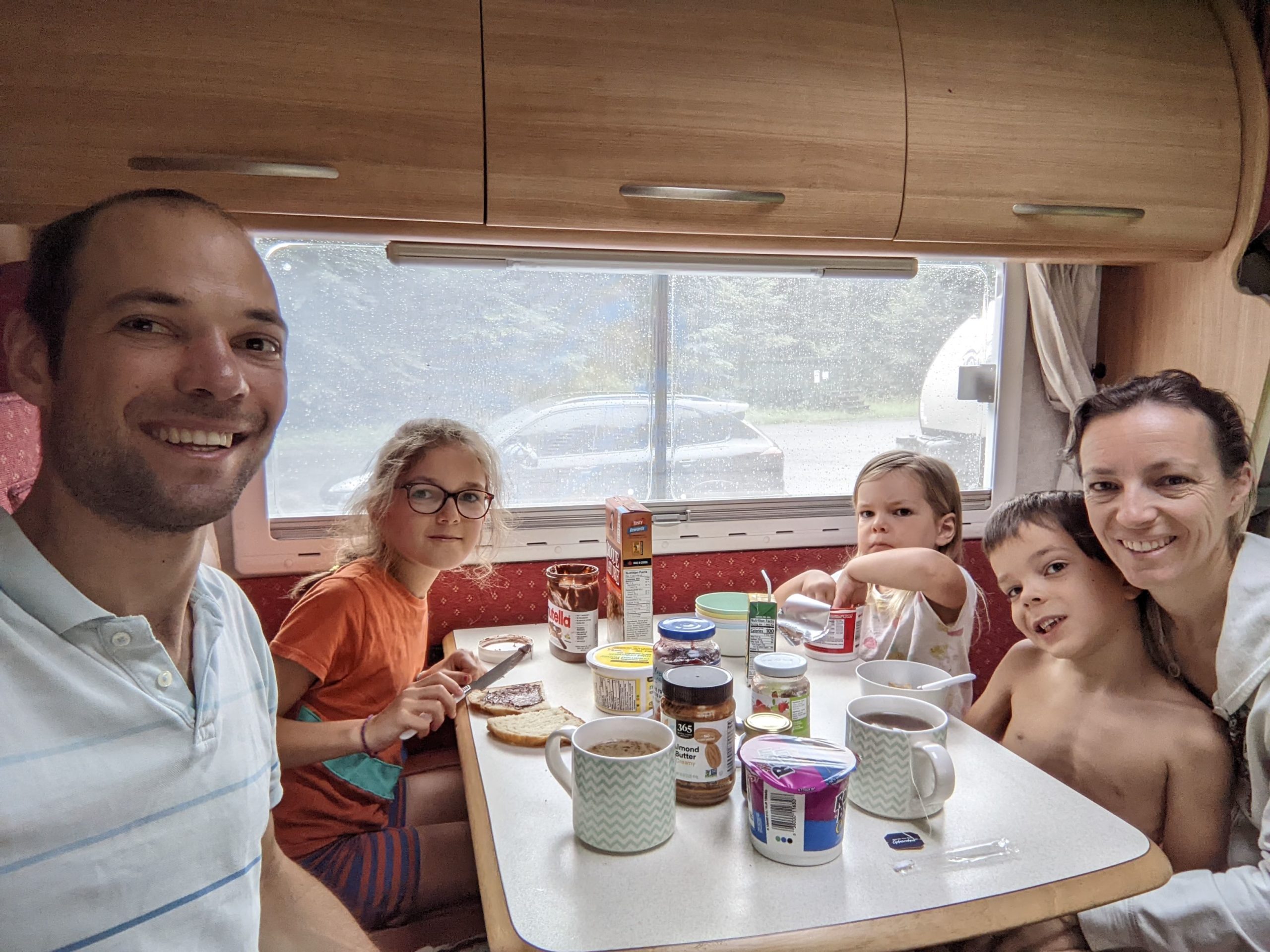 Il a plu (fort !) toute la soirée et la nuit, et le lendemain matin, nous sommes réveillés à 7h par un ranger qui nous dit qu’il faut quitter immédiatement le parc, car la rivière commence à déborder sur la route ! Ni une, ni deux, nous partons, avec les enfants encore endormis ! Nous nous arrêtons très vite après pour un petit-déjeuner bien bucolique, au bord du lac Jacques Cartier (what else !).