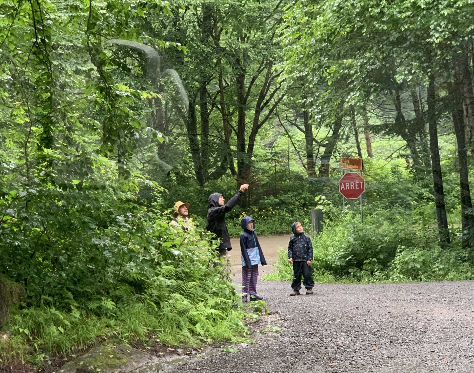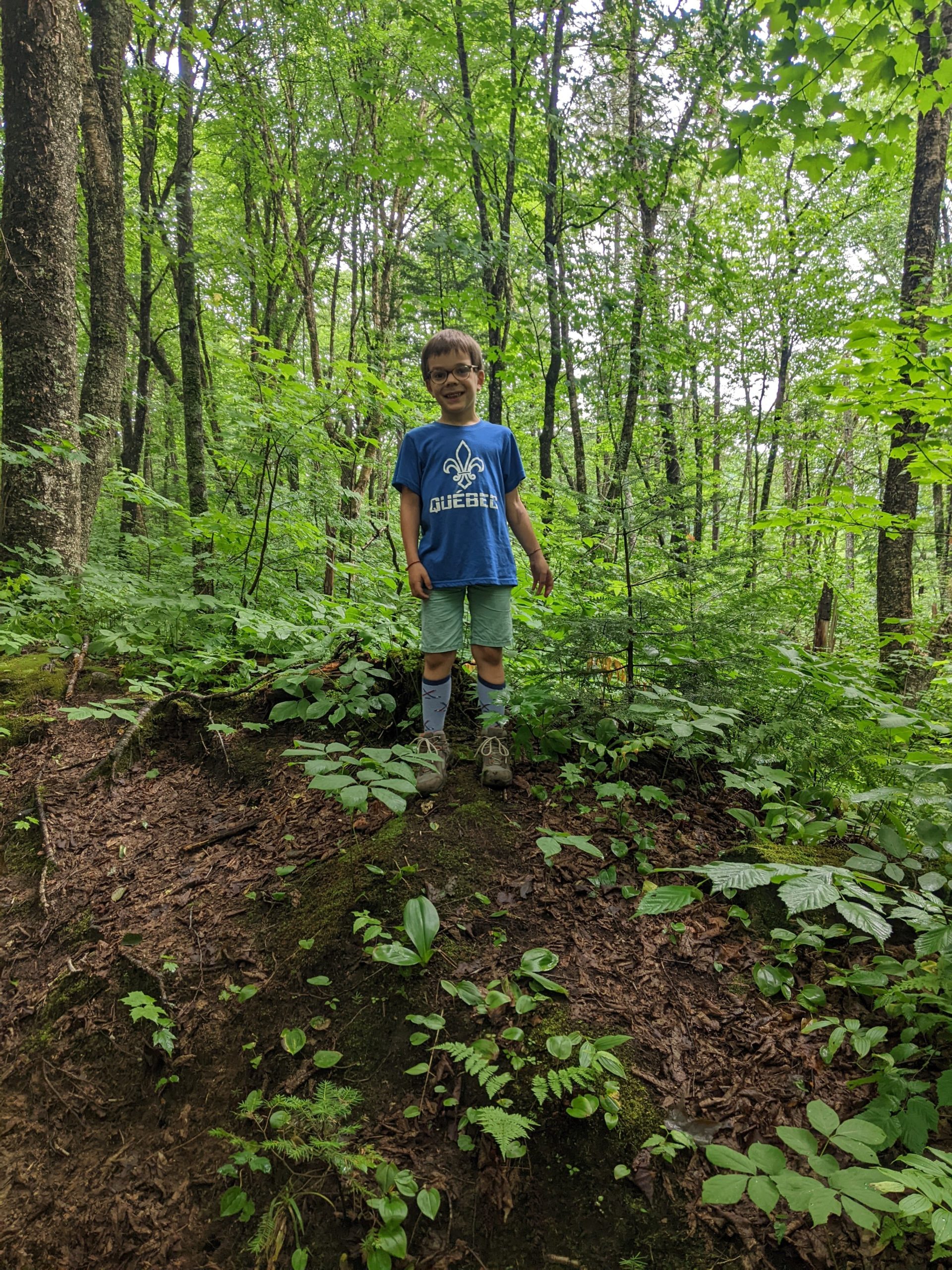 Il a beaucoup plu cette première nuit (et nous sommes ravis d’être au sec dans notre camping car !) et encore au réveil. Mais nous arrivons quand même à faire une jolie balade dans la forêt entre les gouttes le lendemain matin. Nous traversons la rivière Jaques Cartier, et longeant de petits cours d’eau.