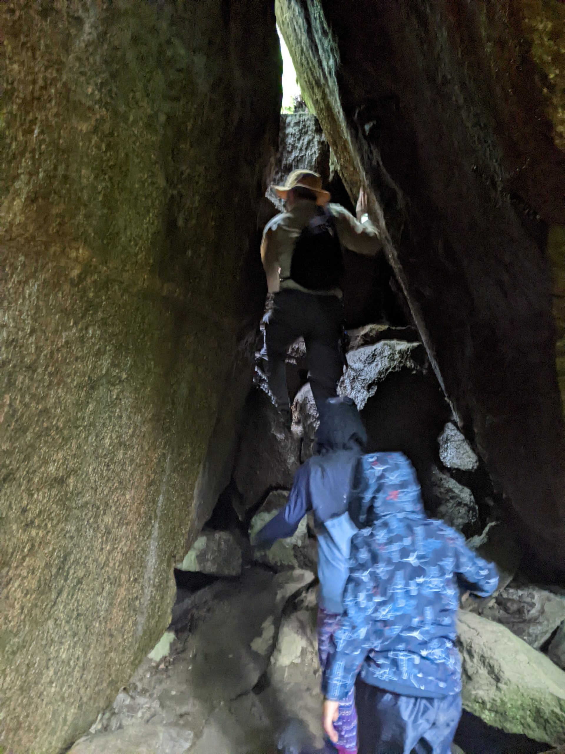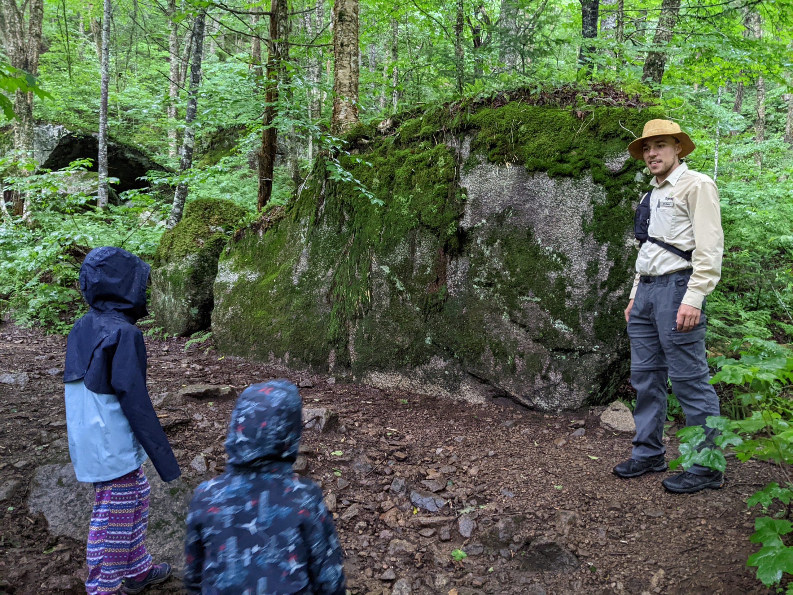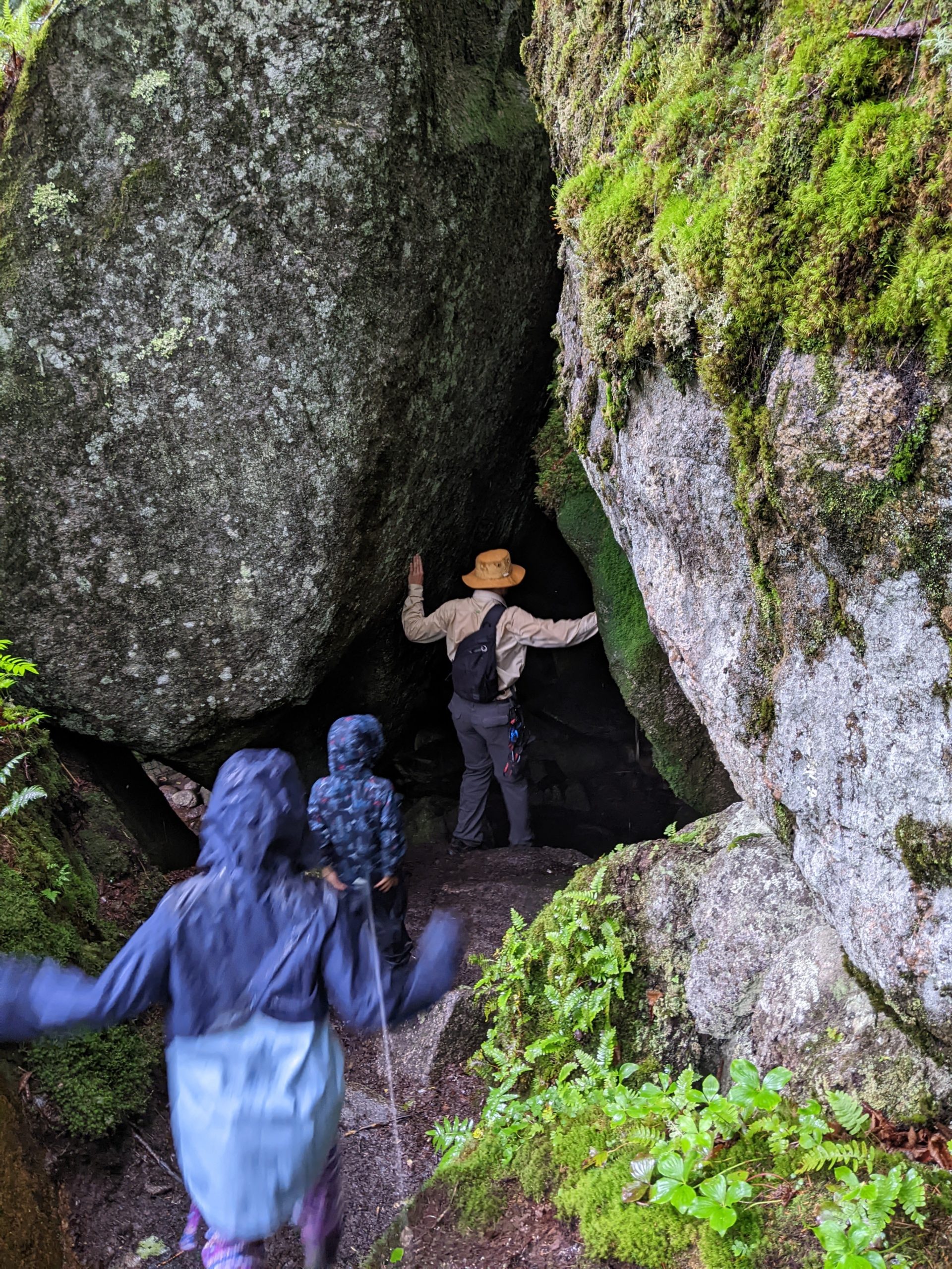 Il se remet à pleuvoir bien fort quand nous revenons de notre balade, mais après le déjeuner, nous allons quand même rejoindre le point de rendez-vous de la visite que nous avions réservé pour l’après-midi. Pendant qu’Odile fait sa sieste à l’abri dans le camping-car, Lucie, Émile et Thomas rejoignent le ranger pour une balade (privée !) guidée sous d’énormes roches, à la découvertes de mousses et lichens. Ils ne reviennent pas complètement trempés, et nous retournons à notre parking pour dormir.