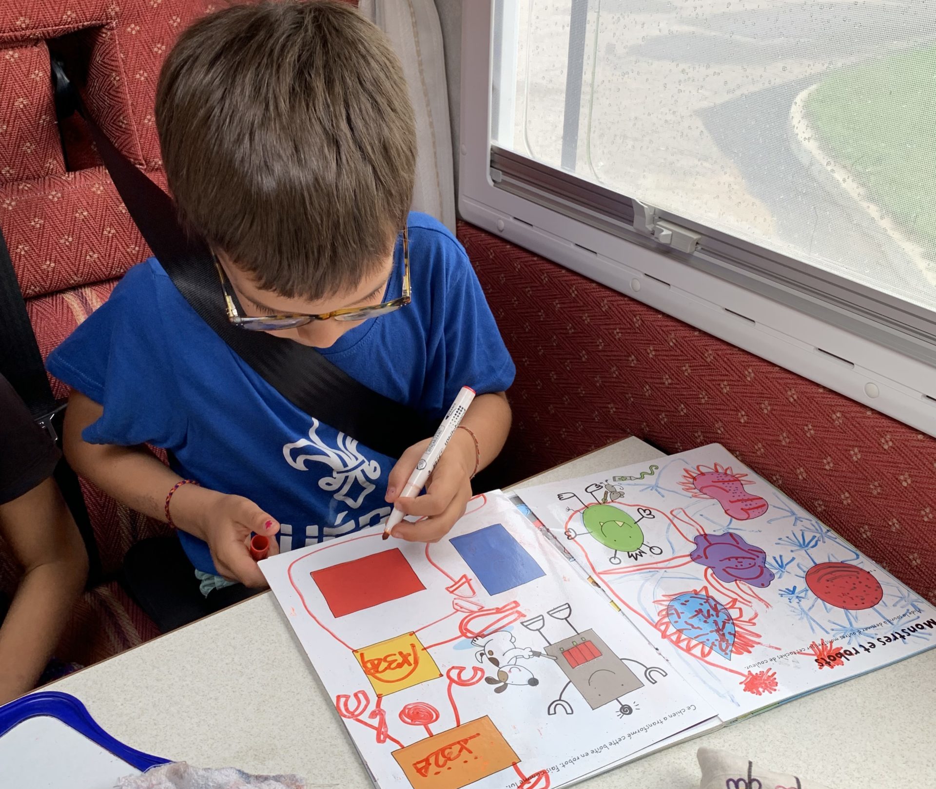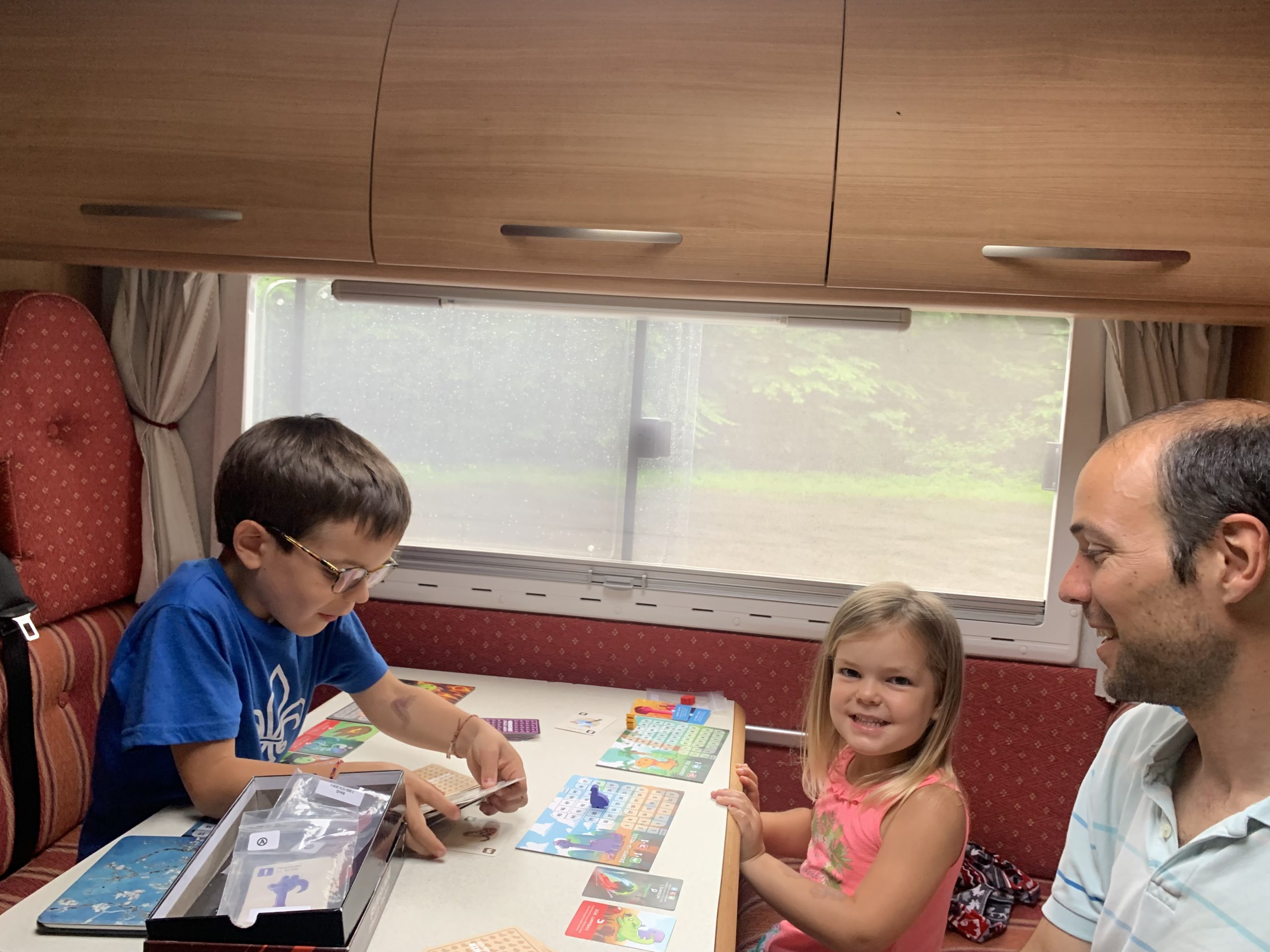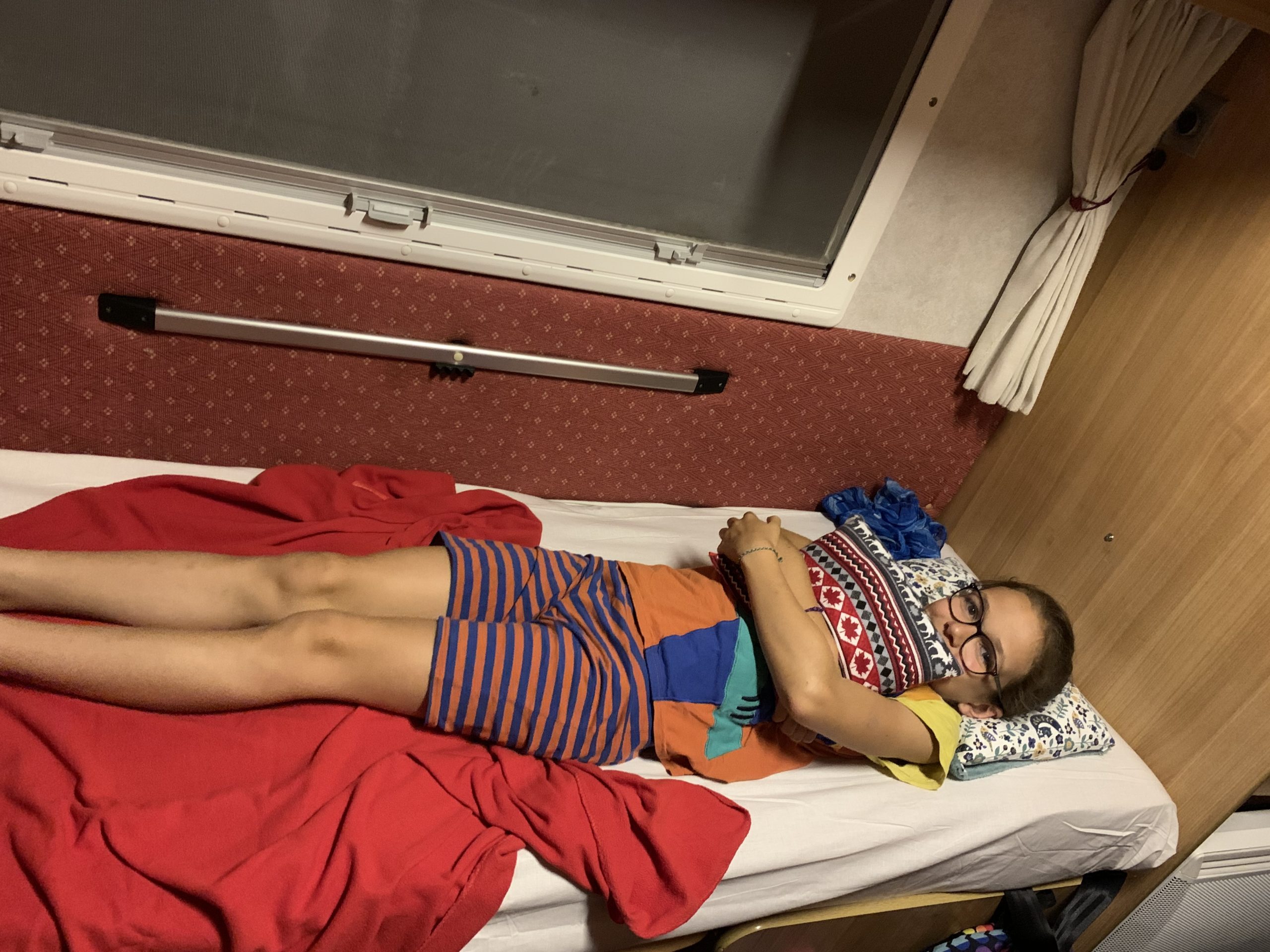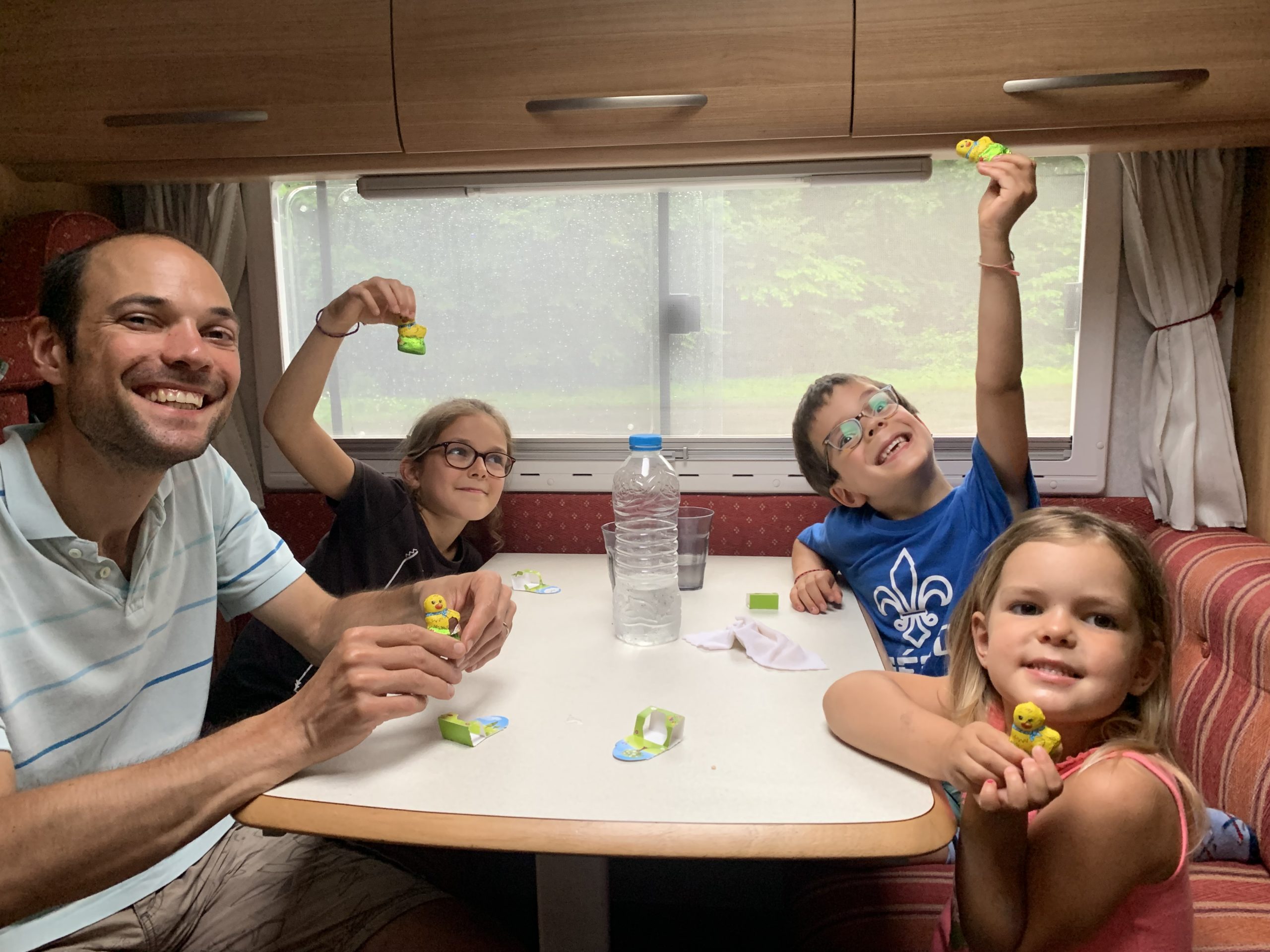 Et tout le monde est ravi de s’installer pour la première nuit dans le camping car ! Odile et Émile dorment dans des lits superposés au fond du véhicule (isolés par de petits rideaux); Lucie dort dans l’espace central, où les banquettes se transforment en lit; et Thomas et moi dormons sur un lit au dessus du chauffeur.