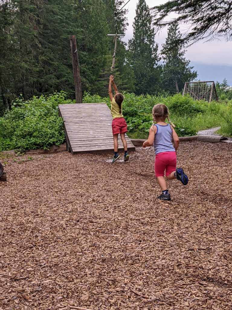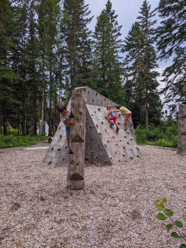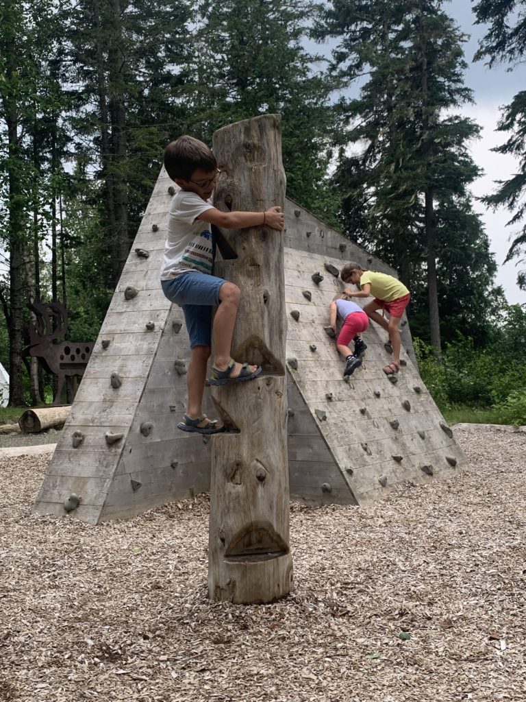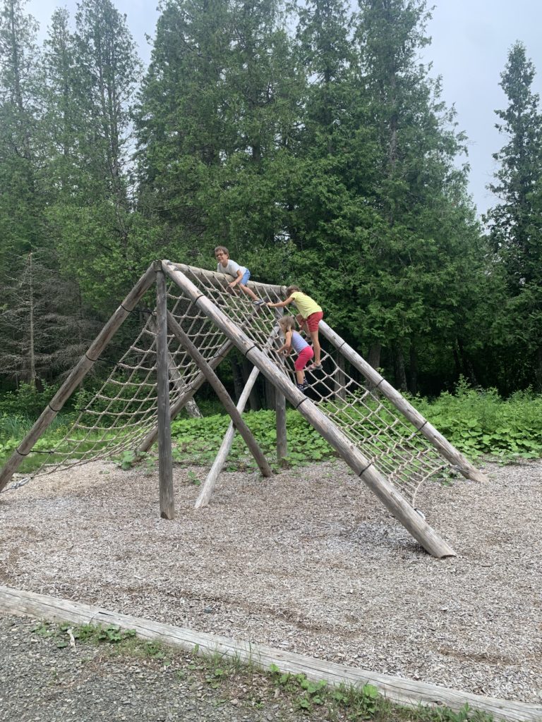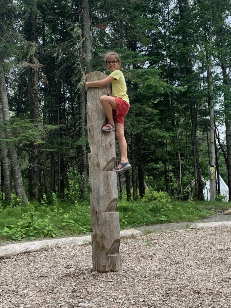 Nous avions juste commencé le parcours ludique quand l’averse est arrivée. Heureusement, nous avons pu nous réfugier au sec, et après quelques jeux, la pluie s’était arrêtée. Les enfants ont pu retourner profiter du parcours, avant que nous reprenions la route direction le New Brunswick !