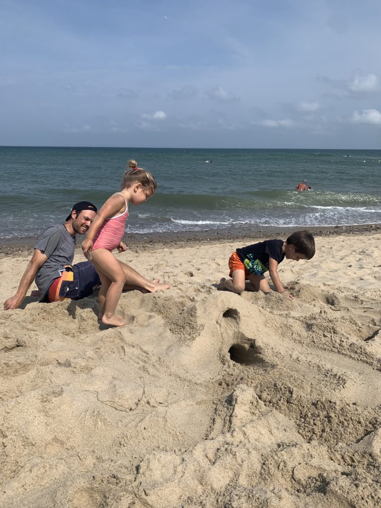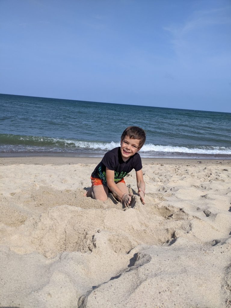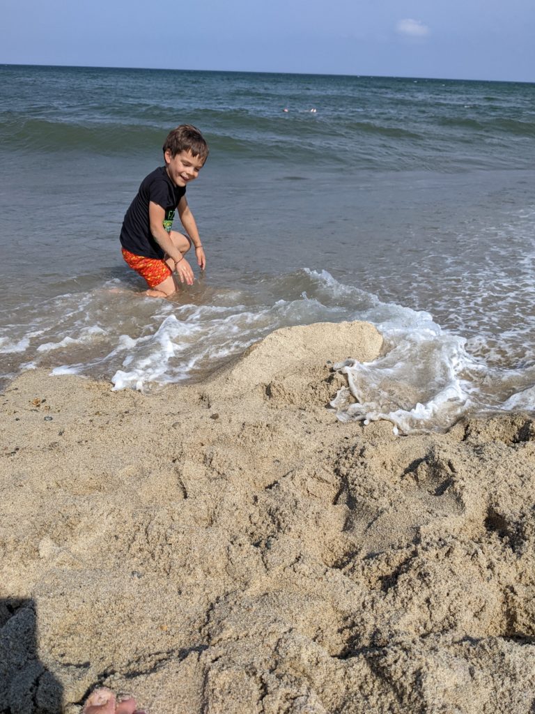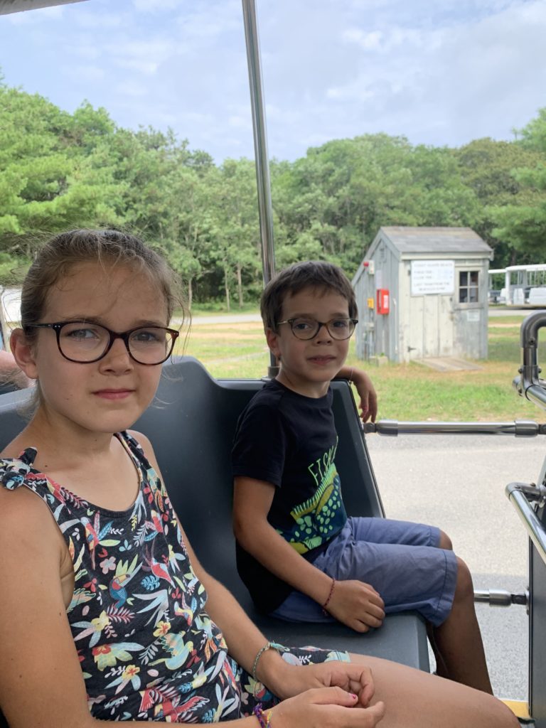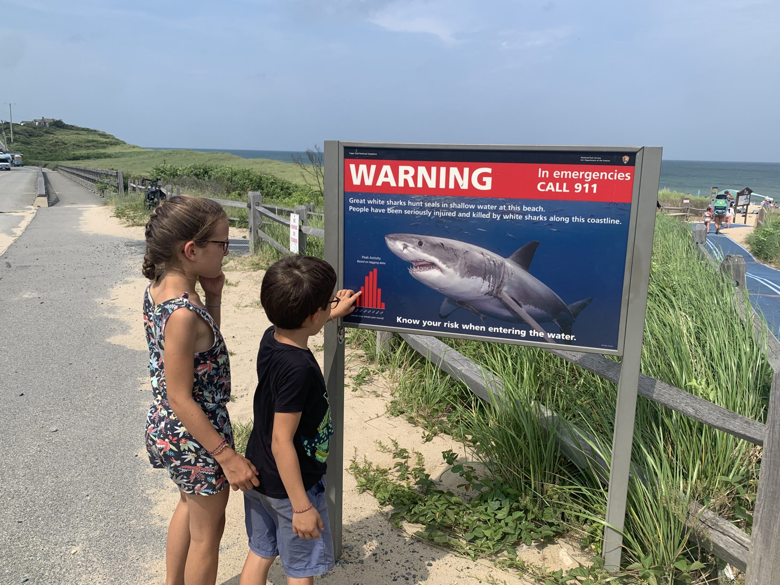 Nous sommes ensuite allés sur la plage, qui n’est accessible que par un petit trolley. Devant la plage se trouvait un panneau “attention aux requins”. En effet, comme les phoques sont nombreux près de Cape Cod, les requins blancs mangeurs de phoques aussi ! C’est d’ailleurs sur Cape Cod qu’a été tourné le film “Les dents de la mer”. Nous avons appris après qu’un requin avait été aperçu cette semaine sur la plage juste au nord de la nôtre. Mais nous n’en avons vu aucun, et les maîtres nageurs qui surveillaient non plus.