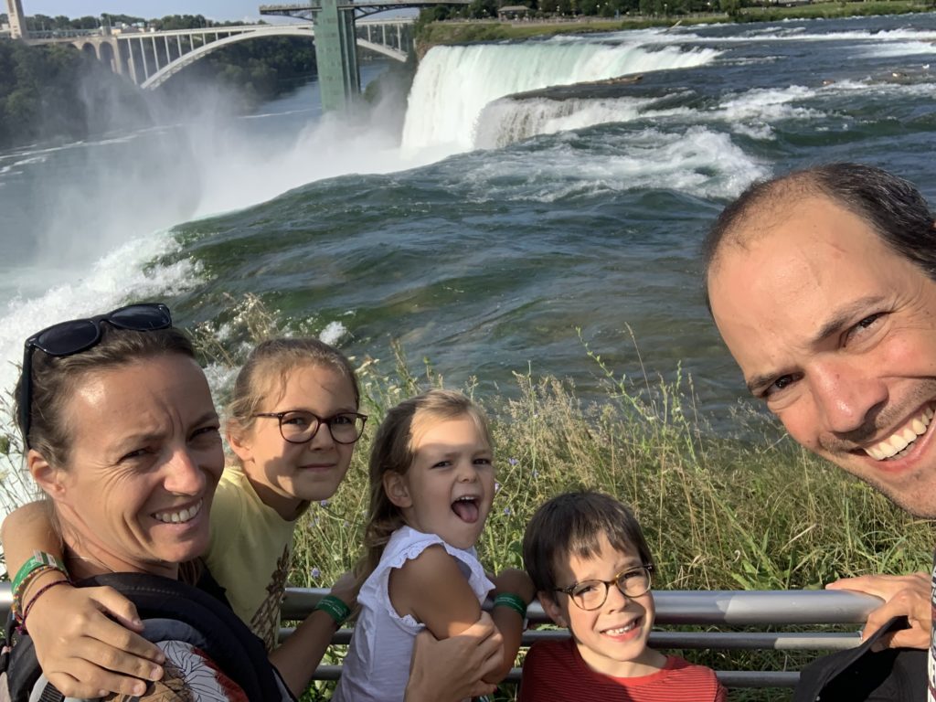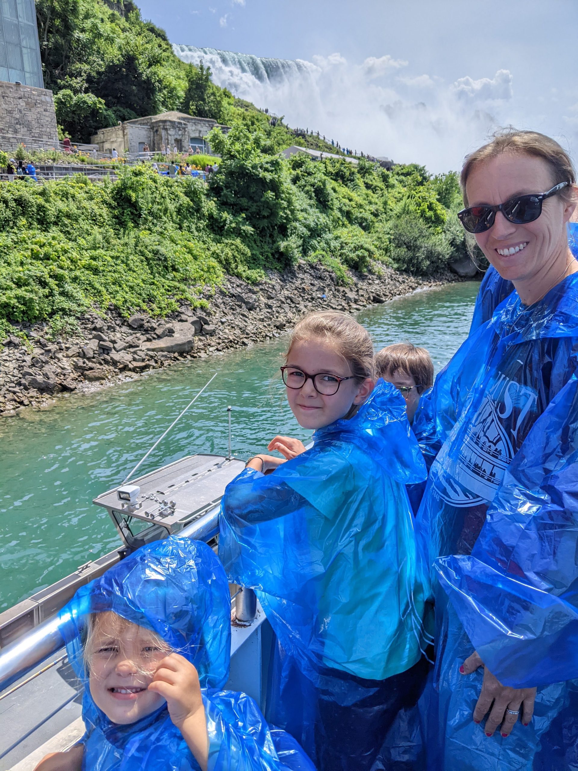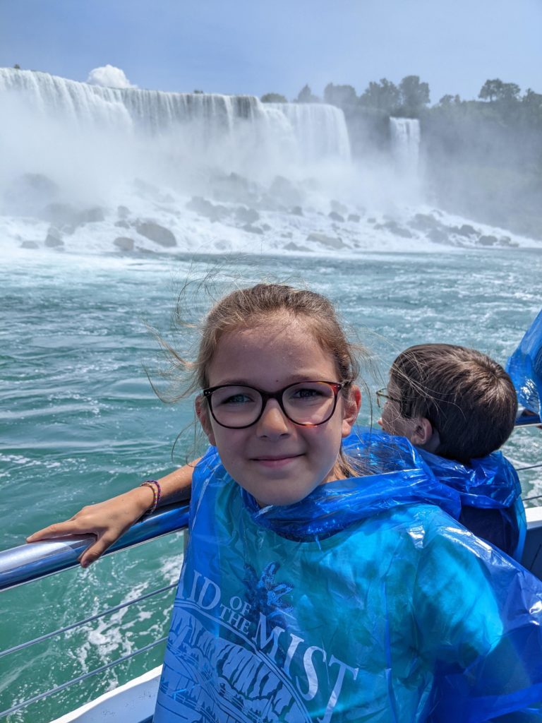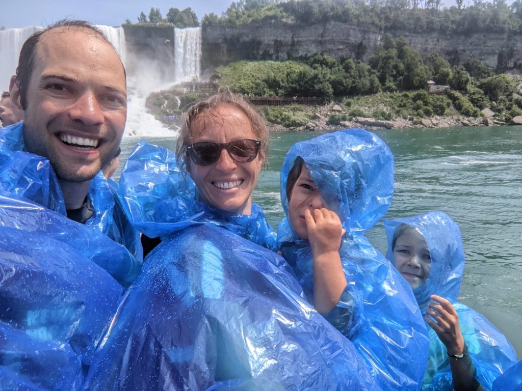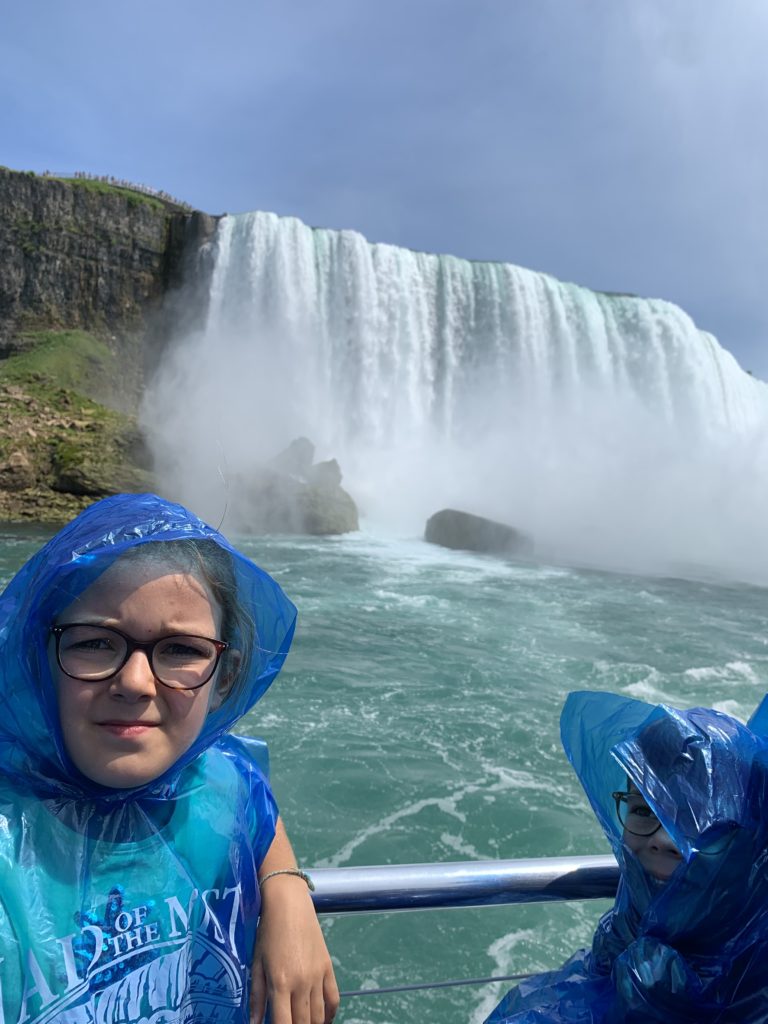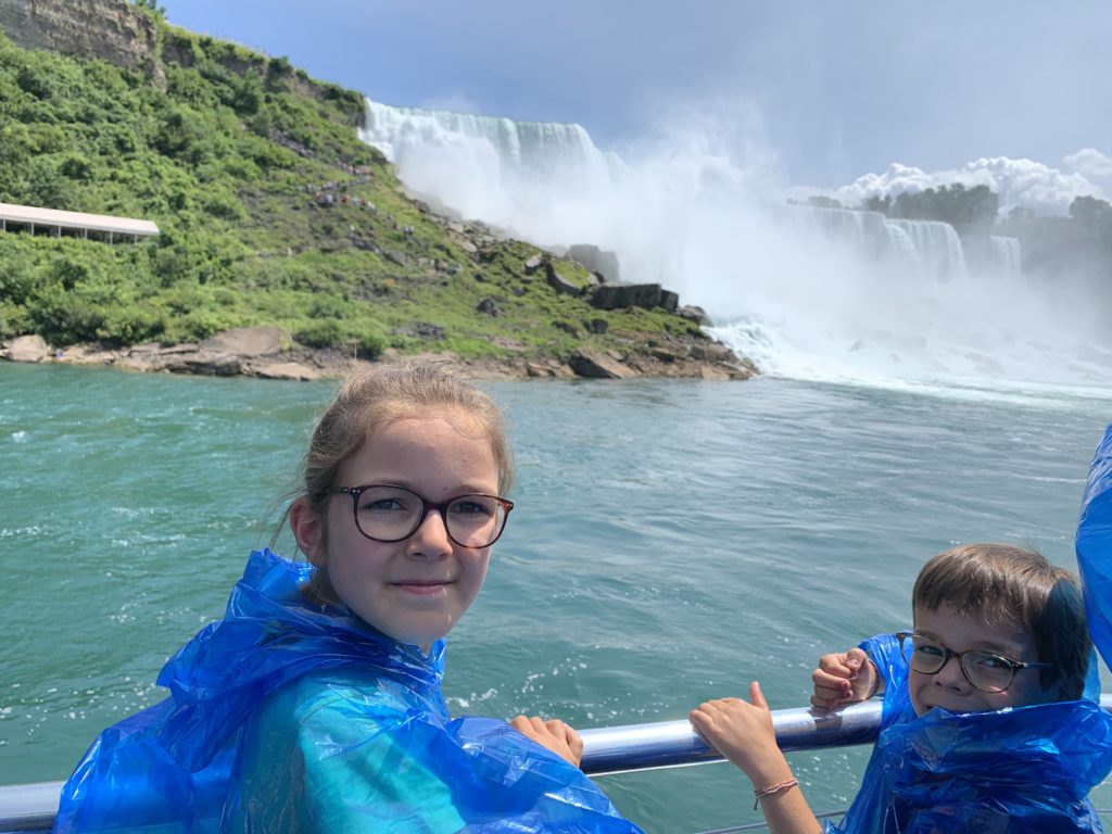 Nous avons fait le tour en bateau depuis le côté américain, avec des manteau bleus (les américains étaient rouges). Les enfants ont été très impressionnés de la vue des chutes, mais pas tellement ravis de prendre leur douche (pourtant bien utile 😉 ).