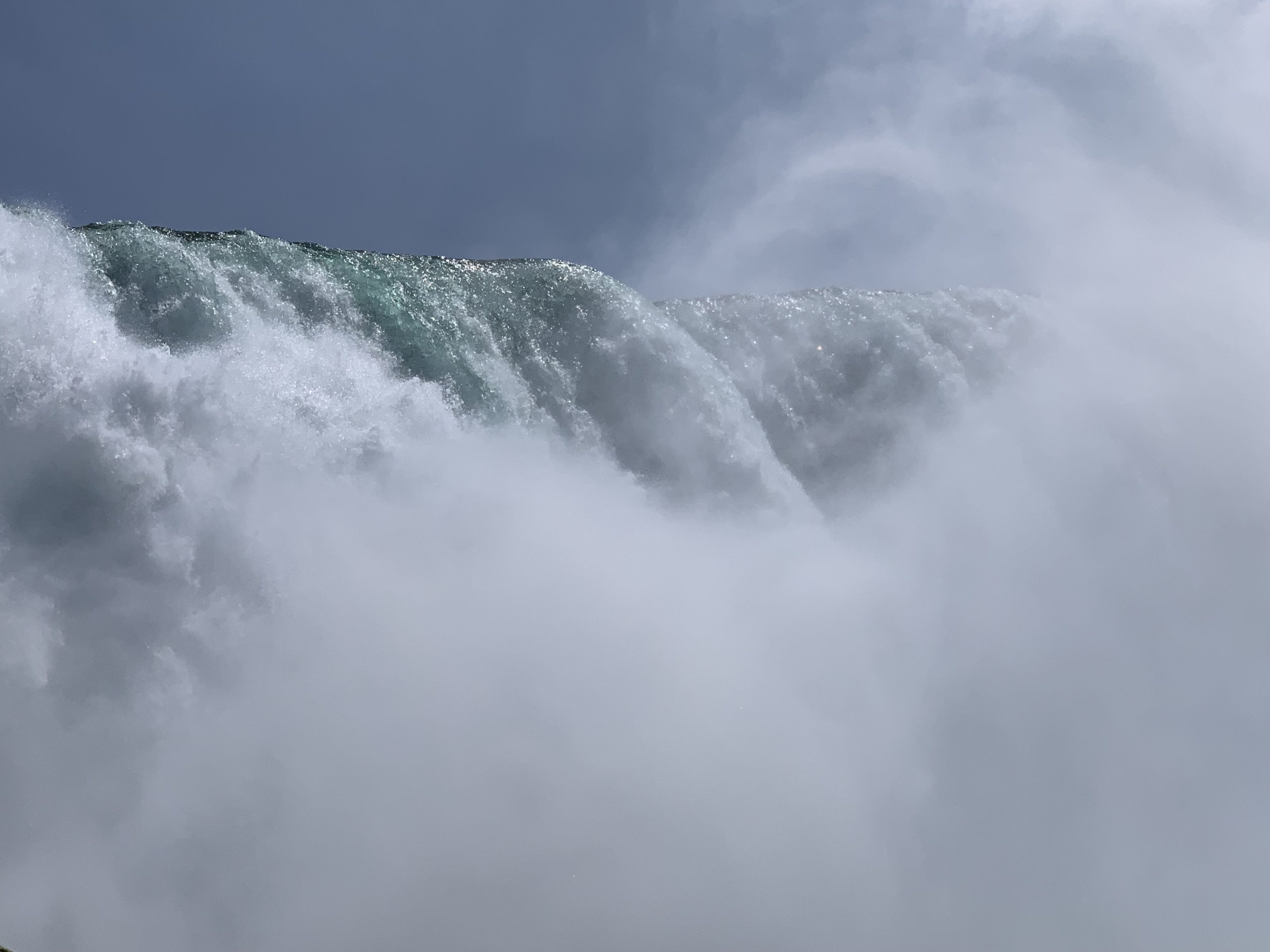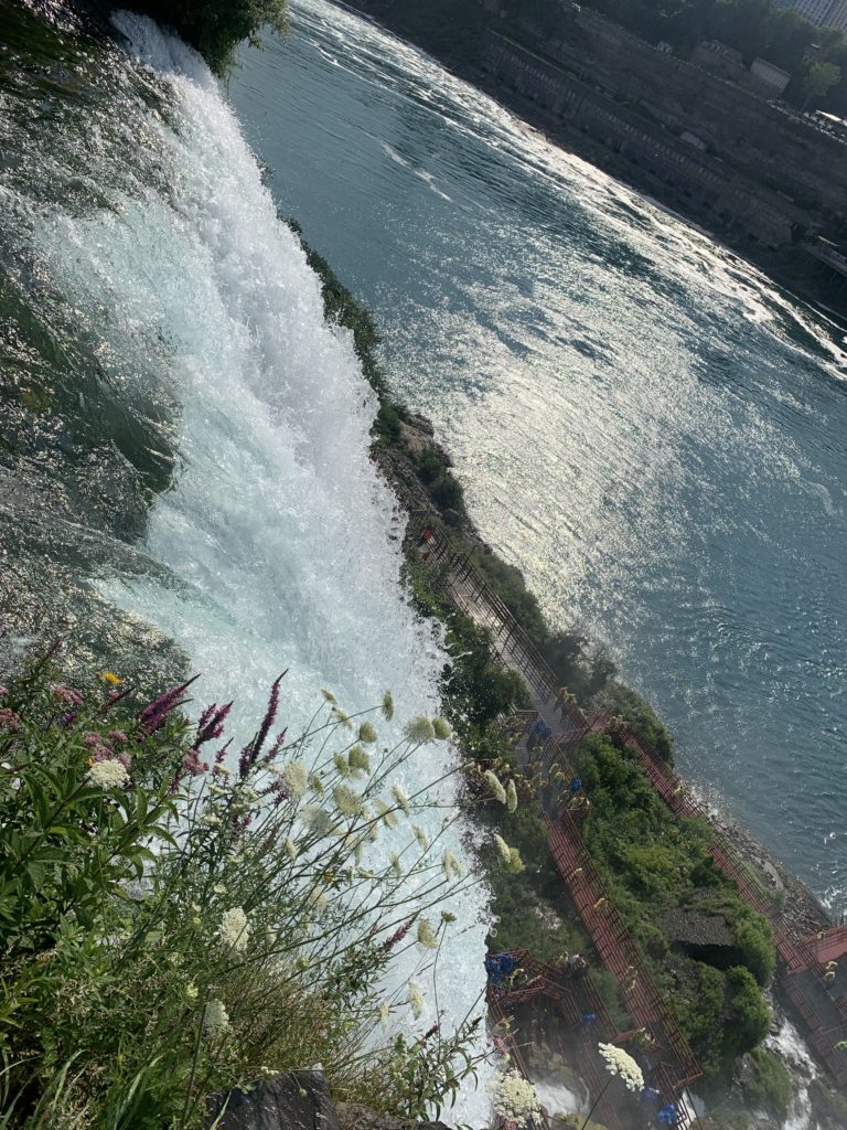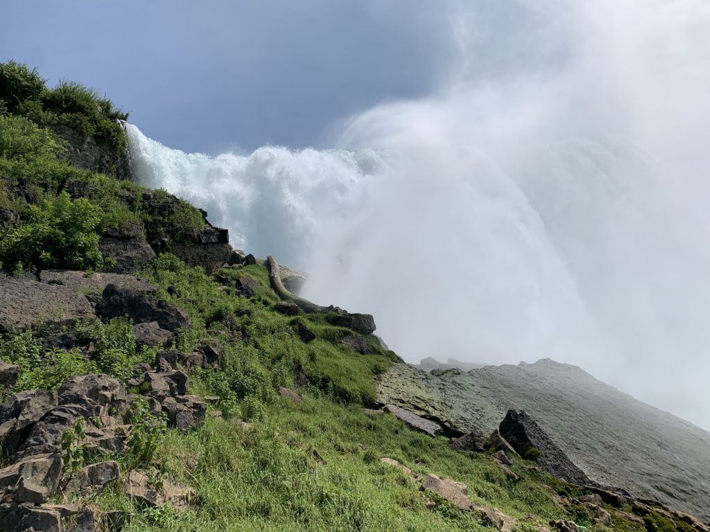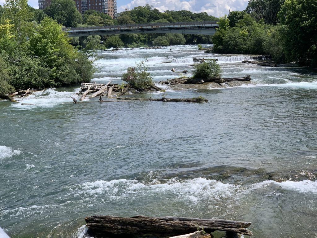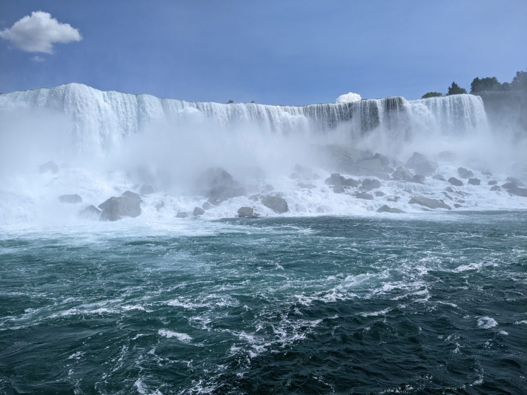 Du côté américain, nous avons garé notre camping car sur l’île Goat Island, au milieu de la rivière. Nous avons ensuite marché, en traversant les rapides qui précèdent les chutes (pas si impressionnant que ça étant donné ce qui vient juste en dessous !), jusqu’au point de départ du bateau.