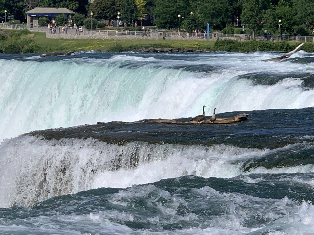 Le trolley nous a ensuite rapproché de la petite île entre les American Falls et les Bridal Veil Falls. Nous étions alors vraiment très près des chutes. Les outardes, elles, n’étaient visiblement pas dérangées par le bruit !