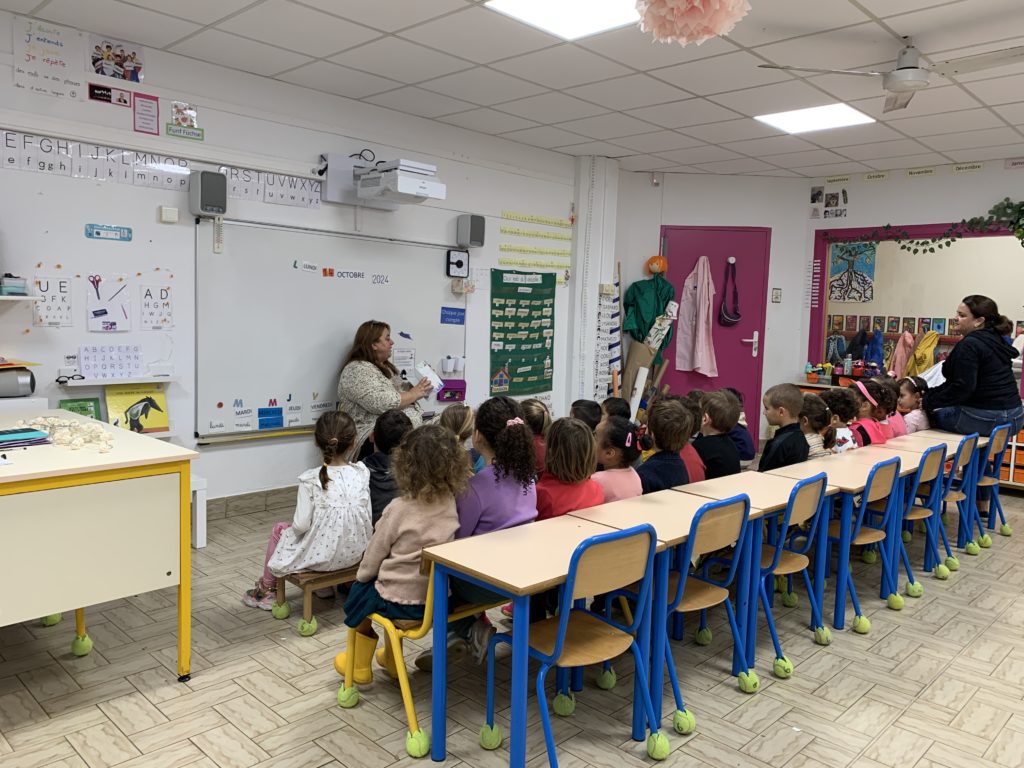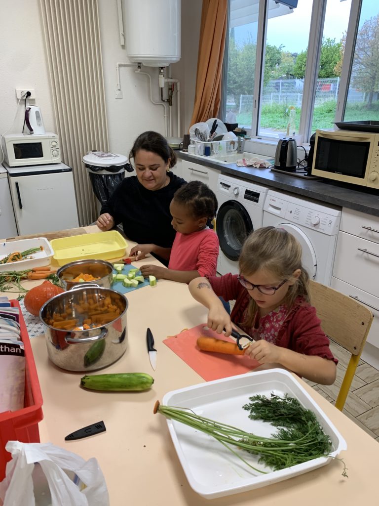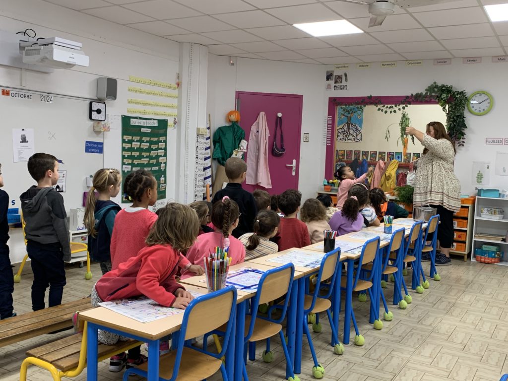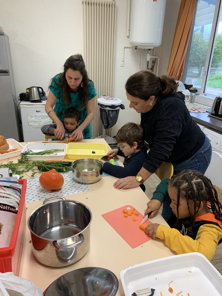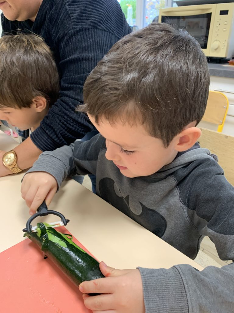 Je suis allée dans la classe d’Odile faire de la soupe avec les enfants ce matin. Maîtresse Valérie a révélé l’activité et les légumes, puis les enfants ont chacun leur tour épluché ou coupé quelques morceaux de carottes, courgette ou diverses courges.