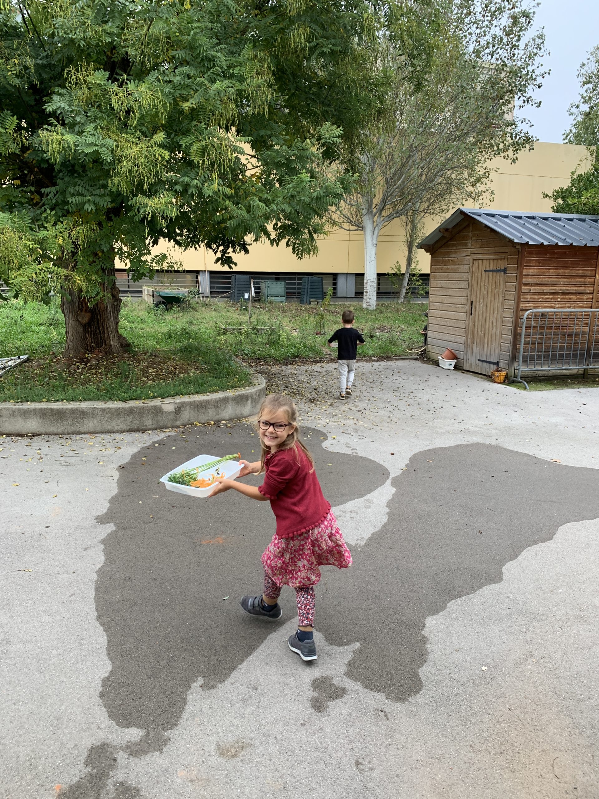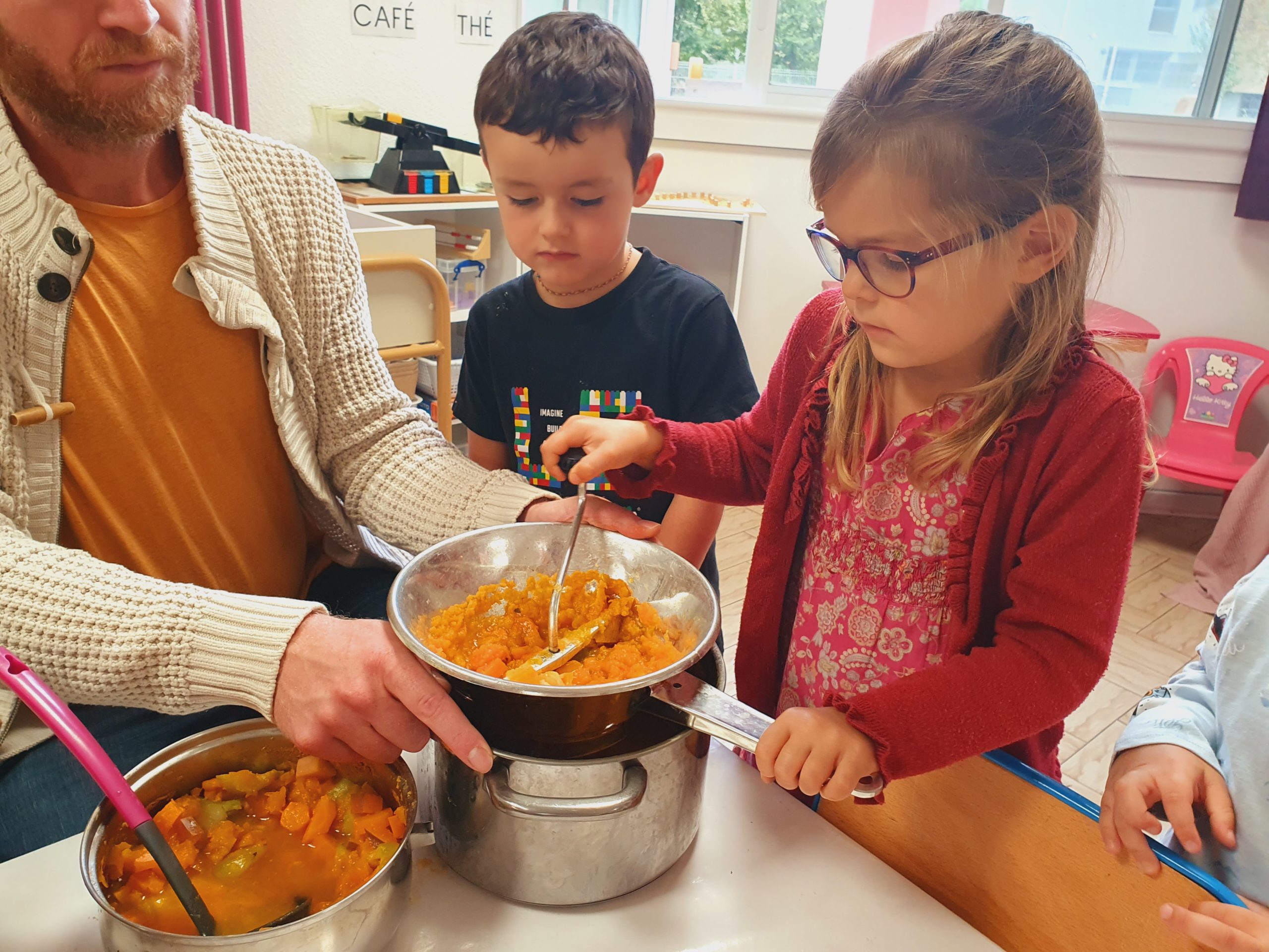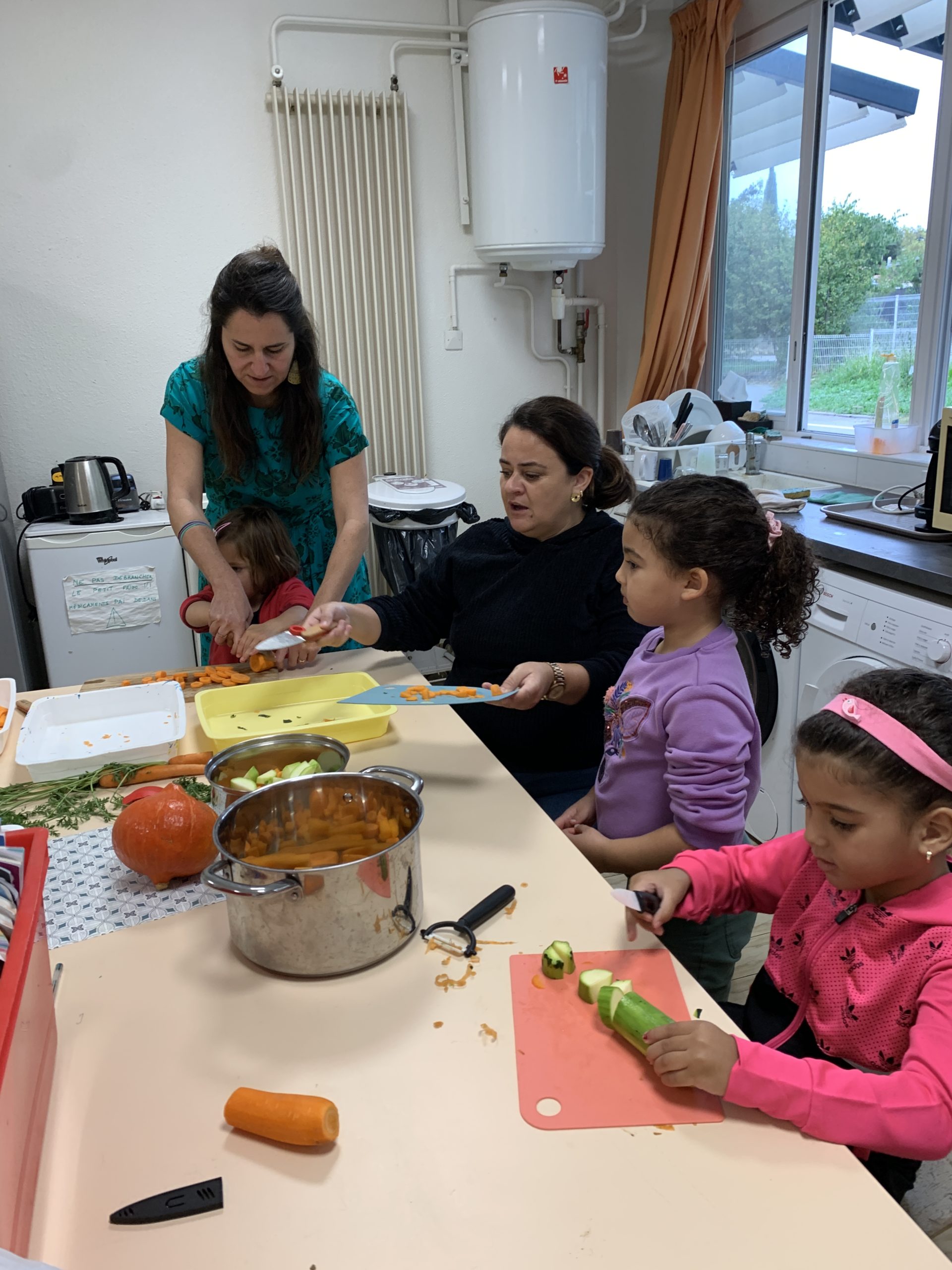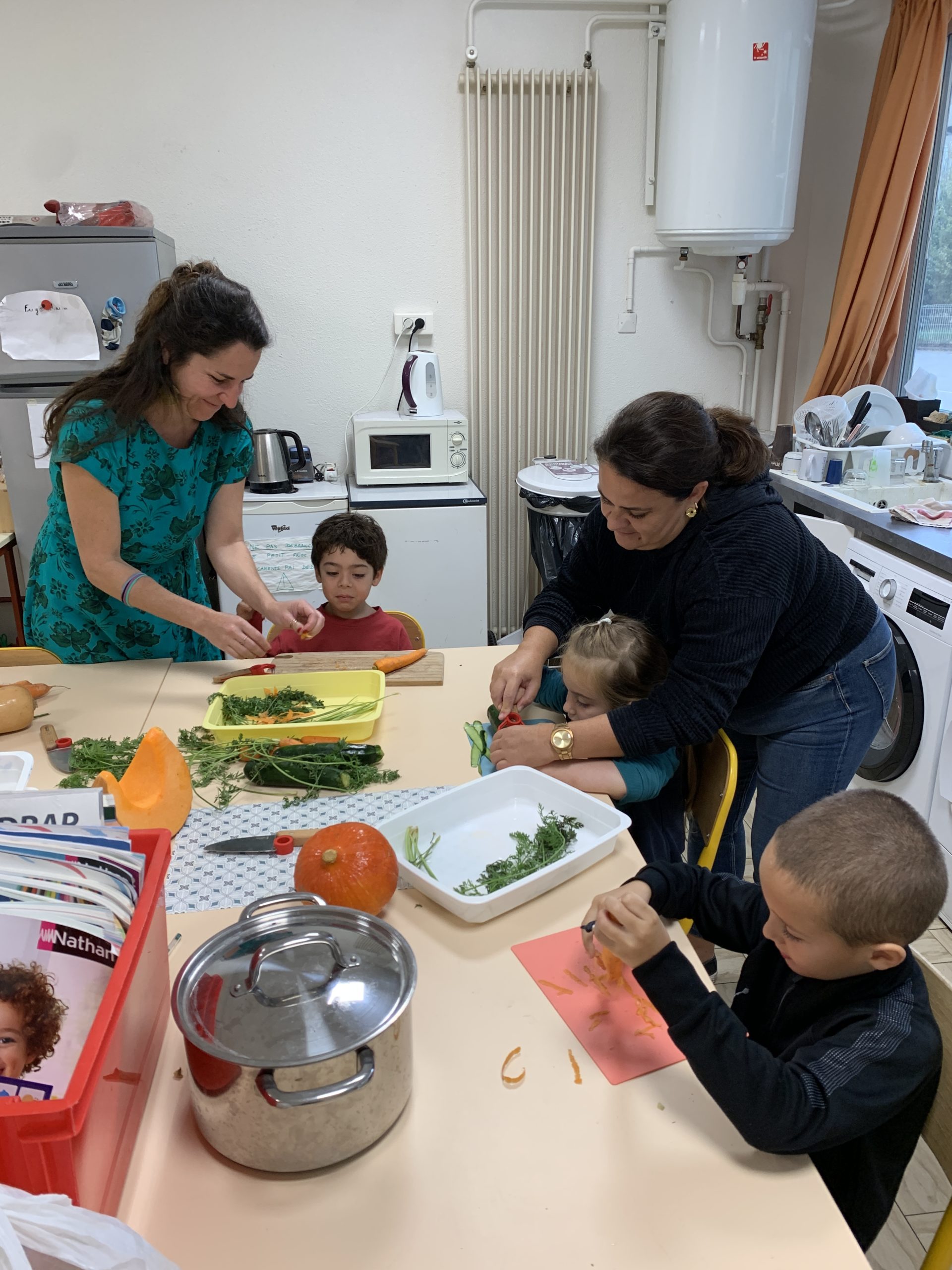 Je suis allée dans la classe d’Odile faire de la soupe avec les enfants ce matin. Maîtresse Valérie a révélé l’activité et les légumes, puis les enfants ont chacun leur tour épluché ou coupé quelques morceaux de carottes, courgette ou diverses courges.