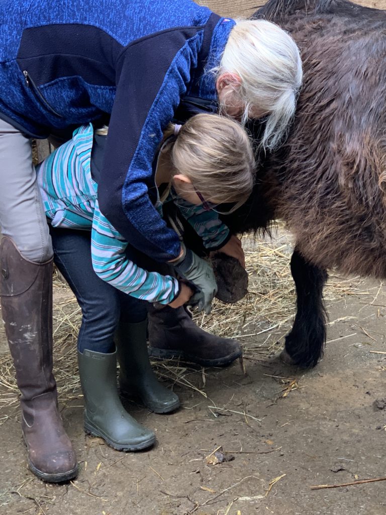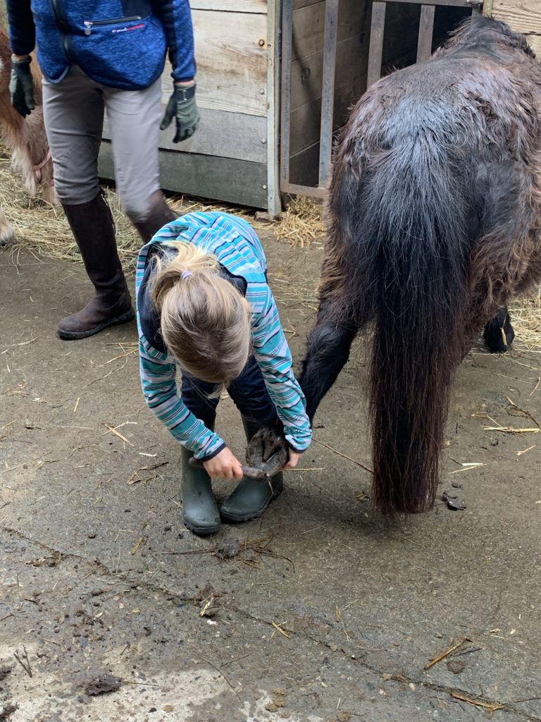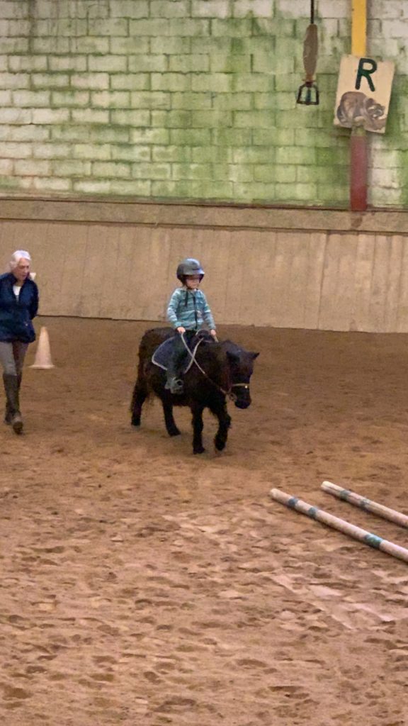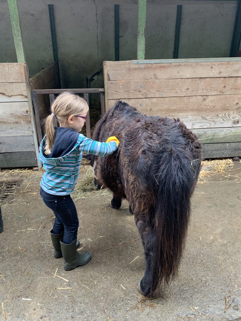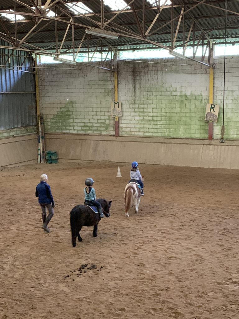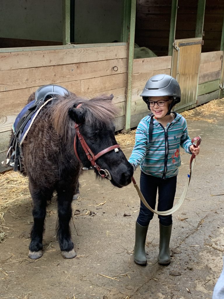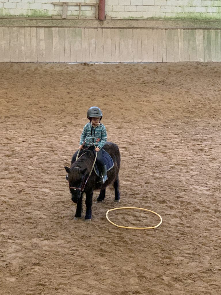 Odile a fait une heure de cours de poney (son cadeau d’anniversaire de Grand-papa et Grand-maman), et elle a adoré ! Elle a commencé par préparer son poney Opale : elle l’a brossé, a curé ses sabots, et a installé la selle. Puis elle l’a mené jusqu’au manège, et a appris à le diriger, à le faire démarrer et à l’arrêter. Elle a même réussi à trotter !
