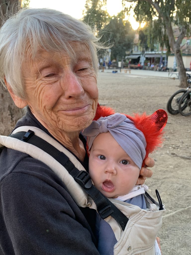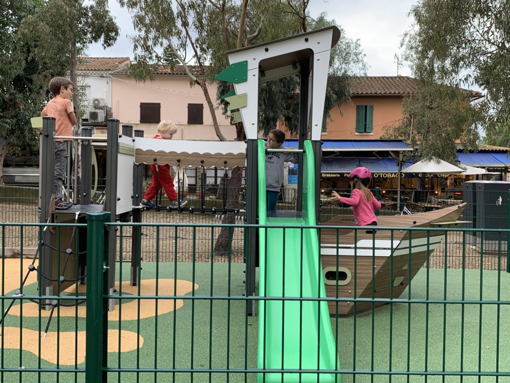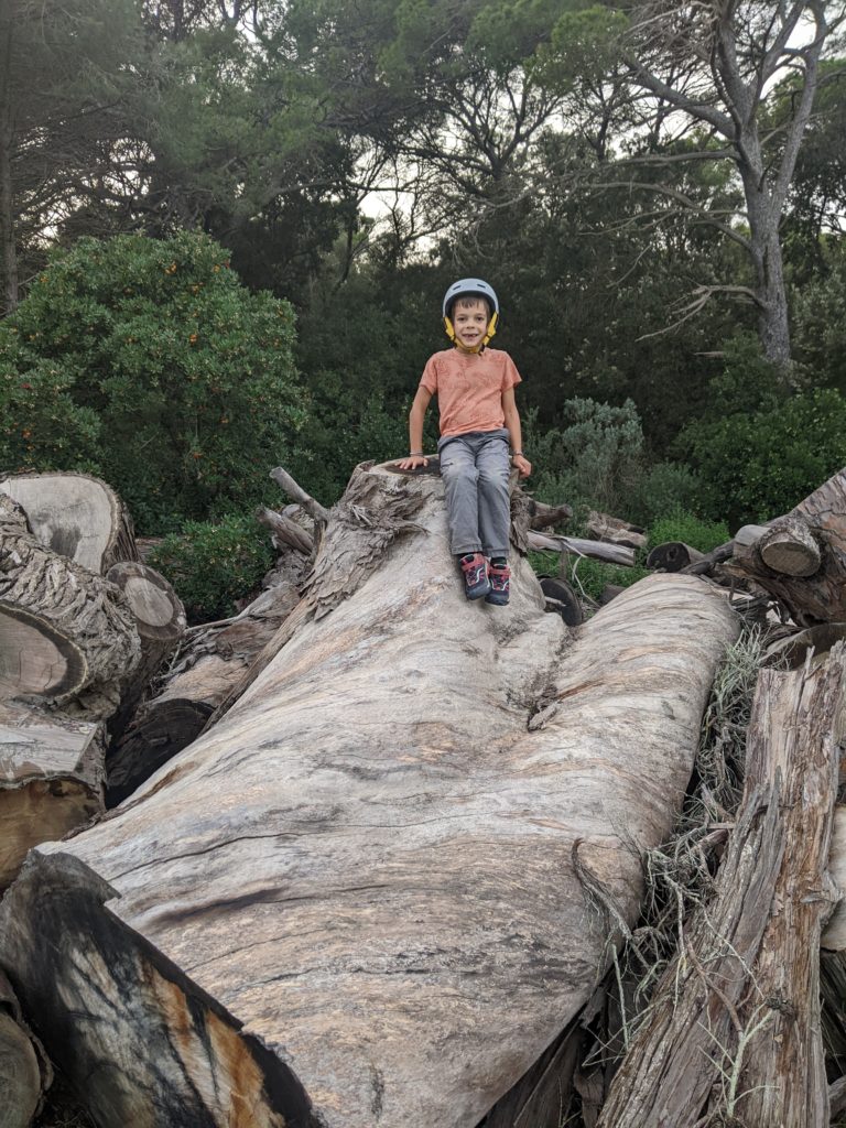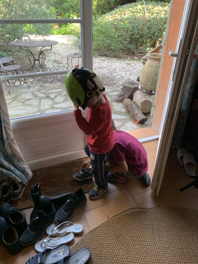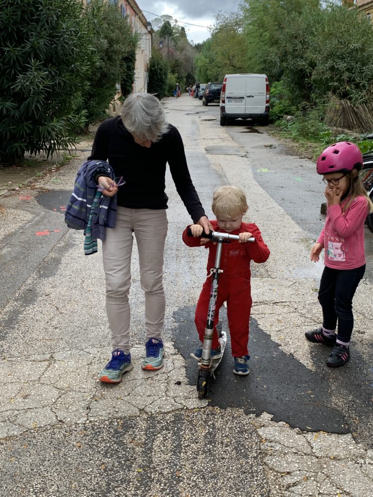 À peine arrivés, Odile trouve déjà une trottinette sur le banc des merveilles 😉 Que Théodore s’empresse d’essayer également.