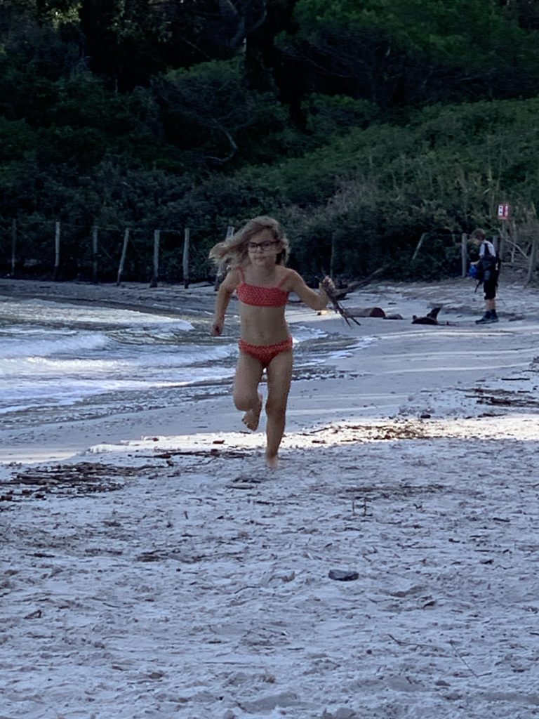 Mardi nous sommes allés jusqu’à la plage Notre-Dame ! Tess & Léonard, Grand-Maman et moi avons marché, les autres ont pédalé (Théodore sur le vélo de son papa). Je suis rentrée épuisée par cette balade, mais c’était une journée magnifique, et tout le monde a bien profité, malgré les méduses… Agathe a fait son premier cours de plongée le soir, et maman l’a accompagnée. Nous avons fêté l’anniversaire de Théodore le soir et fini la soirée devant le feu avec des châtaignes d’Aveyron.