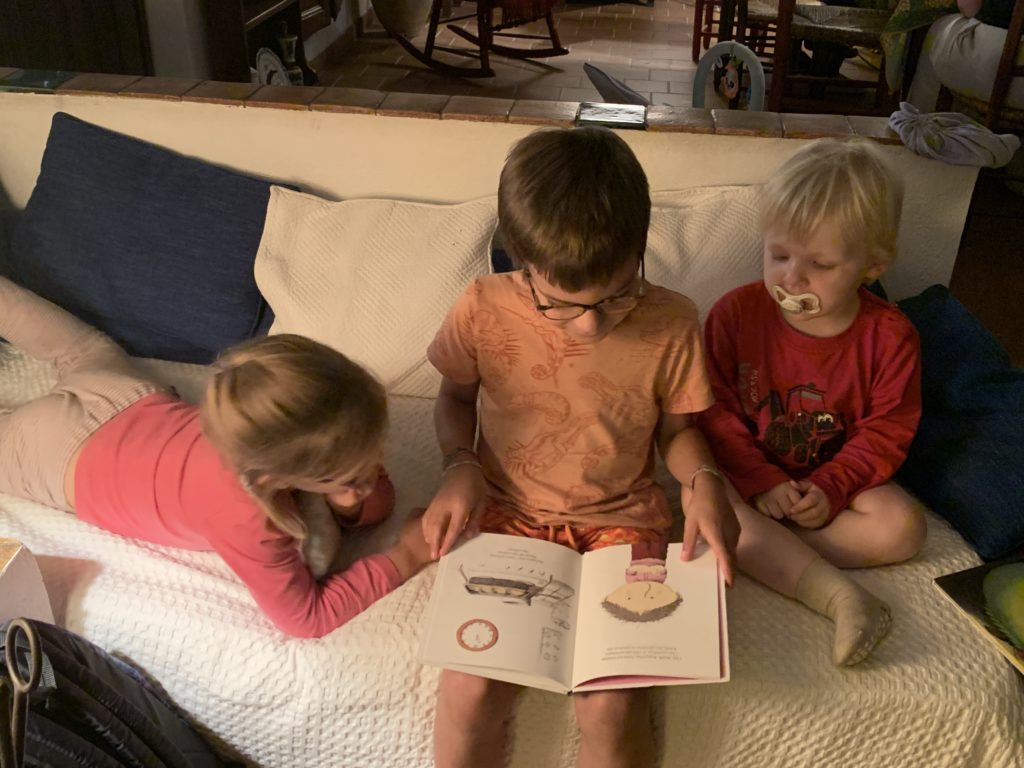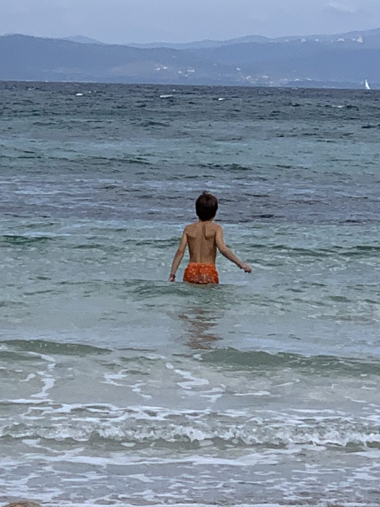 Vendredi, journée d’été à la plage du Langoustier. Lucie et Émile ont pédalé, Odile n’était pas en forme et Thomas l’a prise sur son vélo, tandis que Théodore était sur le vélo d’Arthur. Je suis restée à la maison, je ne me suis pas sentie de marcher autant. Victor est reparti aujourd’hui.