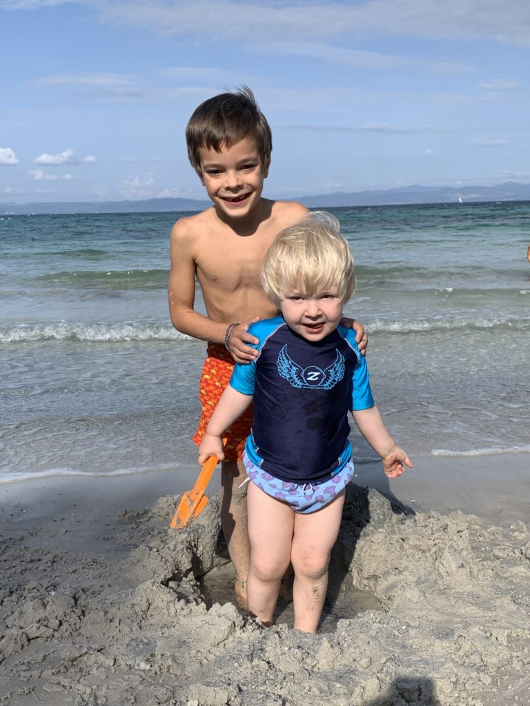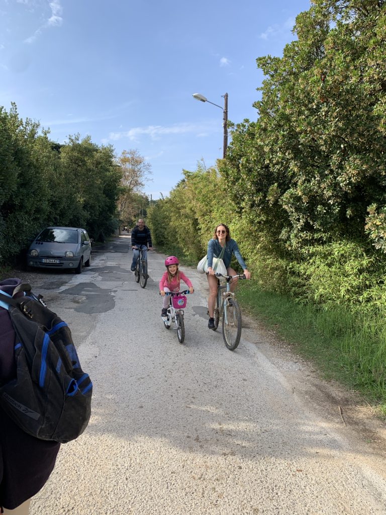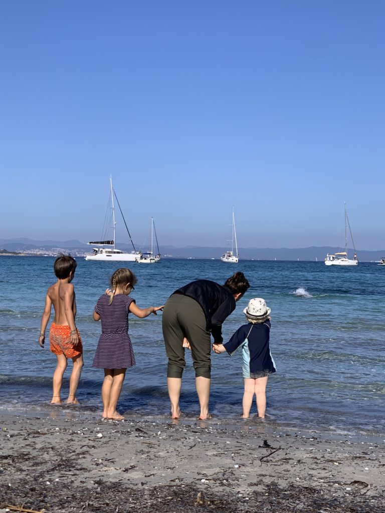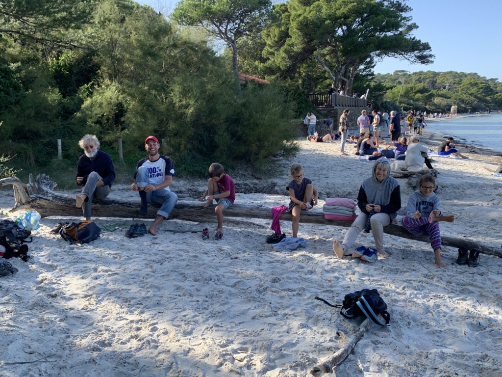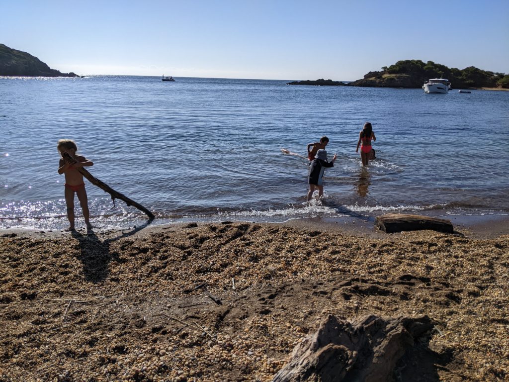 Premier jour à la plage d’argent. Lucie, Émile et Odile sont ravis d’y aller à vélo, Théodore n’est pas très emballé par la draisienne, et Arthur l’a finalement portée sur tout le chemin. Agathe nous a rejoint en cours de journée.