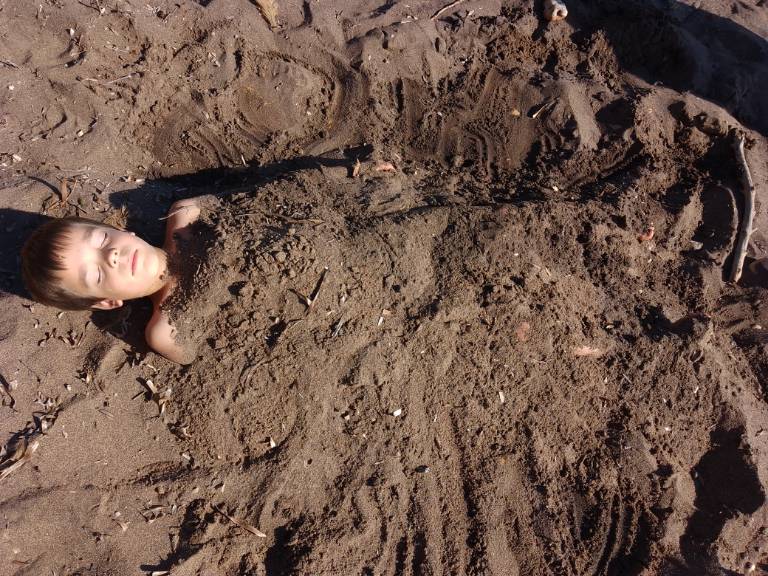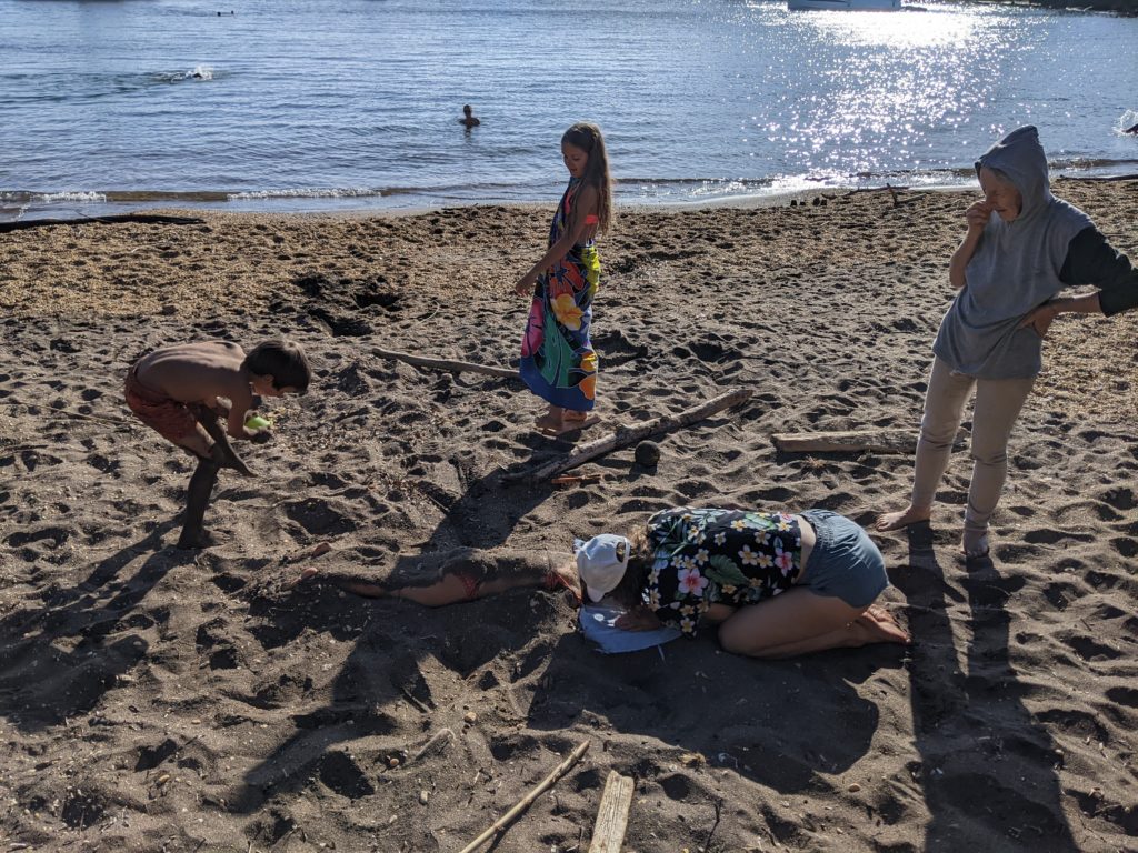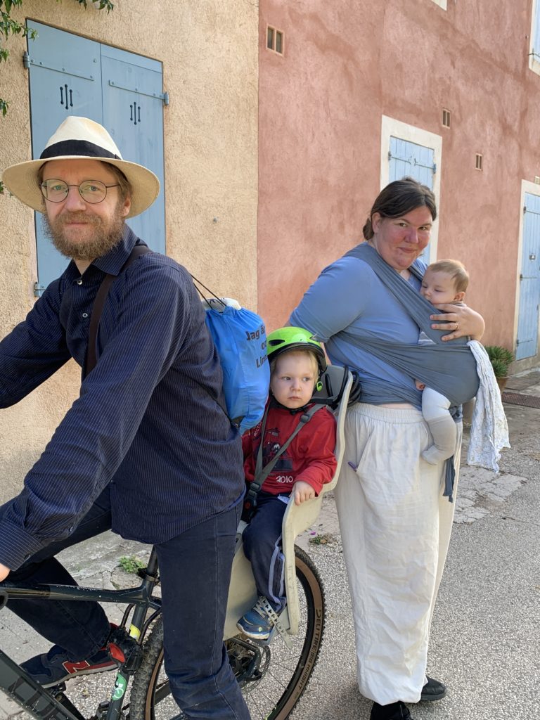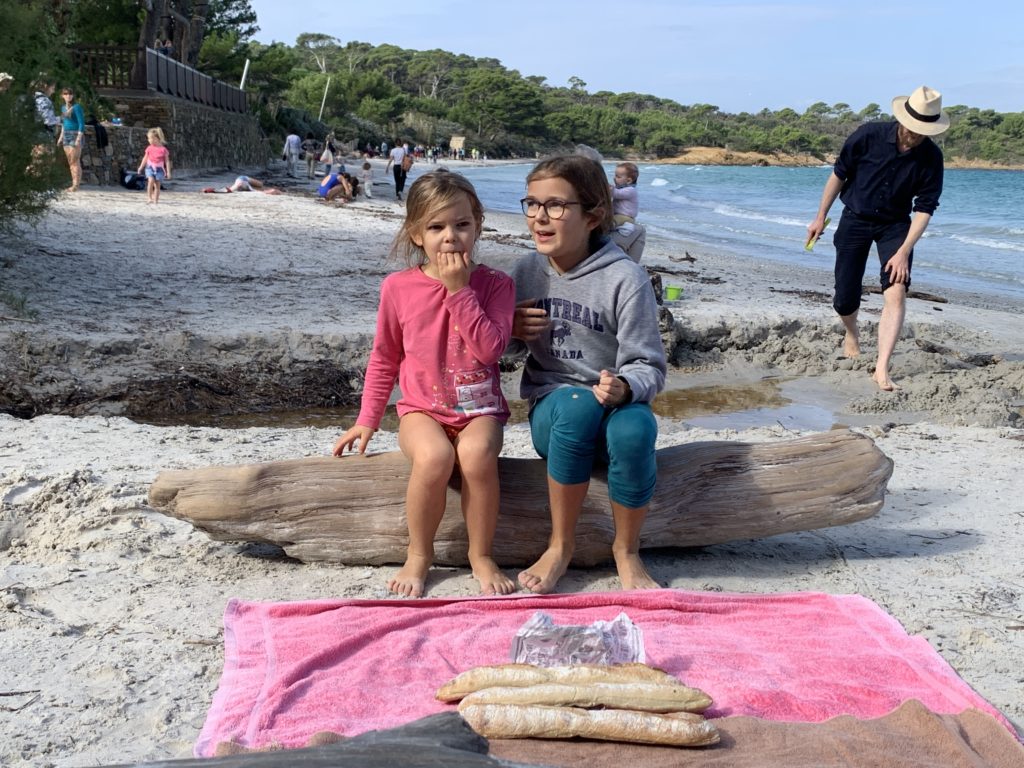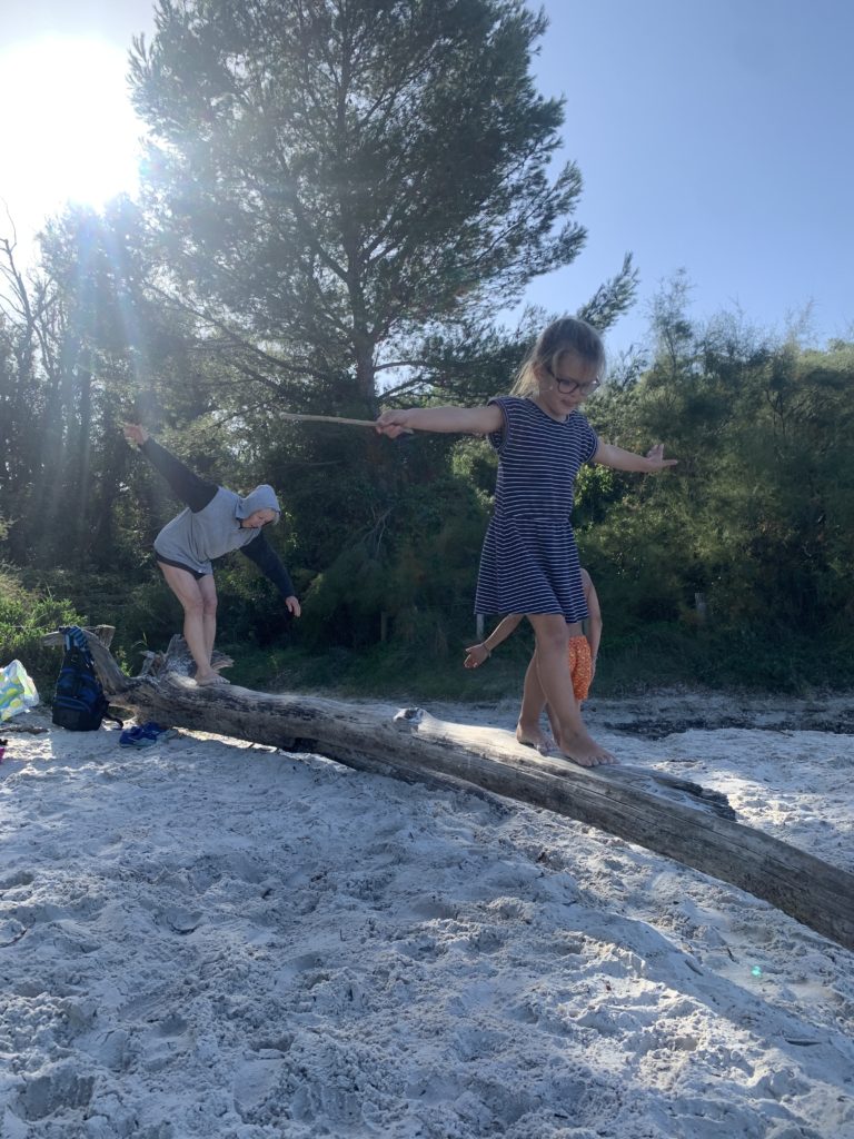 Premier jour à la plage d’argent. Lucie, Émile et Odile sont ravis d’y aller à vélo, Théodore n’est pas très emballé par la draisienne, et Arthur l’a finalement portée sur tout le chemin. Agathe nous a rejoint en cours de journée.