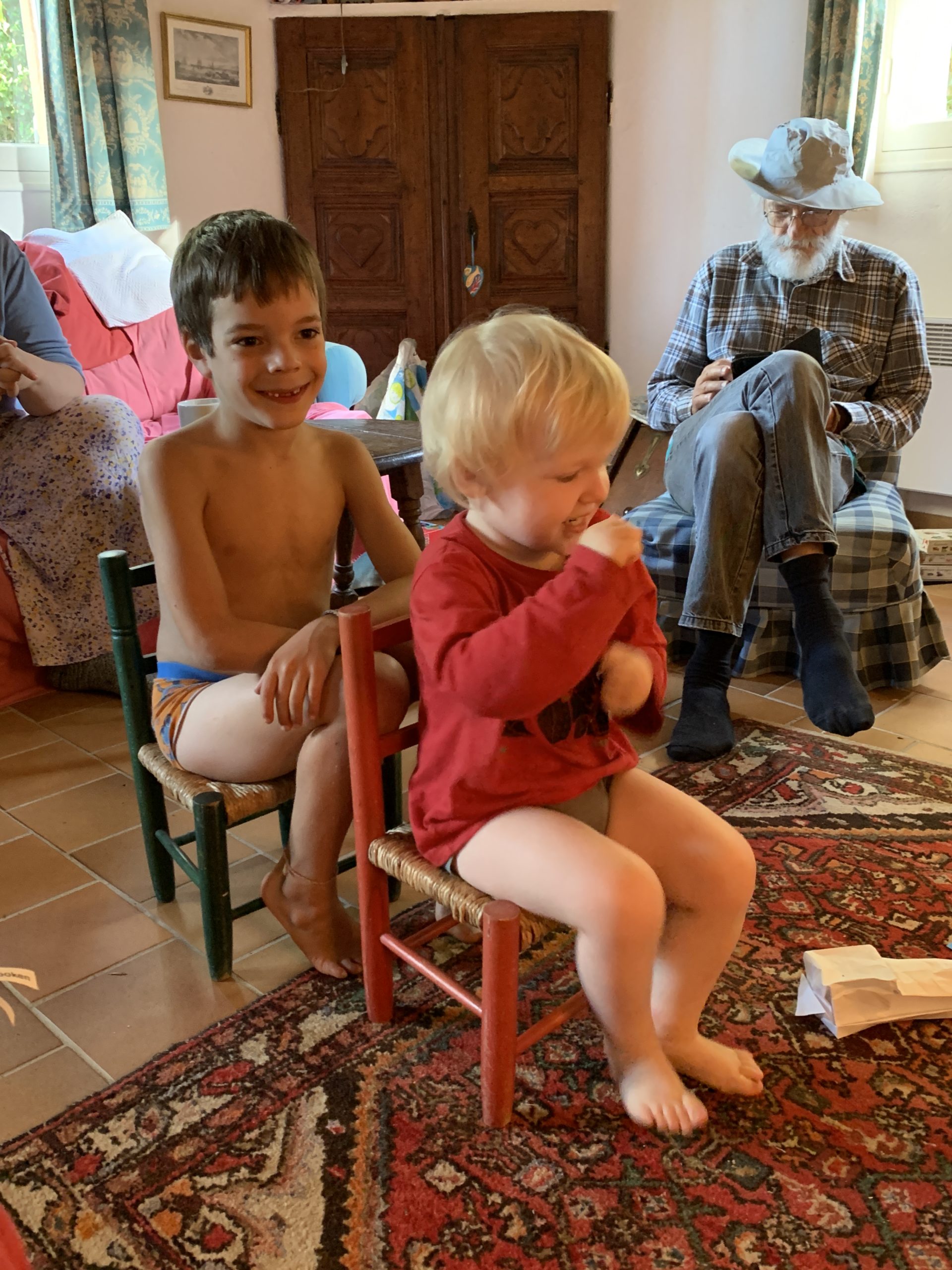 Mardi nous sommes allés jusqu’à la plage Notre-Dame ! Tess & Léonard, Grand-Maman et moi avons marché, les autres ont pédalé (Théodore sur le vélo de son papa). Je suis rentrée épuisée par cette balade, mais c’était une journée magnifique, et tout le monde a bien profité, malgré les méduses… Agathe a fait son premier cours de plongée le soir, et maman l’a accompagnée. Nous avons fêté l’anniversaire de Théodore le soir et fini la soirée devant le feu avec des châtaignes d’Aveyron.