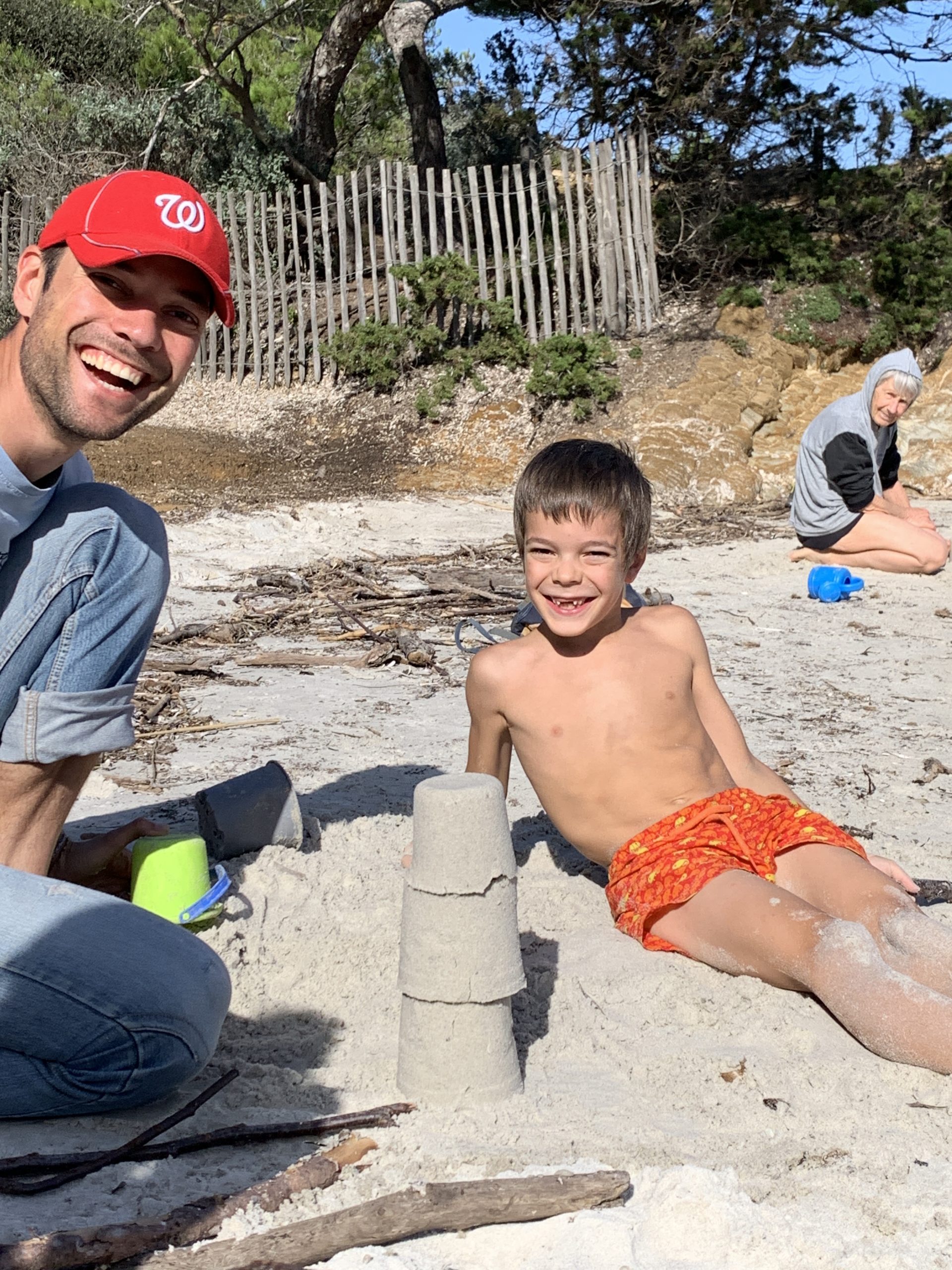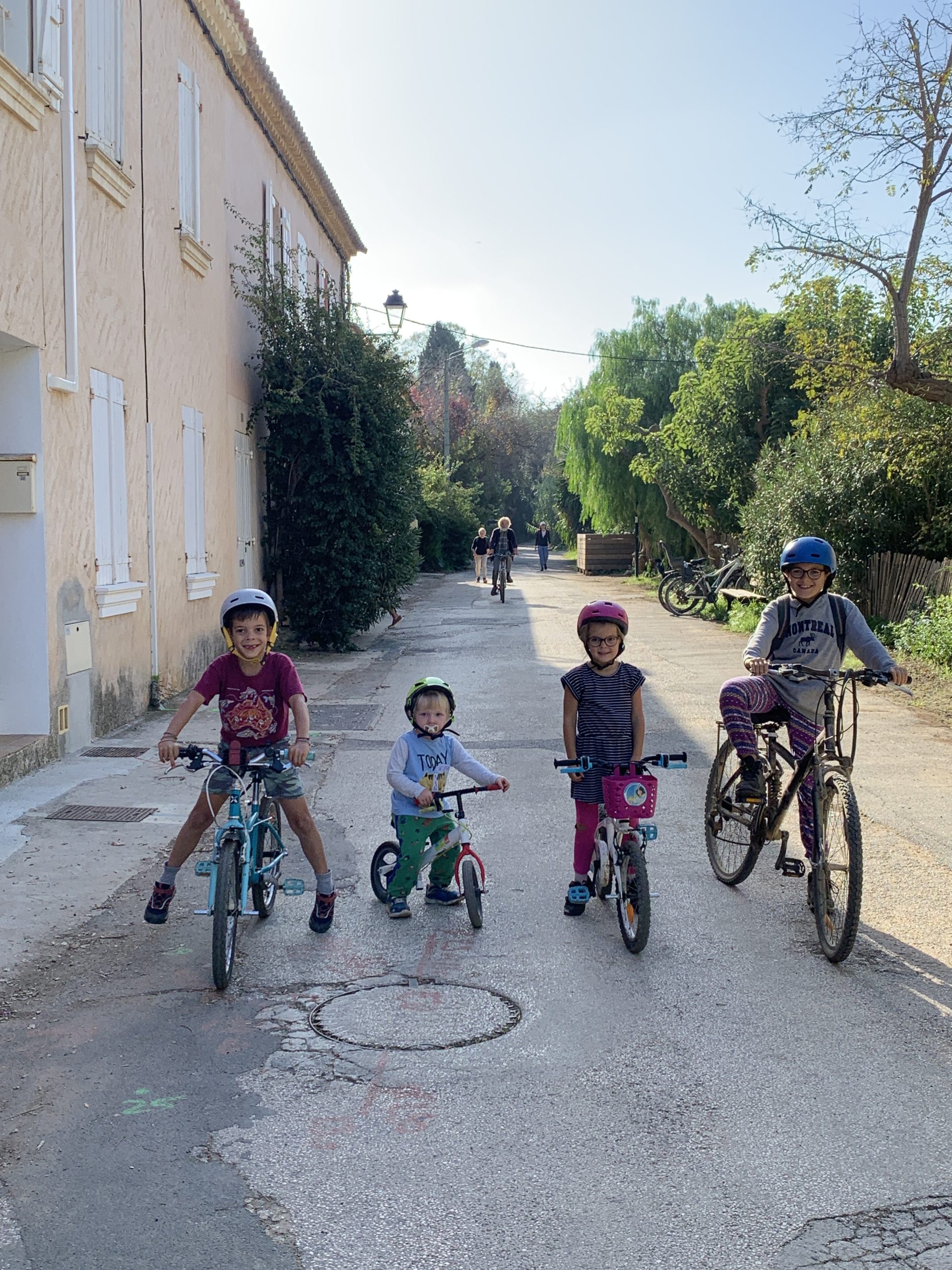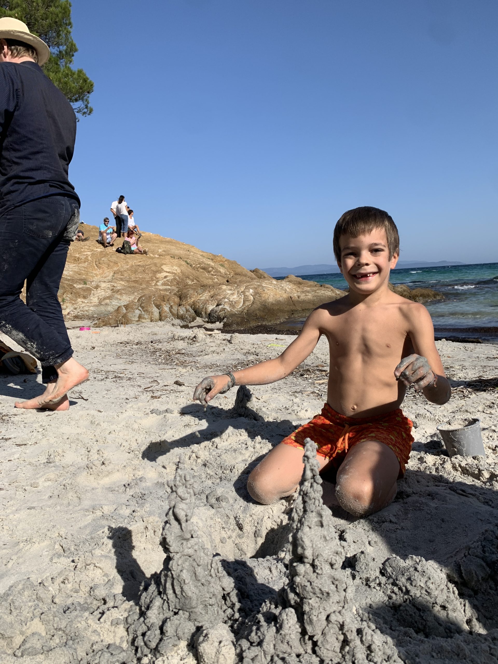 Premier jour à la plage d’argent. Lucie, Émile et Odile sont ravis d’y aller à vélo, Théodore n’est pas très emballé par la draisienne, et Arthur l’a finalement portée sur tout le chemin. Agathe nous a rejoint en cours de journée.