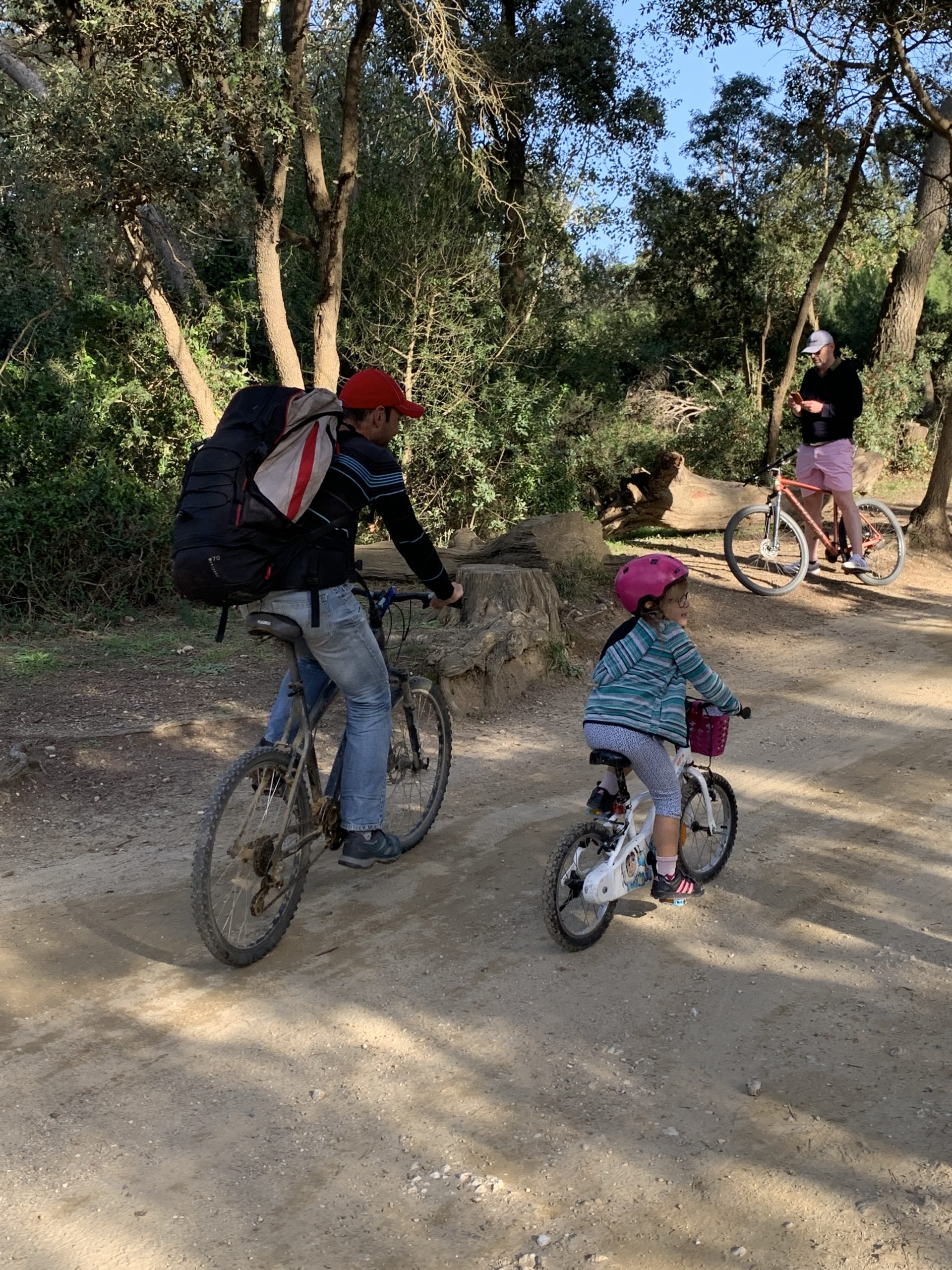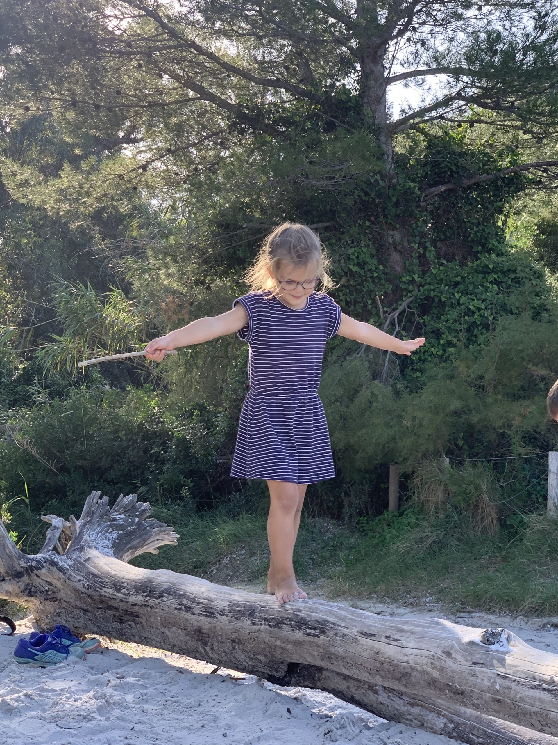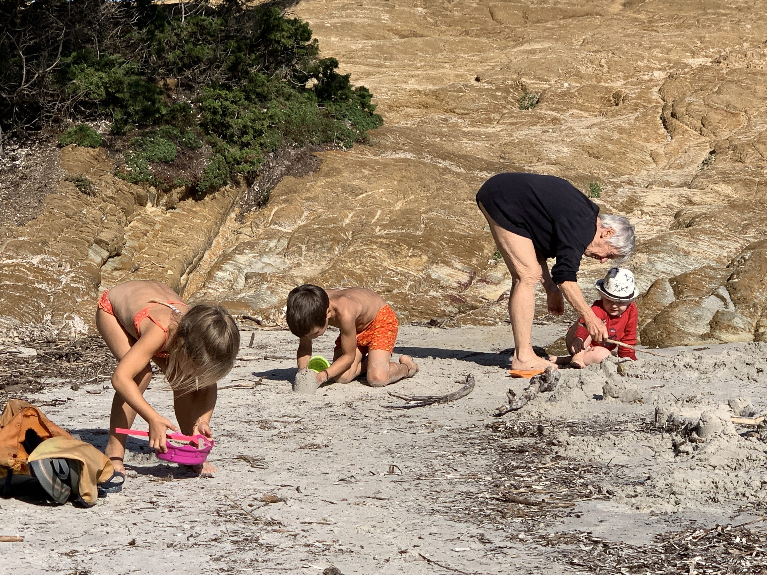 Premier jour à la plage d’argent. Lucie, Émile et Odile sont ravis d’y aller à vélo, Théodore n’est pas très emballé par la draisienne, et Arthur l’a finalement portée sur tout le chemin. Agathe nous a rejoint en cours de journée.